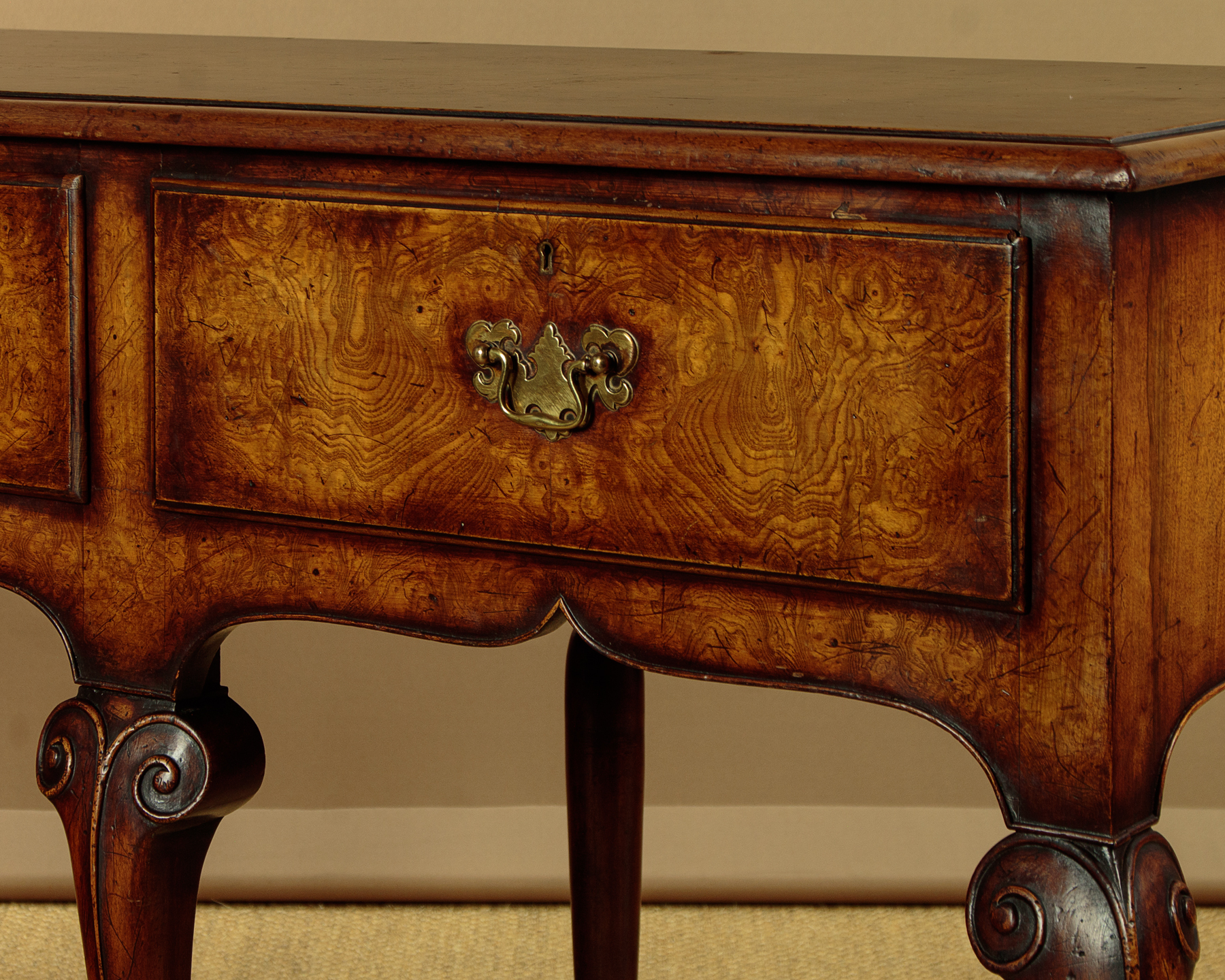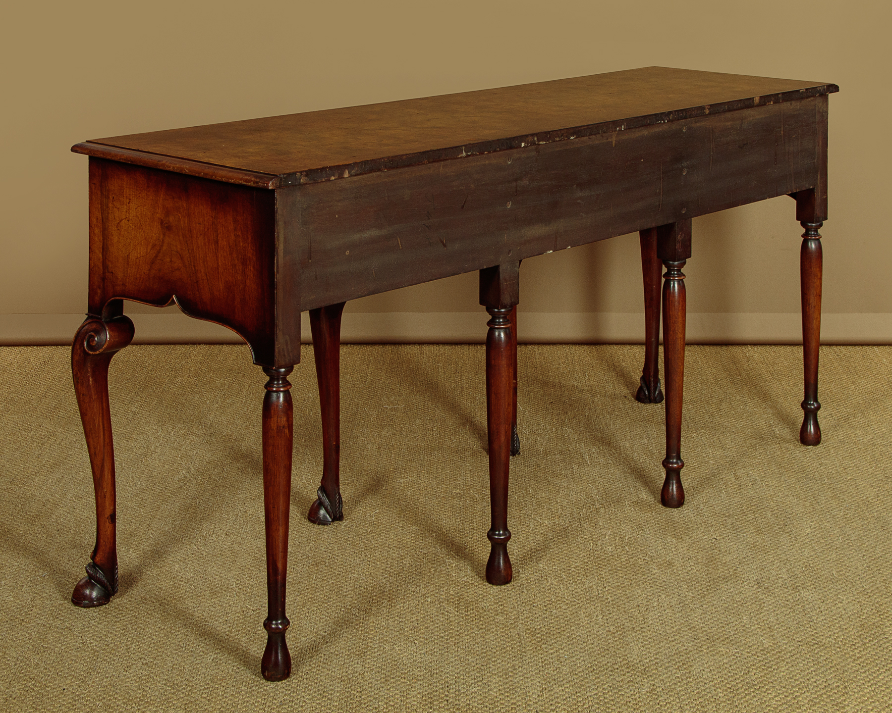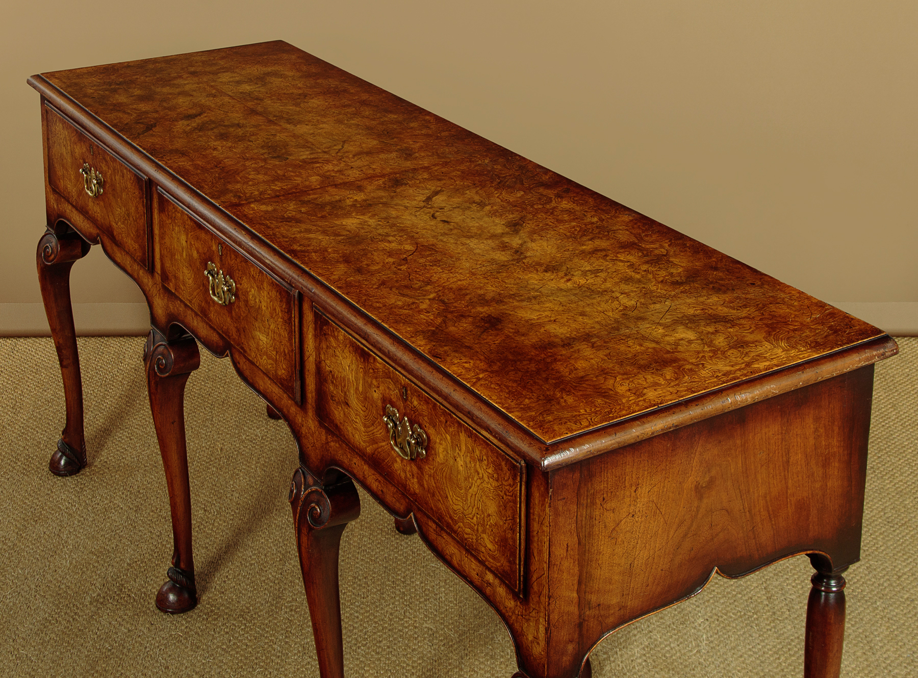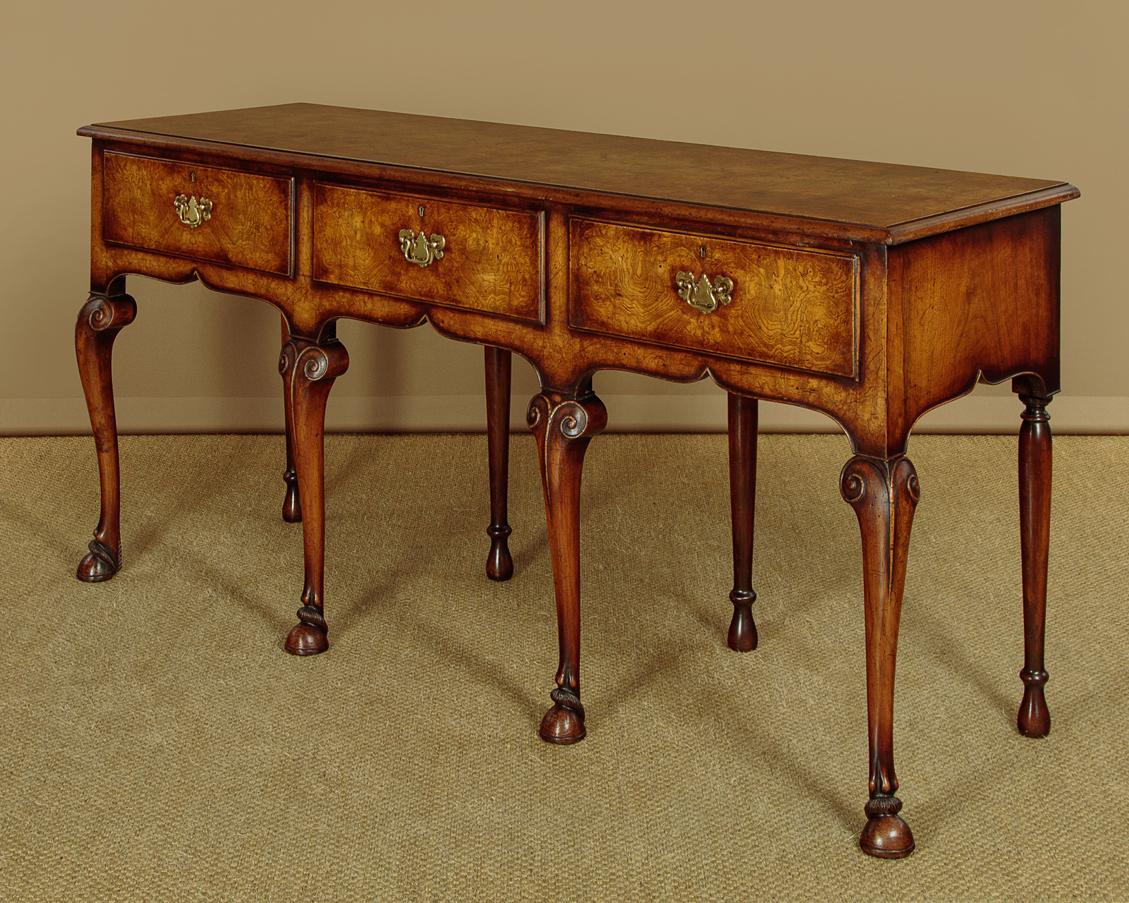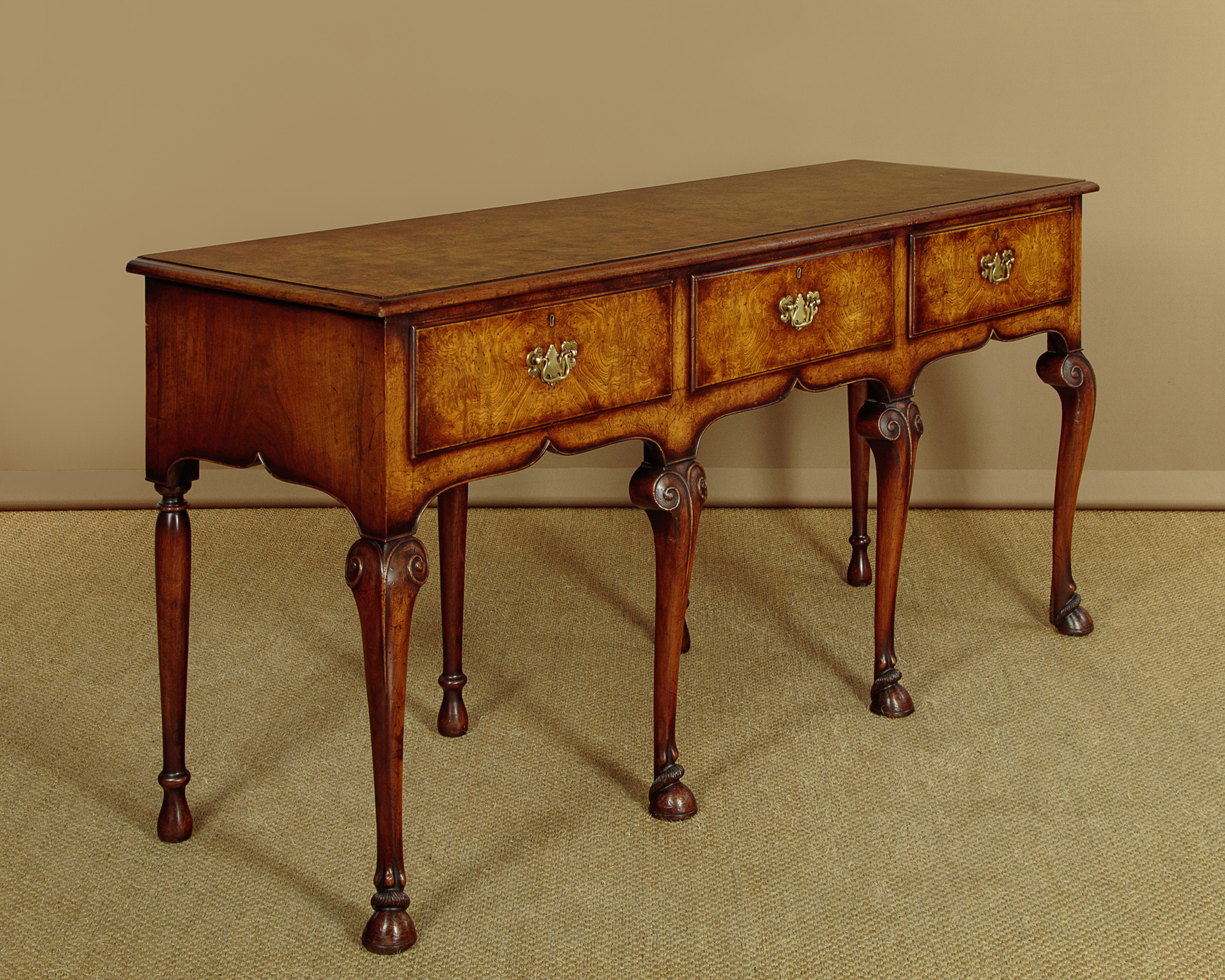 Unusual 18th.c. style dresser base or side table c.1960. Top veneered in highly figured and symmetrically arranged burr elm with a deep moulded edge. Burr elm front with three drawers, note how the grain is matched across the drawer fronts, with Georgian pattern brass handles. Oak drawer linings. Very attractive ogee arch shaped apron with a cockbeaded edge below the drawers and continued at the sides. Raised on superb George II style cabriole front legs in walnut with splendid carved hoof feet. Turned and tapering legs to the back edge. Some old wear and scratches to the top. Otherwise excellent colour and condition, cleaned and waxed in our workshops.