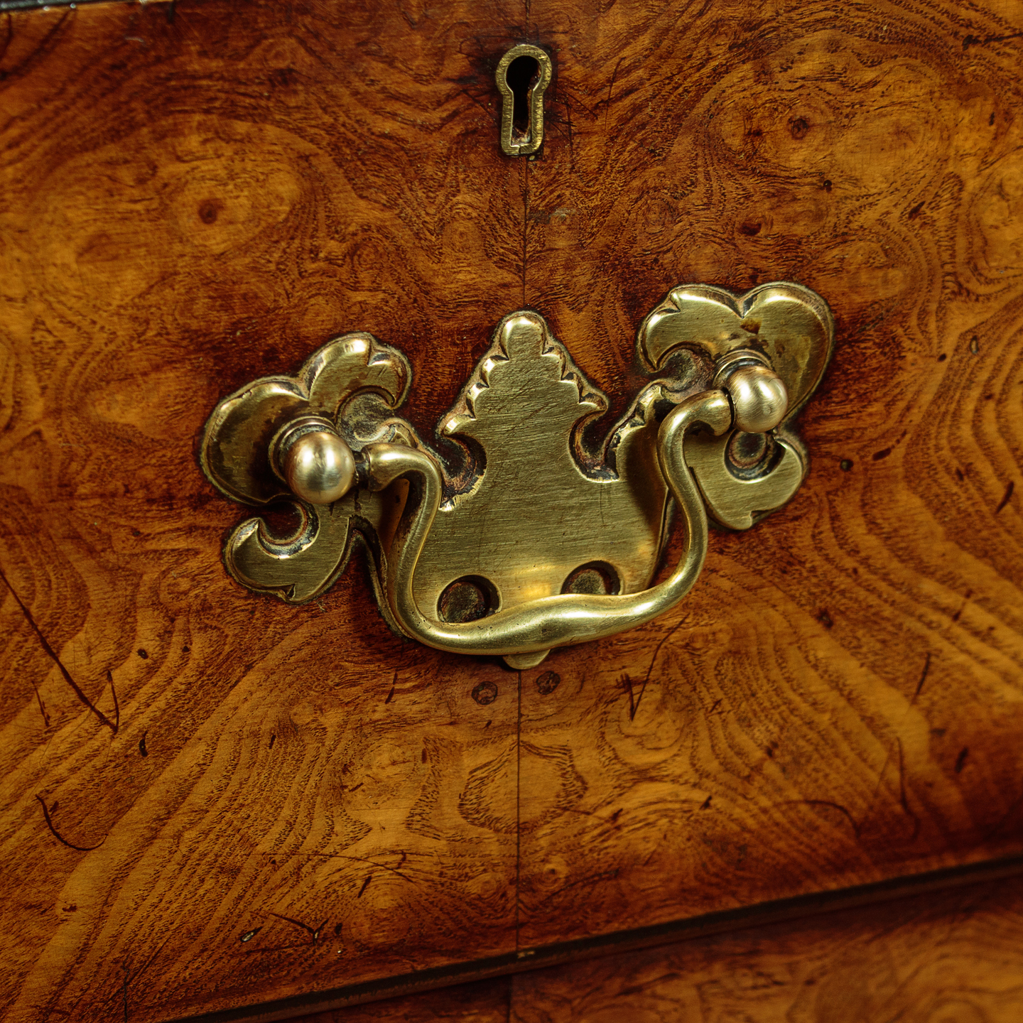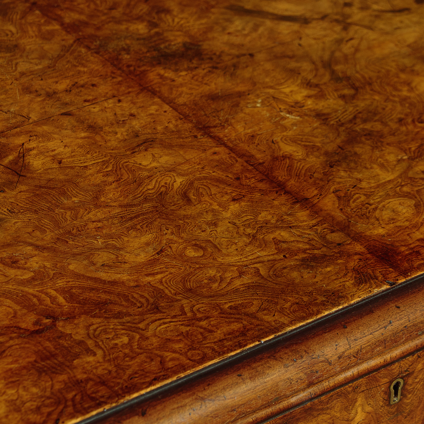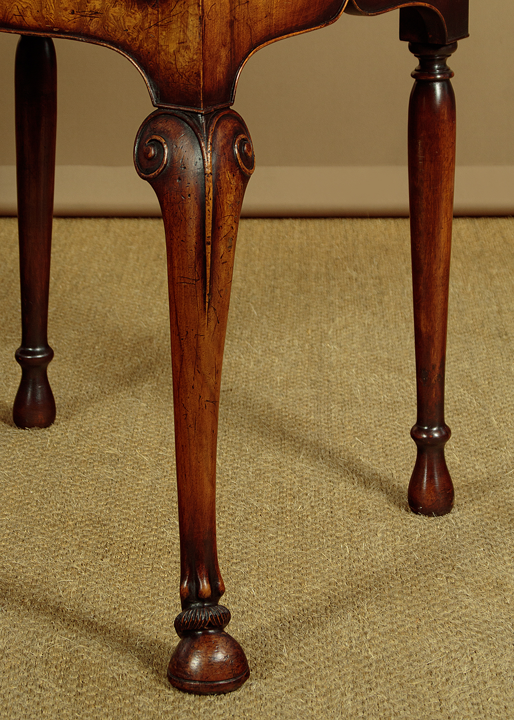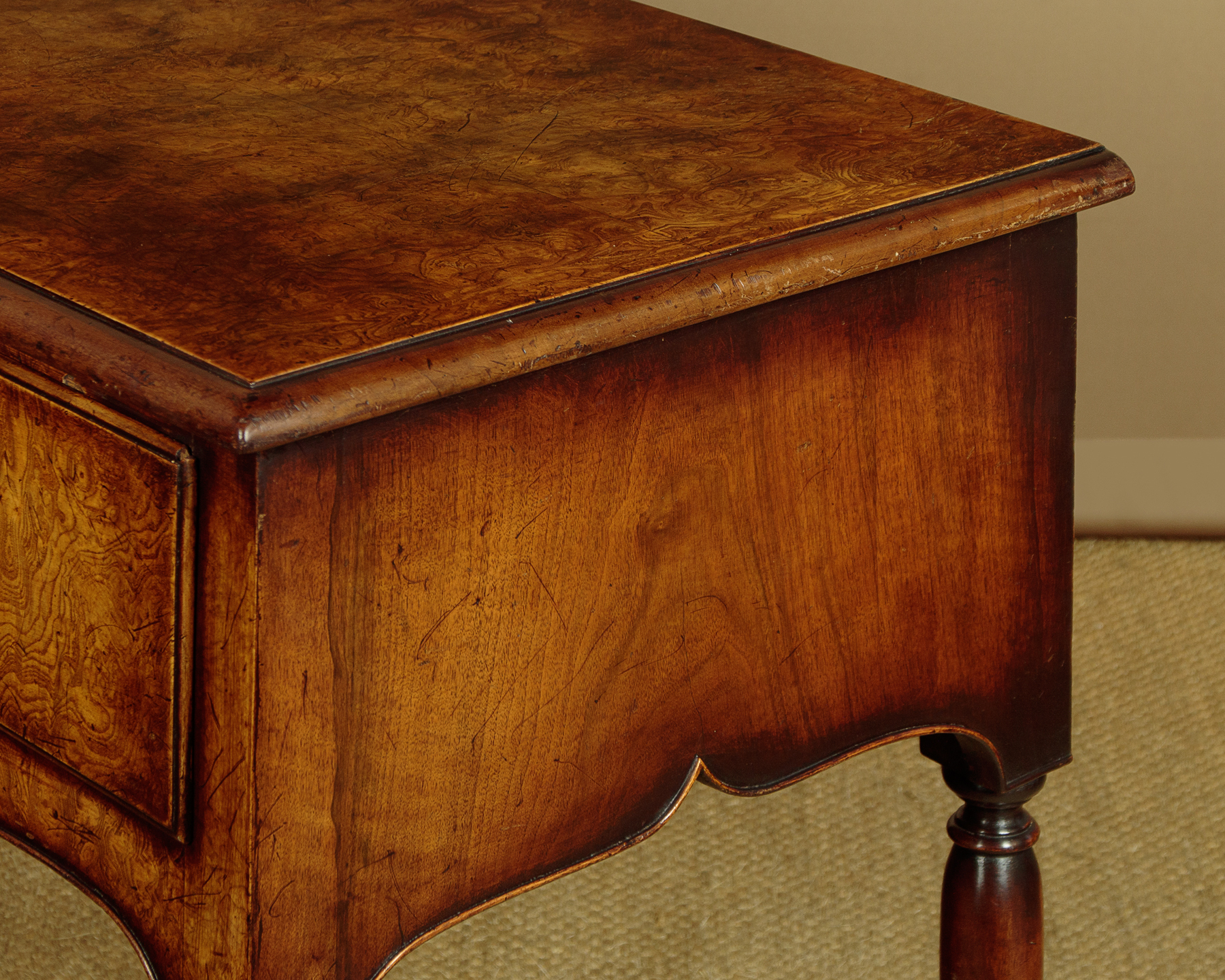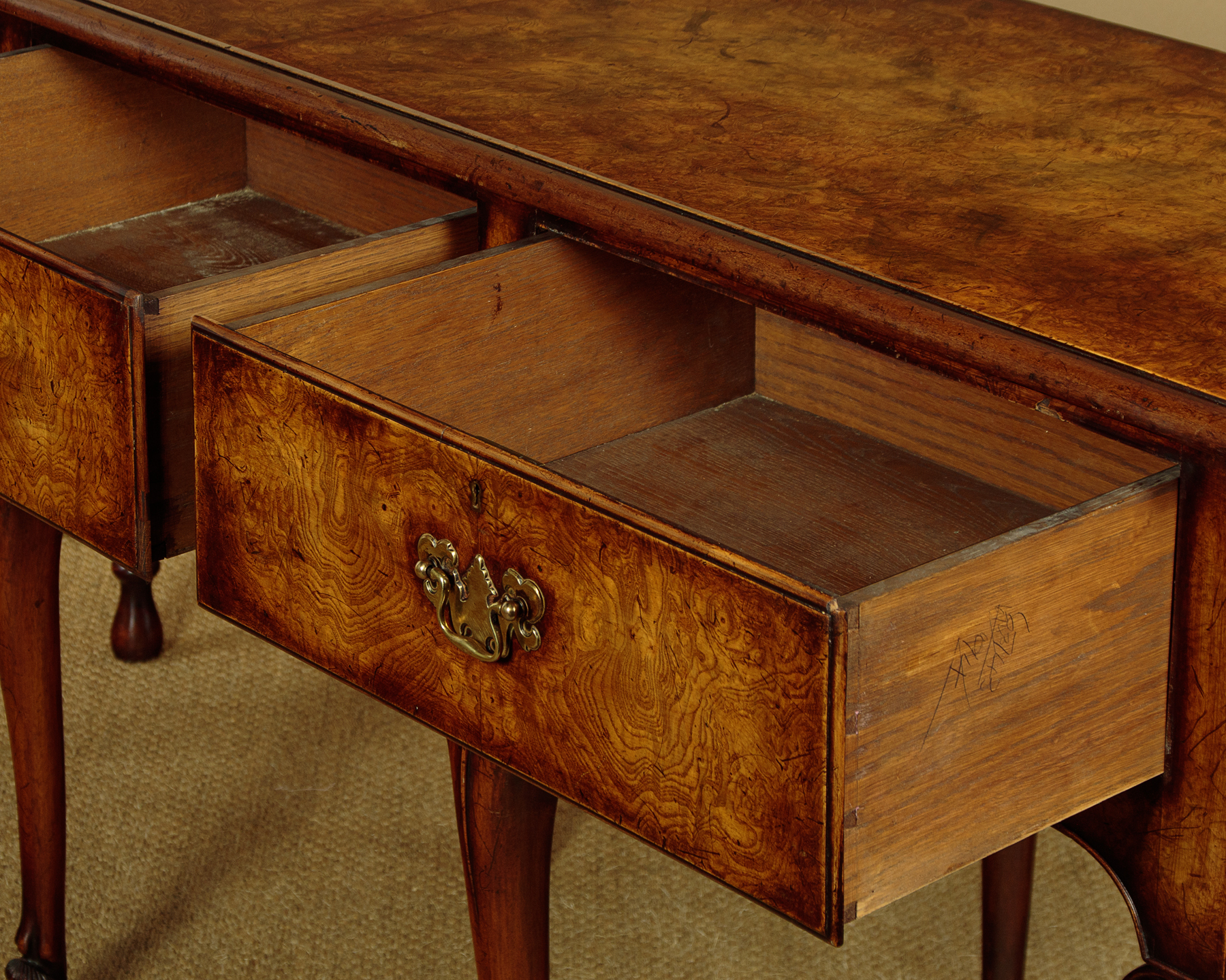 Unusual 18th.c. style dresser base or side table c.1960. Top veneered in highly figured and symmetrically arranged burr elm with a deep moulded edge. Burr elm front with three drawers, note how the grain is matched across the drawer fronts, with Georgian pattern brass handles. Oak drawer linings. Very attractive ogee arch shaped apron with a cockbeaded edge below the drawers and continued at the sides. Raised on superb George II style cabriole front legs in walnut with splendid carved hoof feet. Turned and tapering legs to the back edge. Some old wear and scratches to the top. Otherwise excellent colour and condition, cleaned and waxed in our workshops.