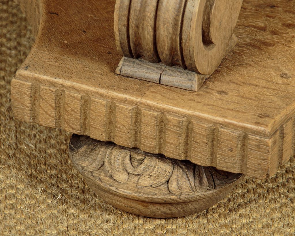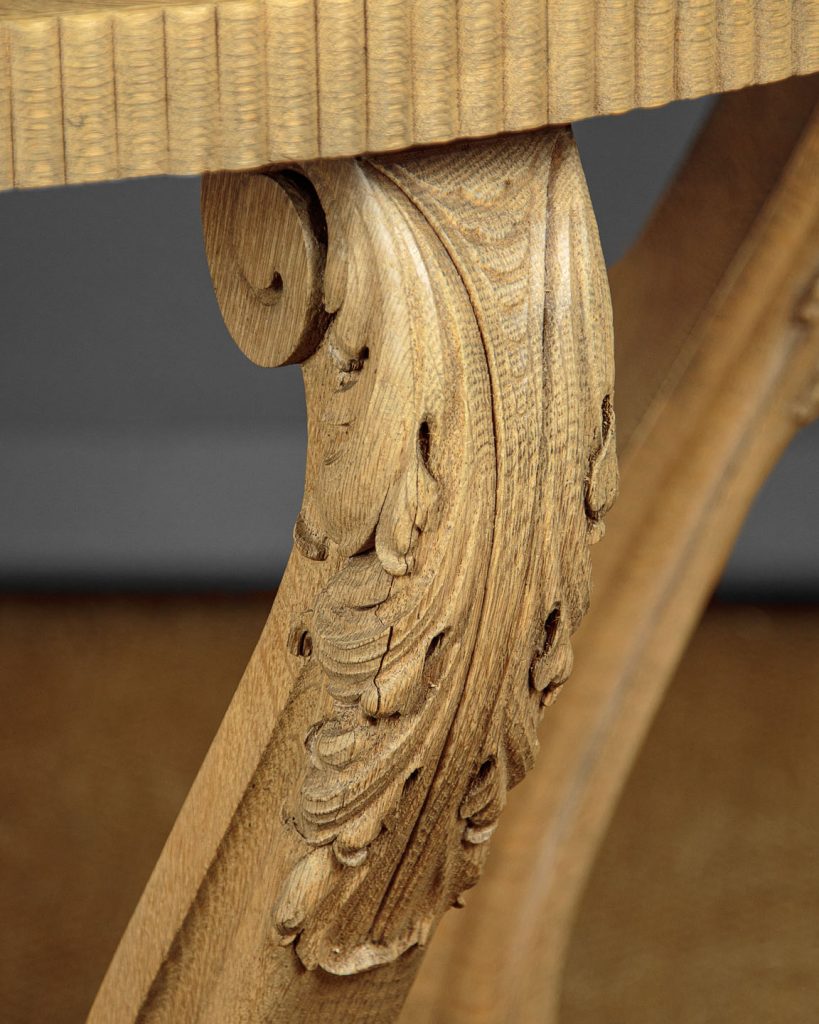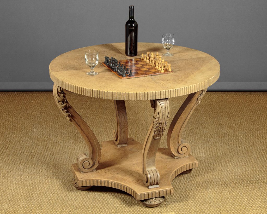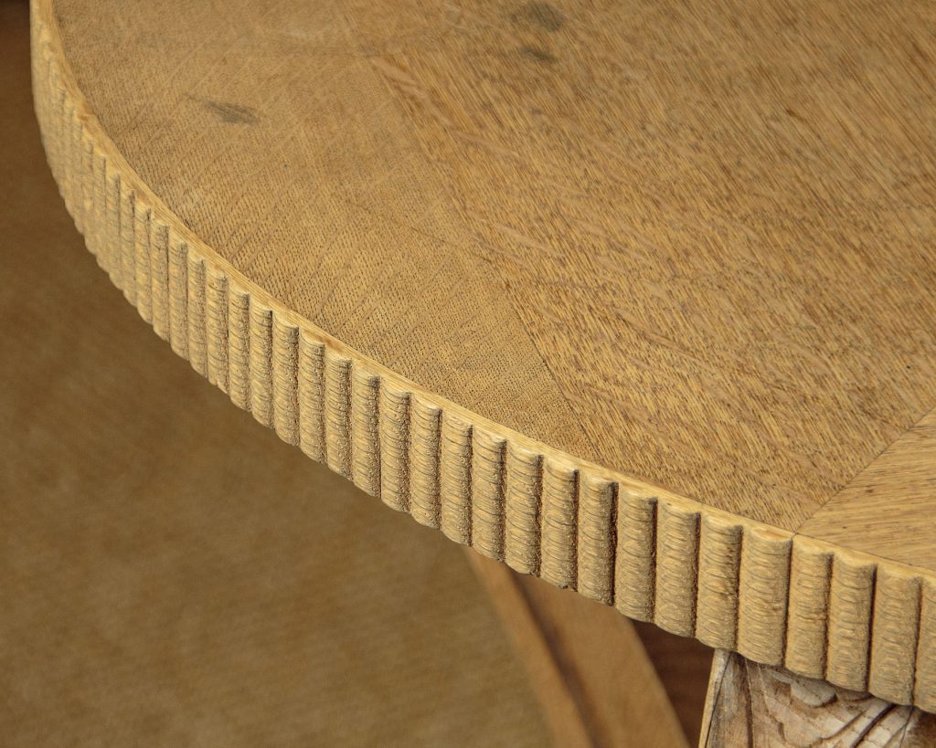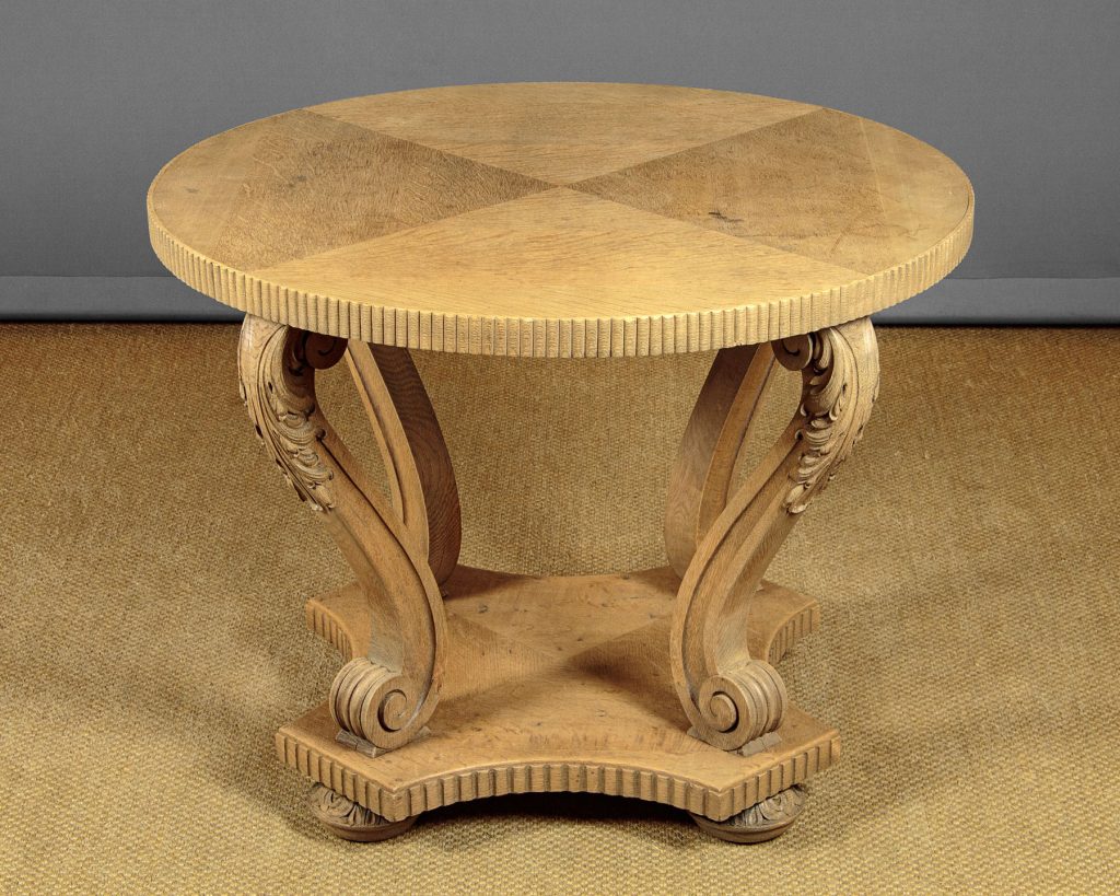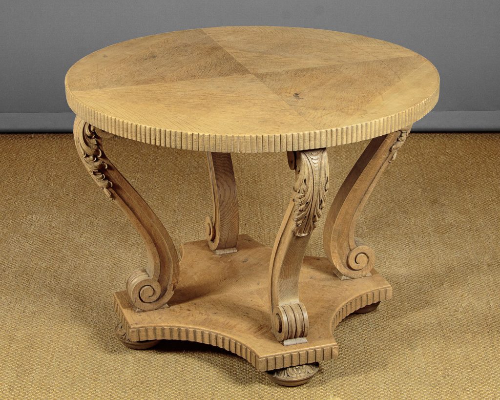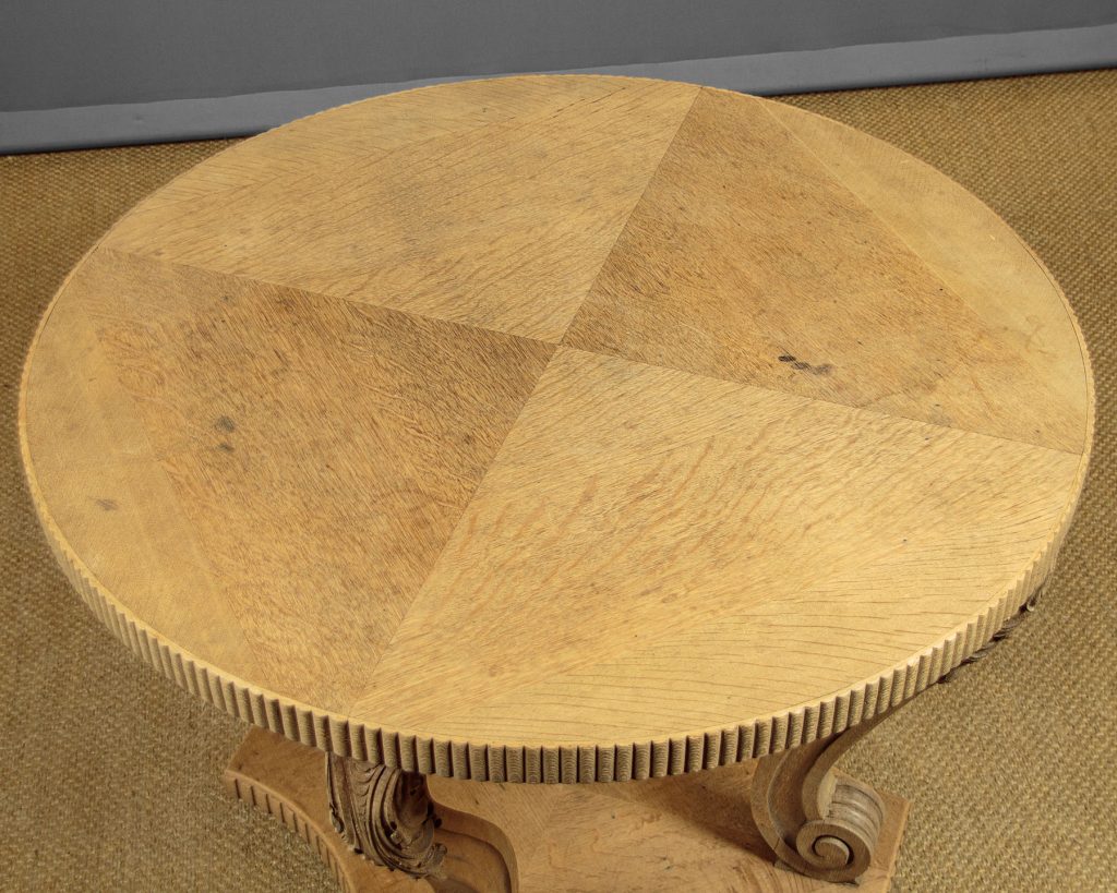 Stylish Art Deco bleached oak centre table c.1930. 39" diameter quarter veneered top with a reeded edge. Raised on curving legs with crisply carved acanthus leaf detail and scrolling terminals. Shaped platform base veneered and reeded to match the top, on turned and carved bun feet. Excellent condition and attractive pale colour.