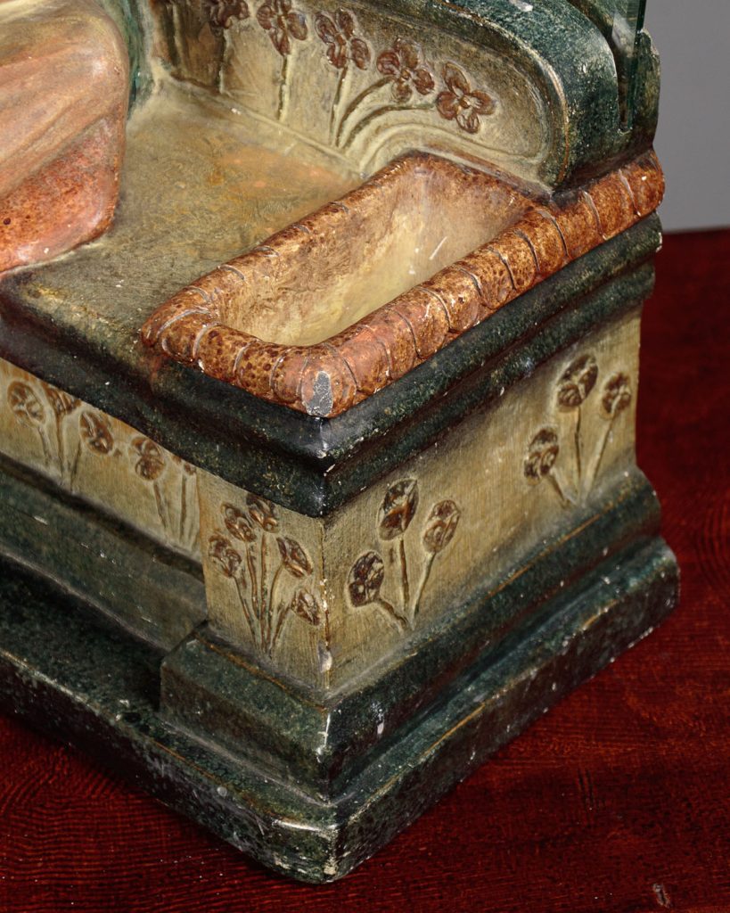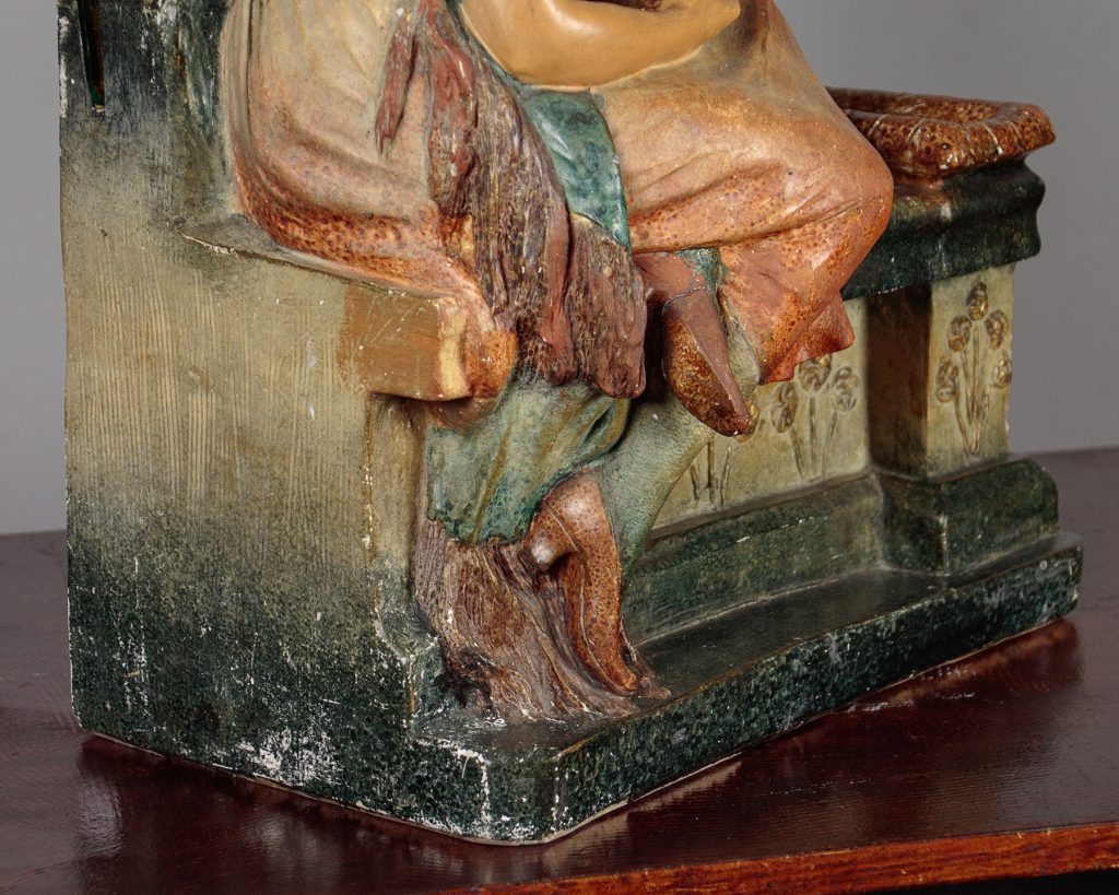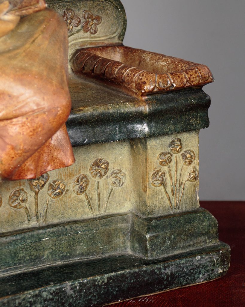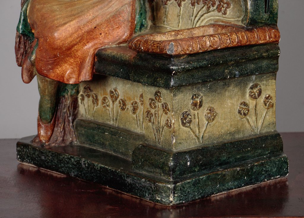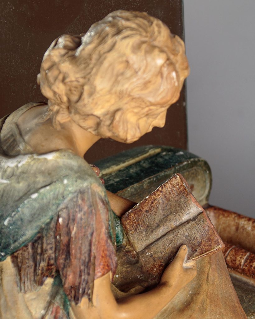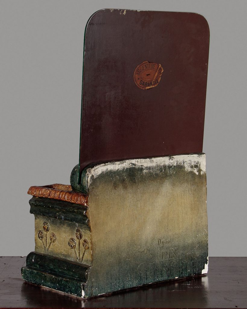 Very unusual Art Deco dressing table mirror c.1930. Original 14½" square mirror plate held on a chalk base modelled as a fashionably dressed young woman sat reading on an architectural plinth with stylized floral detail. Featuring a small recess for jewellery, hair pins etc. to the right hand size. Retaining the original painted finish. Signed Prof Fattorini on the rear with a Depose (registered) number and paper maker's label to the mirror. Presented as found in good original condition with some obvious tarnish to the mirror and minor wear to the paintwork.