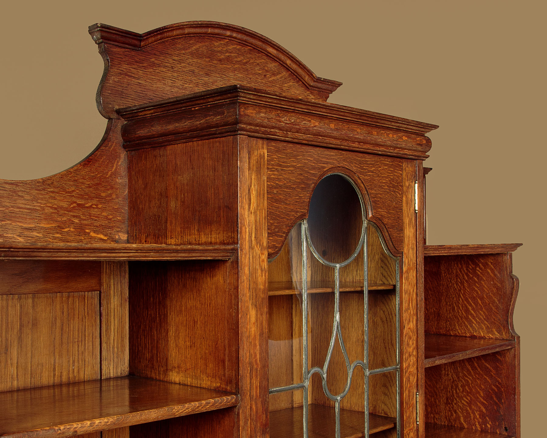 Unusual English oak side cabinet display and bookshelves c.1910. Raised and shaped back with a moulded cornice at the centre and reeded uprights at ends. Over a single door cabinet with lovely Arts & Crafts style leaded glass panel, fitted inside with three shelves (depth 9½") and with a single drawer below. Flanked on both sides with open bookshelves fitted with three shelves (depth 10"), the top shelves being fixed whilst the lower two are adjustable. Shaped detail to the sides and apron. Raised on short Queen Anne style legs with a carved scallop detail to the front, joined with turned stretchers. Superior quality, in solid oak, 'quarter sawn' to reveal the medullary rays in the timber. Very good colour and condition, cleaned and waxed in our workshops. Key supplied.