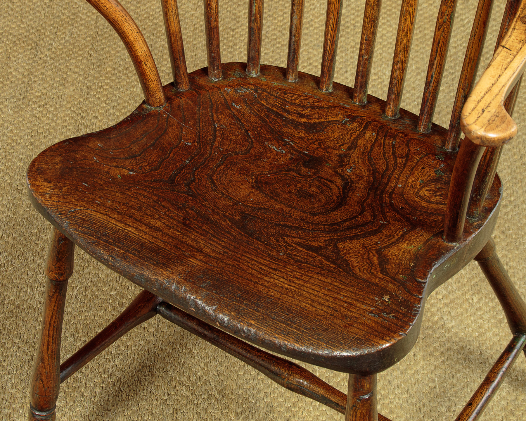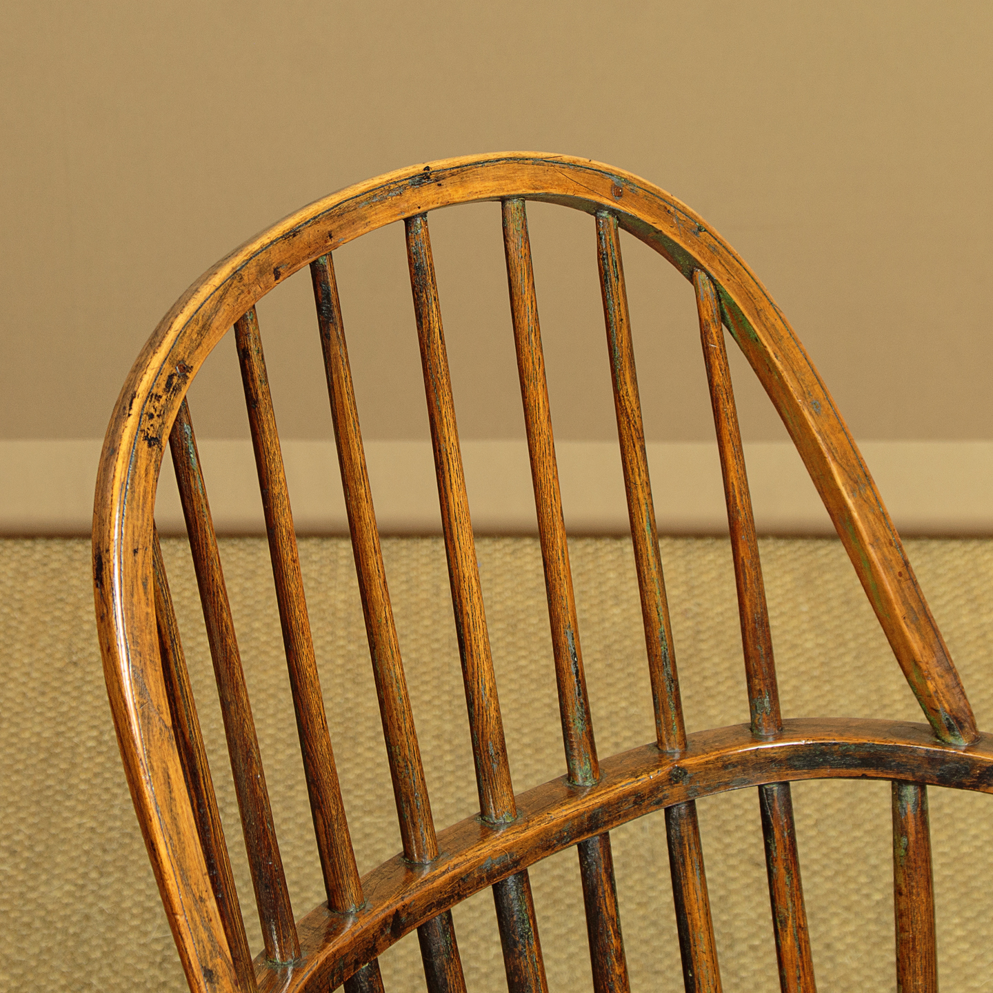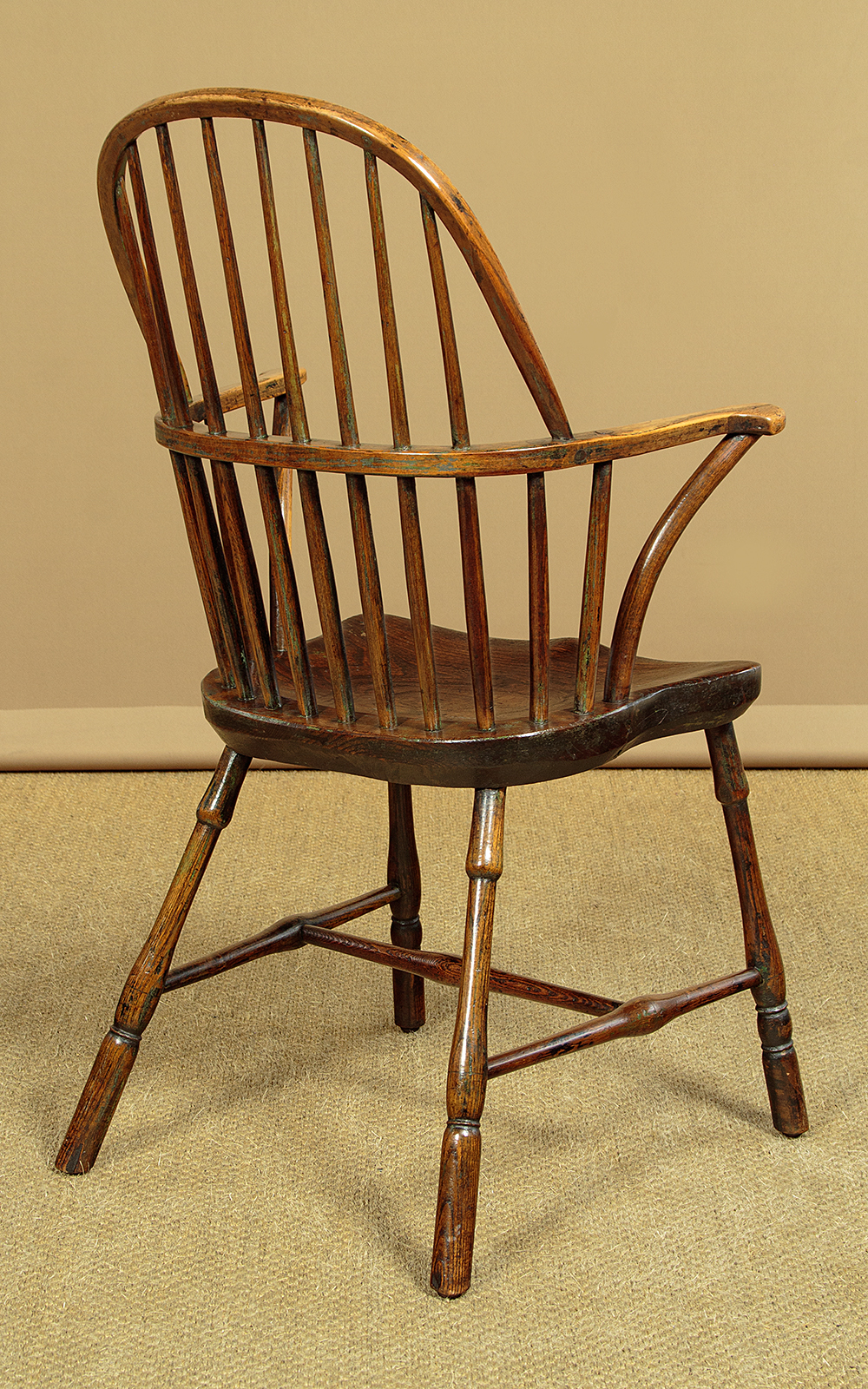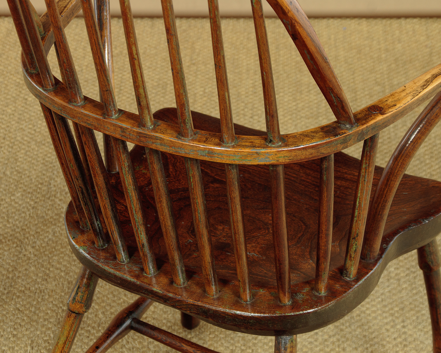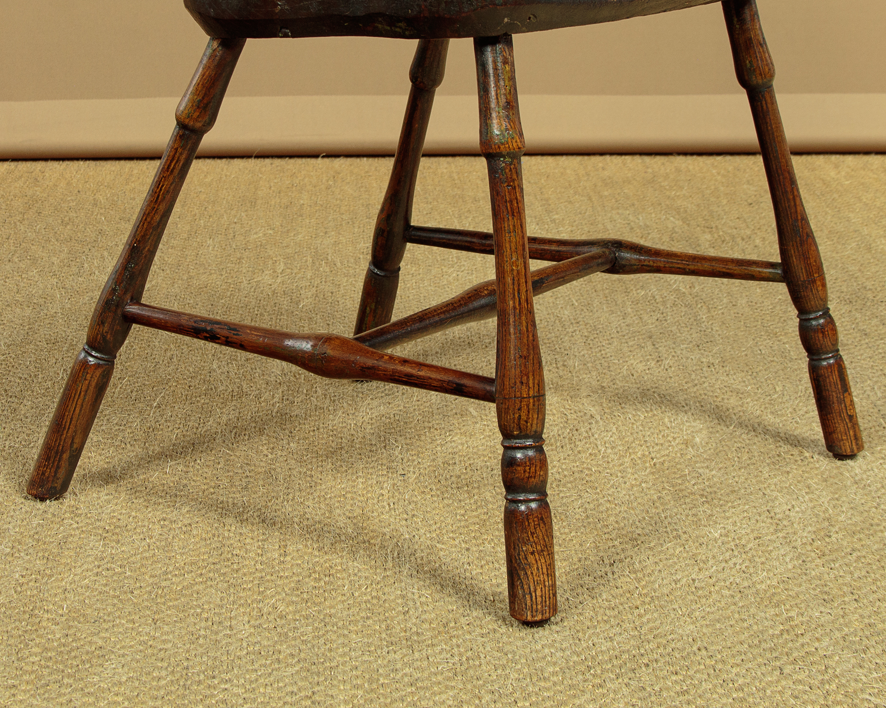 Delightful little early 19th.c. Windsor armchair c.1820. Steamed ash top rail and back stretcher with simple stick spindles. Lovely shaped ends to the arms over curving supports. Beautifully shaped seat (height 17") formed from a thick piece of elm, note how the lower edge is chamfered to present a slimmer profile. Raised on slim legs with a simple turned detail, splayed for stability and joined with H stretchers for strength. Excellent colour and condition, with a lovely patina and retaining traces of the original green paint. Cleaned and waxed in our workshops.