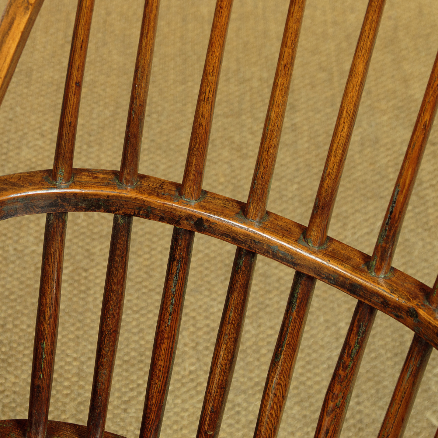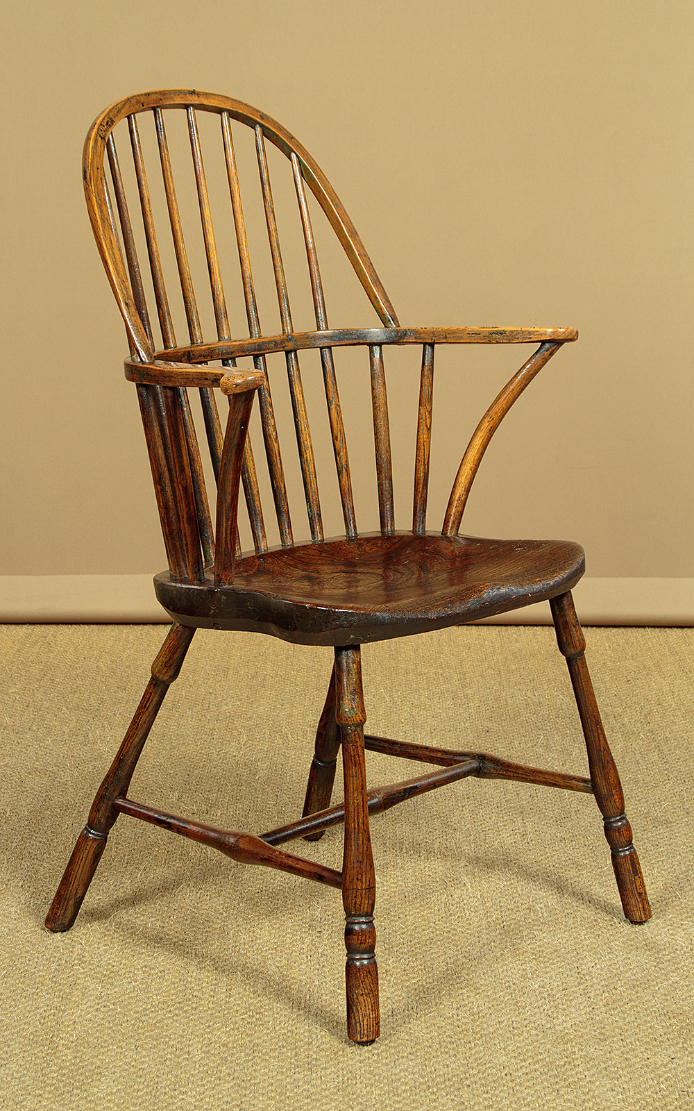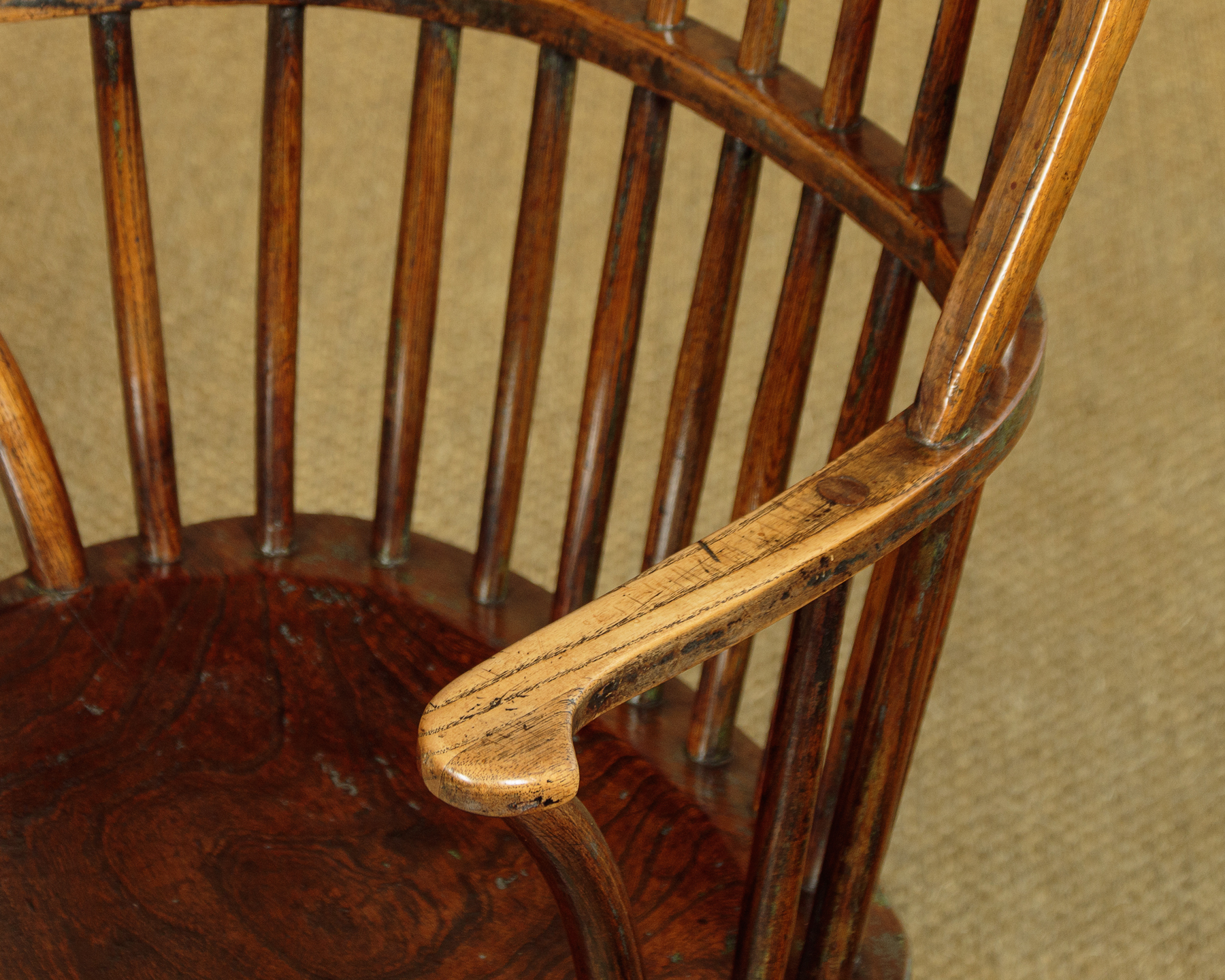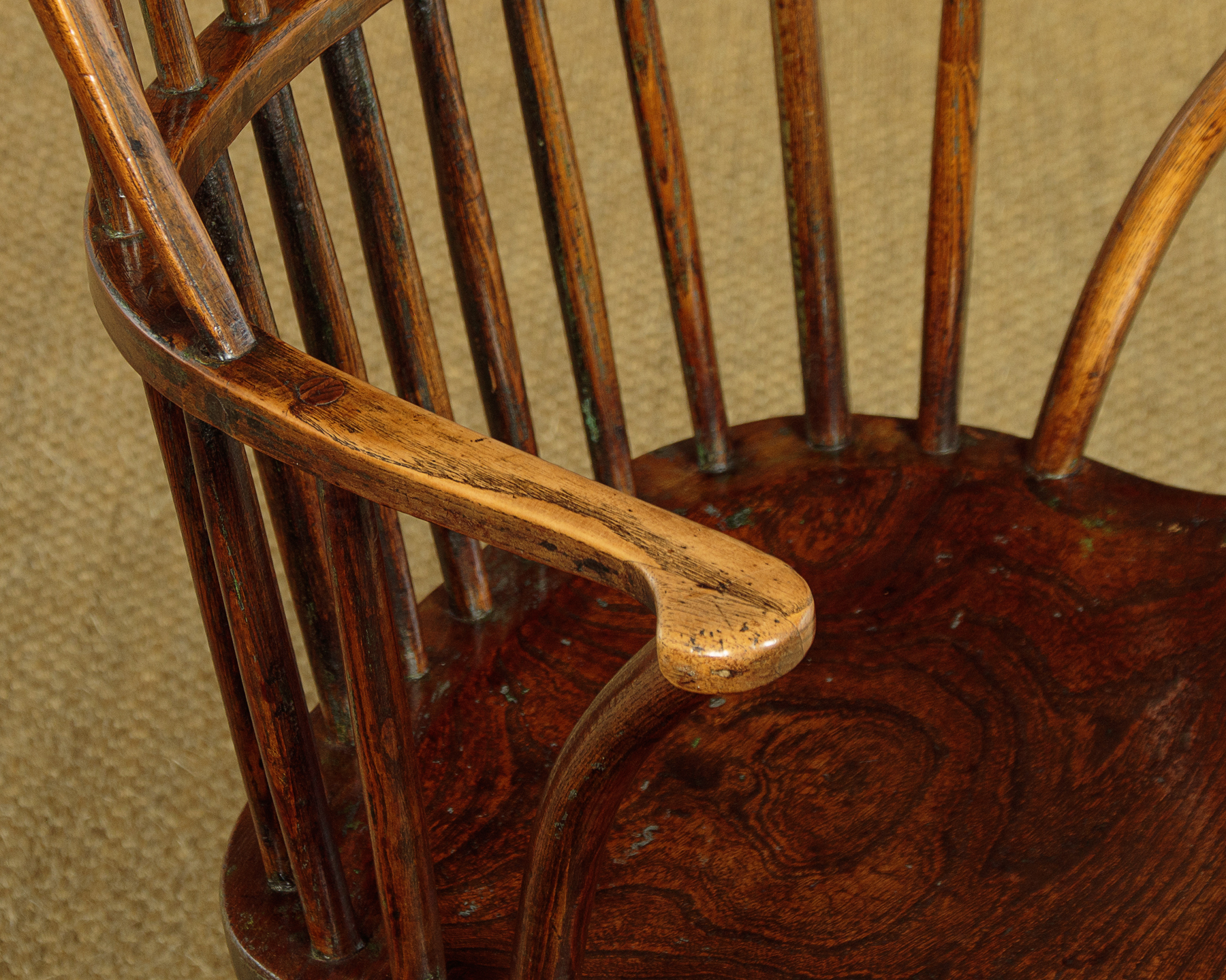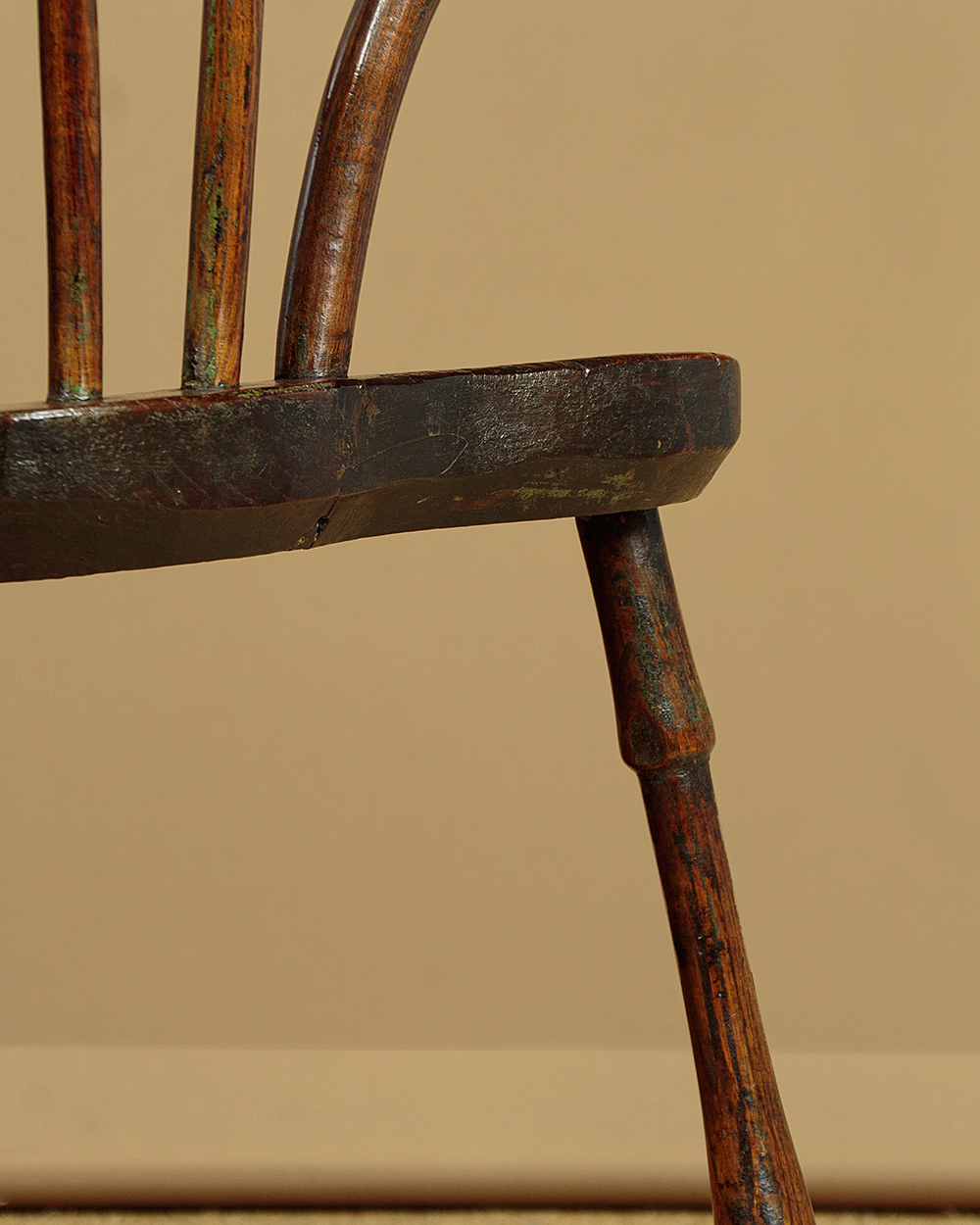 Delightful little early 19th.c. Windsor armchair c.1820. Steamed ash top rail and back stretcher with simple stick spindles. Lovely shaped ends to the arms over curving supports. Beautifully shaped seat (height 17") formed from a thick piece of elm, note how the lower edge is chamfered to present a slimmer profile. Raised on slim legs with a simple turned detail, splayed for stability and joined with H stretchers for strength. Excellent colour and condition, with a lovely patina and retaining traces of the original green paint. Cleaned and waxed in our workshops.