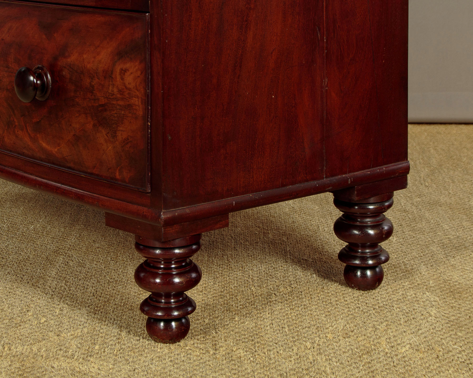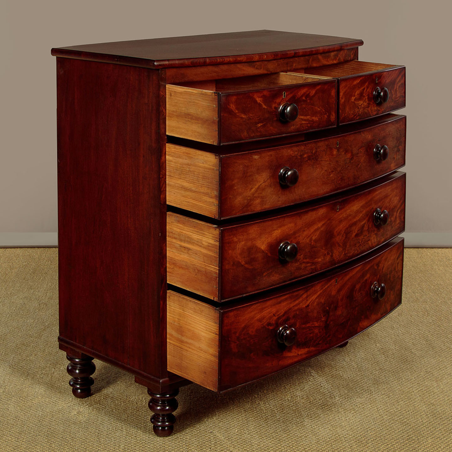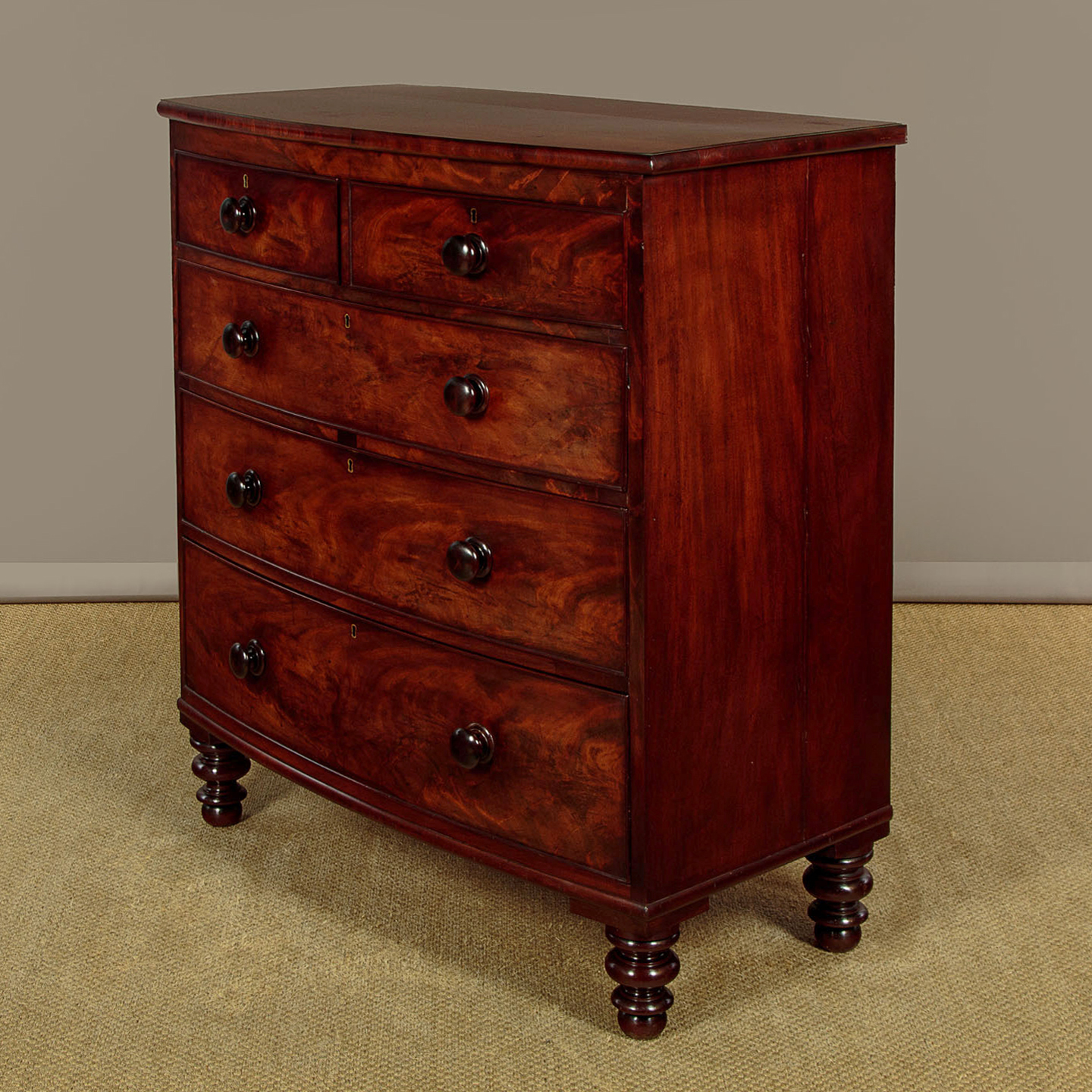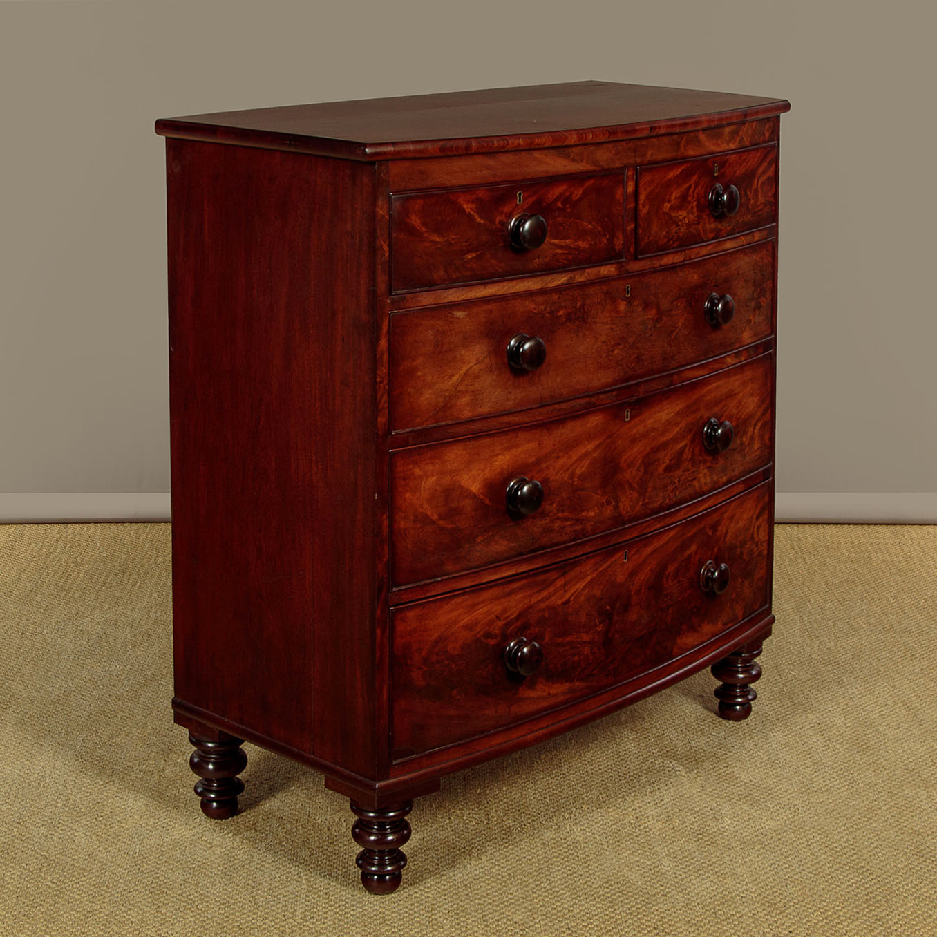 Good sized mid 19th.c. mahogany bow front chest of drawers c.1860. Solid mahogany top with a moulded crossbanded edge. Over two short and three long drawers of graduated height. Beautifully figured flame mahogany veneers to the drawer fronts with cockbeaded edges and the original turned mahogany handles. Mahogany veneered sides and raised on the original tall turned mahogany feet front and rear. Excellent colour and condition, cleaned and waxed in our workshops.