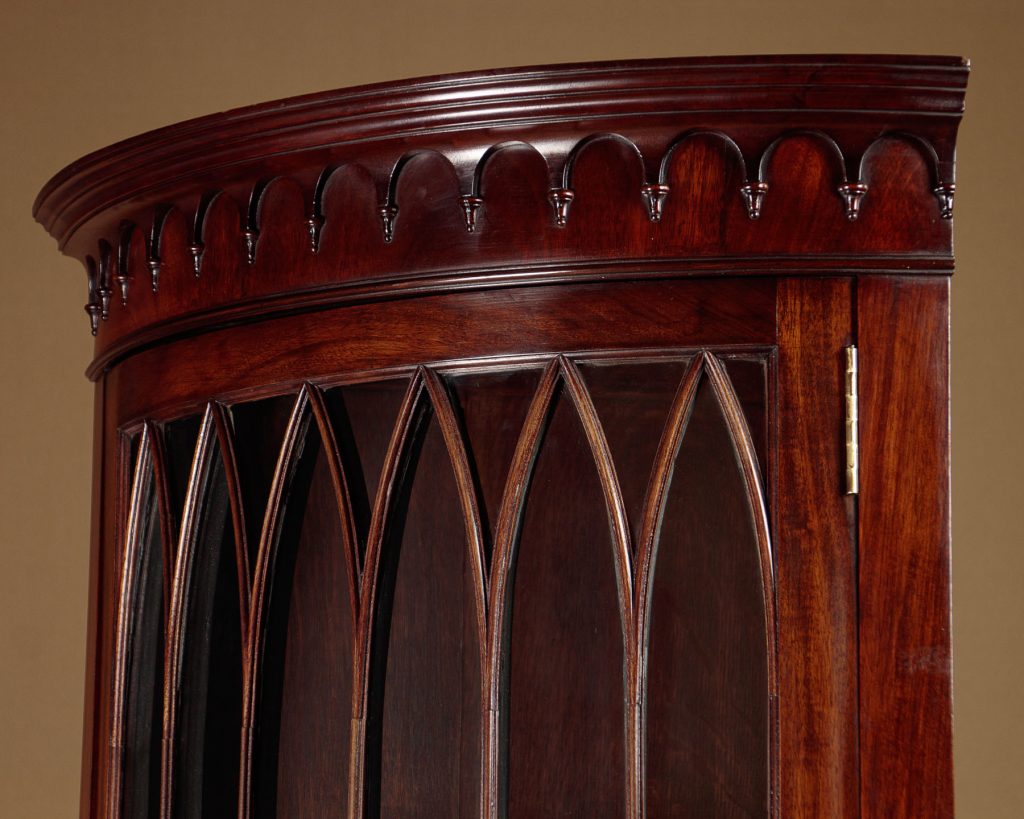Good Quality mahogany glazed corner display cabinet c.1920. Crisp moulded cornice with Gothic arch detail over a full length bow front door with 32 individually glazed panels. Fitted with four shaped oak shelves inside and oak backboards. Moulded plinth with shaped detail to the feet. Excellent colour and condition, cleaned and waxed in our workshops. Key supplied.