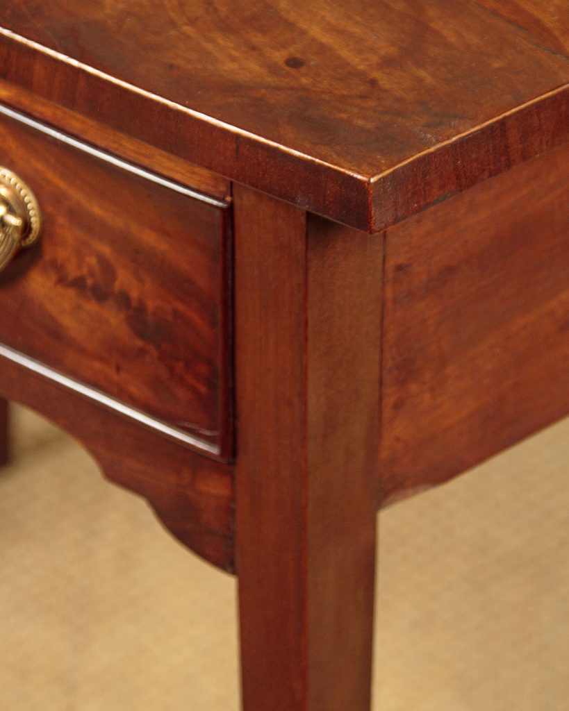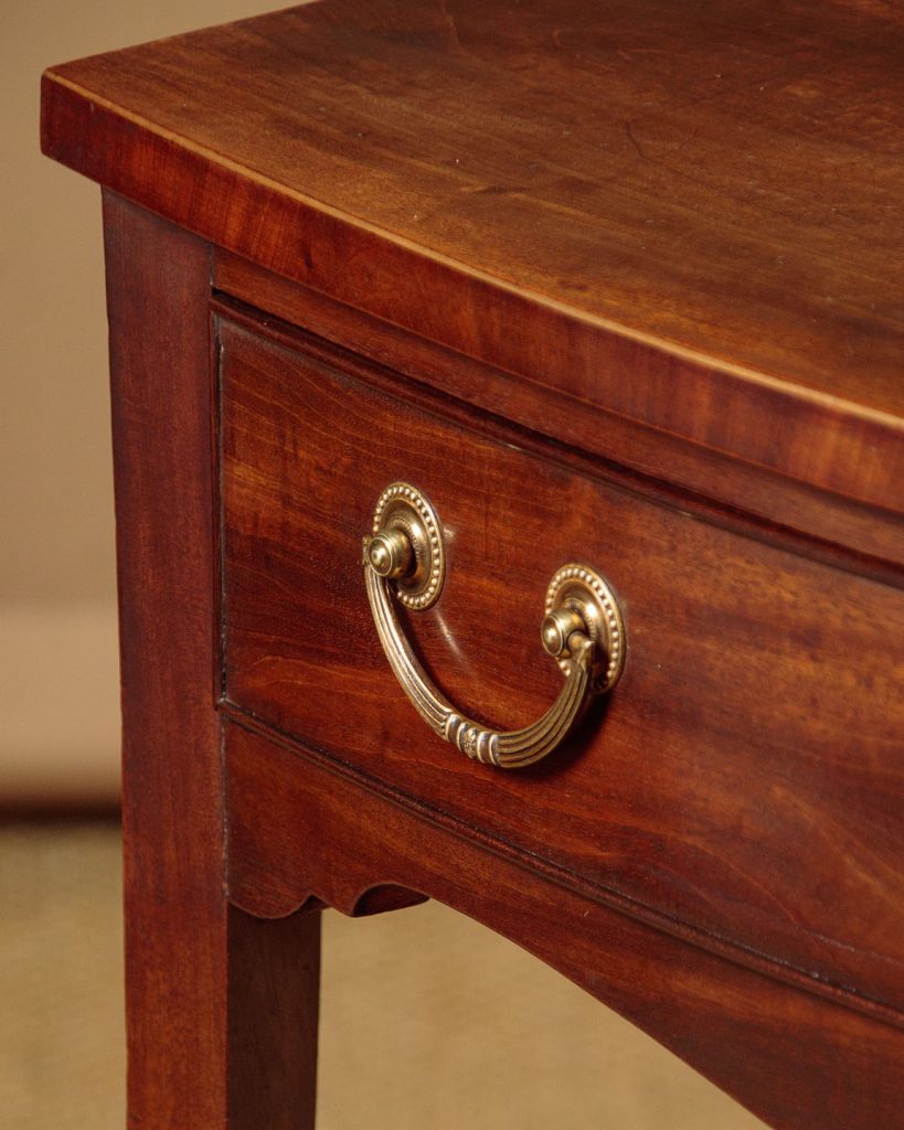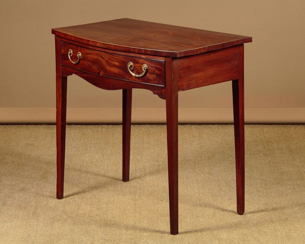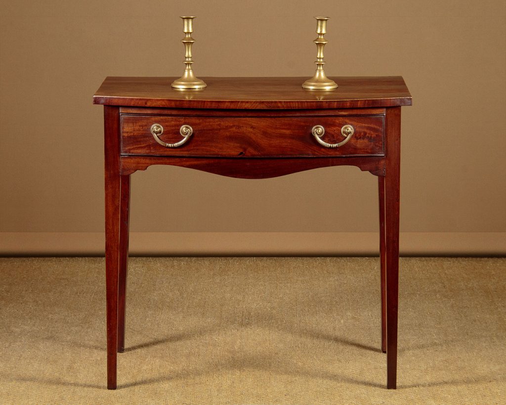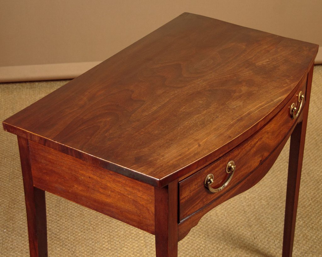 Small George III mahogany bow front side table c.1810. Just 29½" wide. Well figured veneer to the top with a crossbanded edge. Over a single drawer, also bow fronted with cockbeaded edges and good quality brass handles. Shaped apron below the drawer and raised on slim tapering legs. Solid mahogany sides and oak drawer linings. Very good condition, cleaned and waxed in our workshops.
