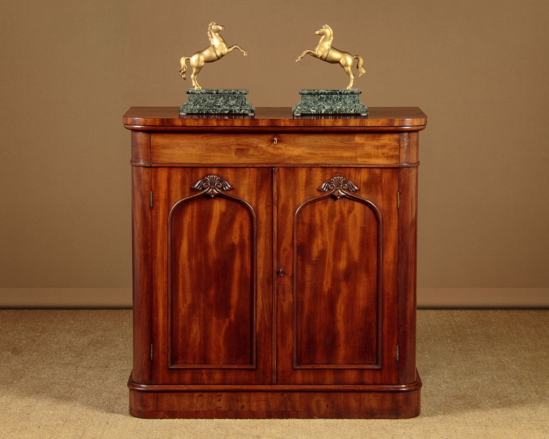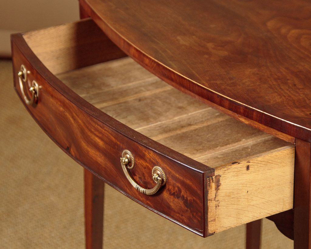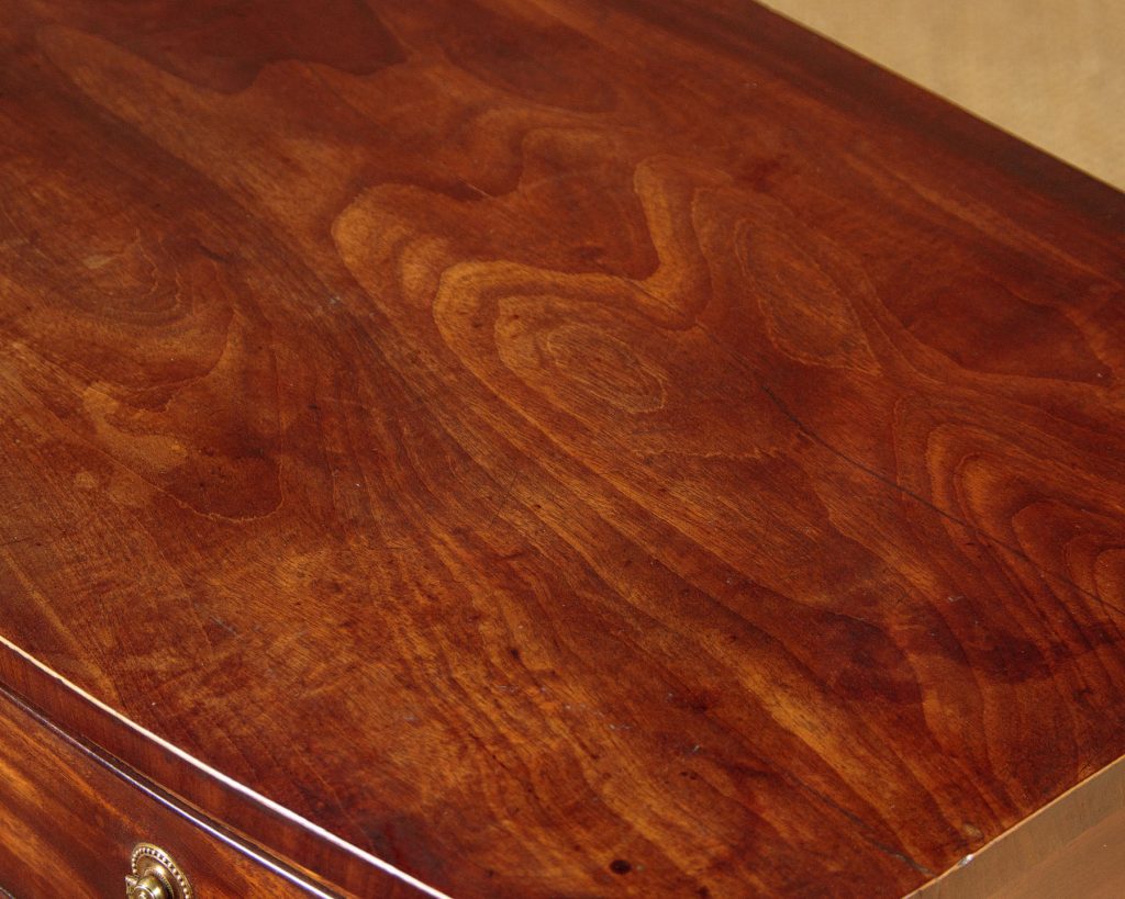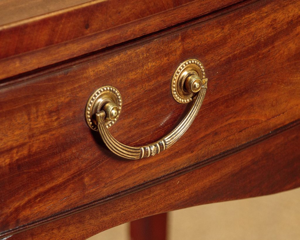 Small George III mahogany bow front side table c.1810. Just 29½" wide. Well figured veneer to the top with a crossbanded edge. Over a single drawer, also bow fronted with cockbeaded edges and good quality brass handles. Shaped apron below the drawer and raised on slim tapering legs. Solid mahogany sides and oak drawer linings. Very good condition, cleaned and waxed in our workshops.