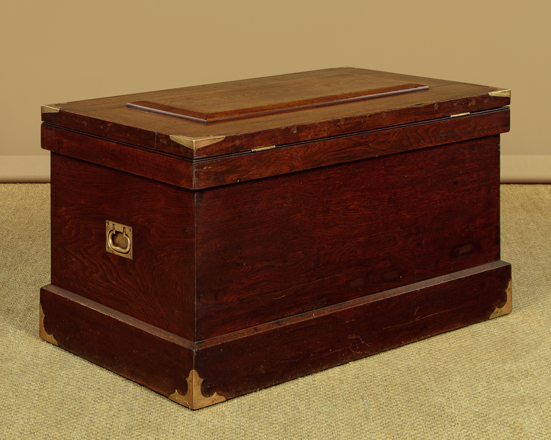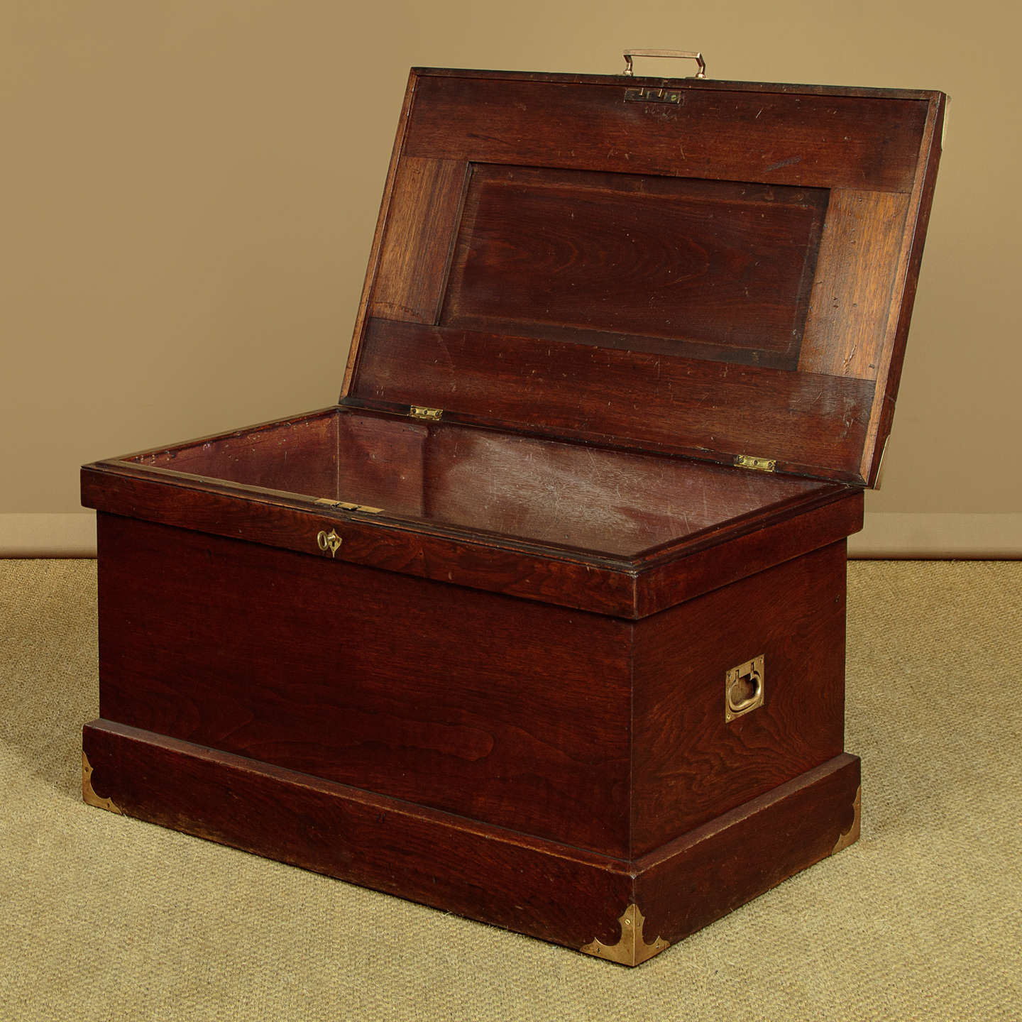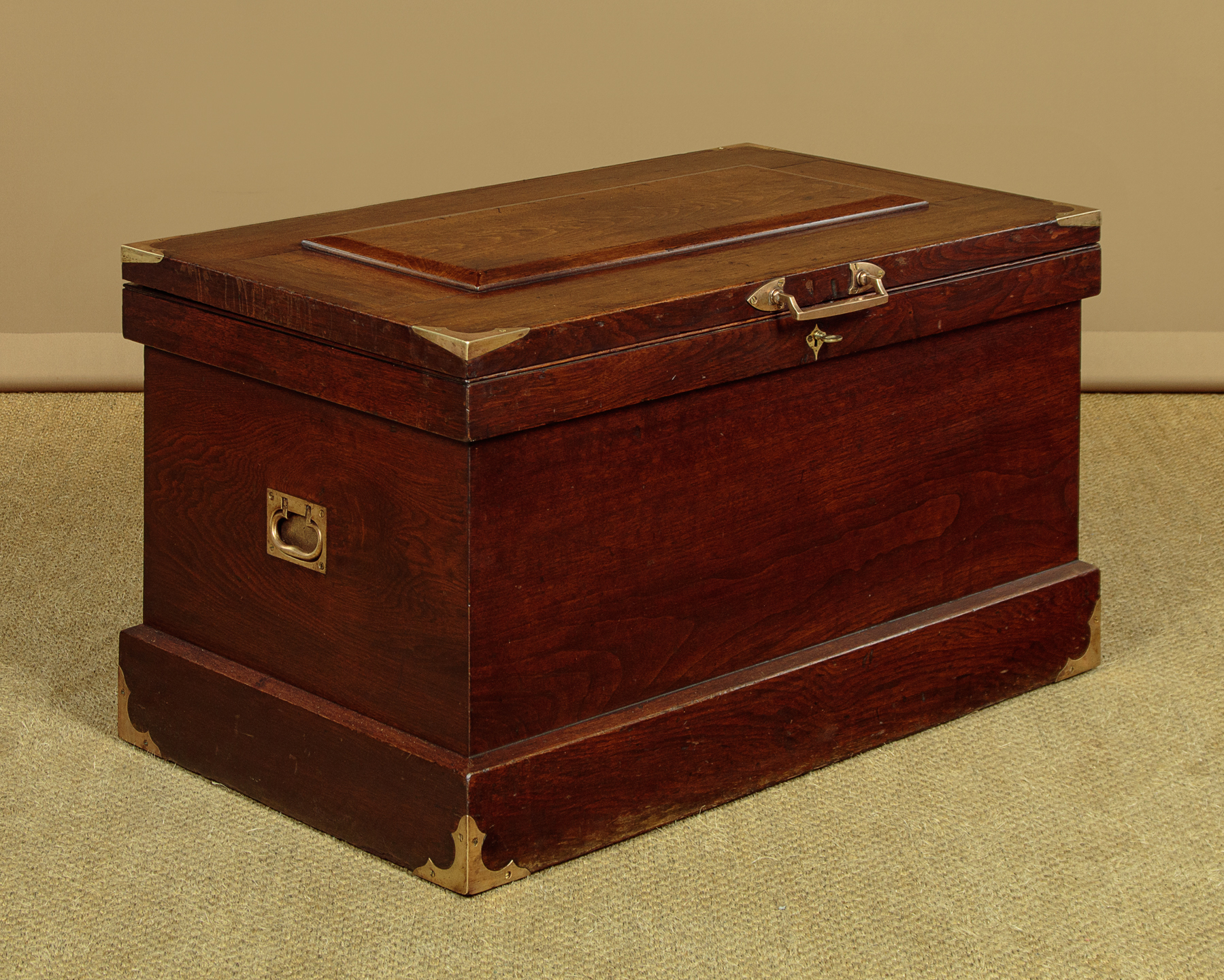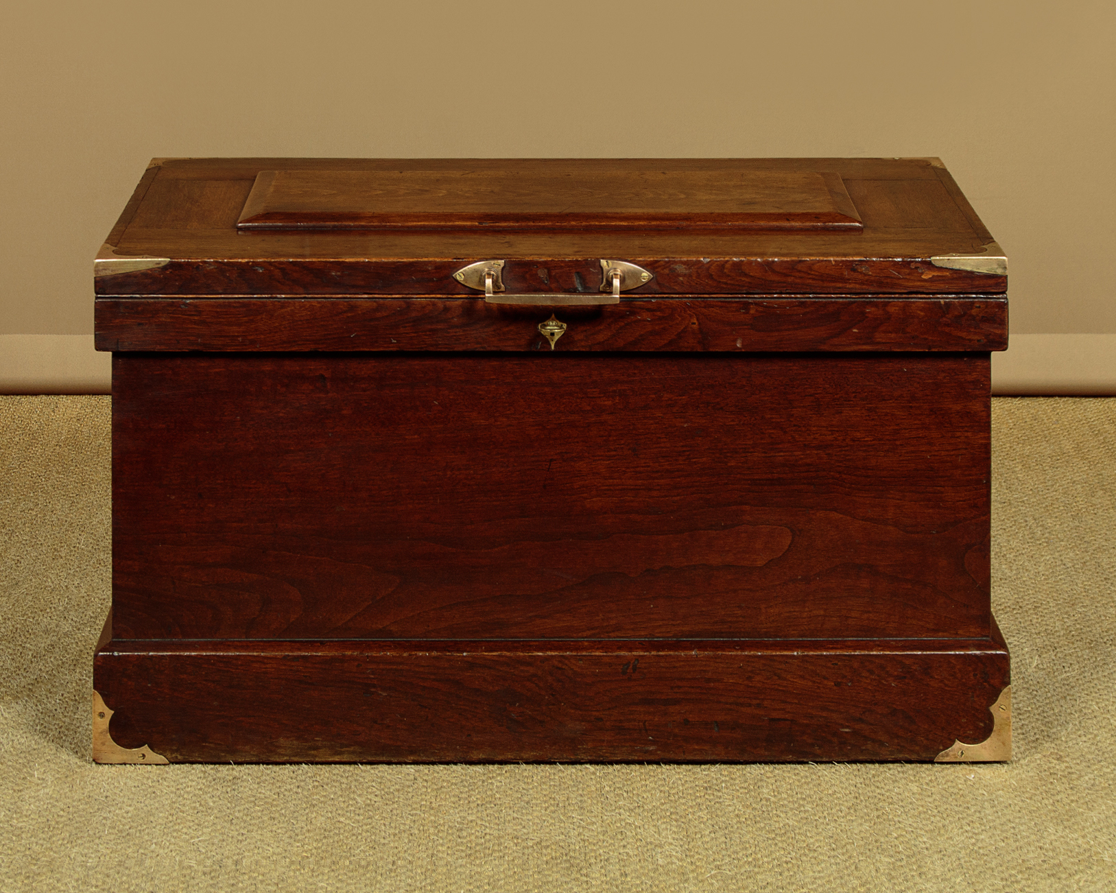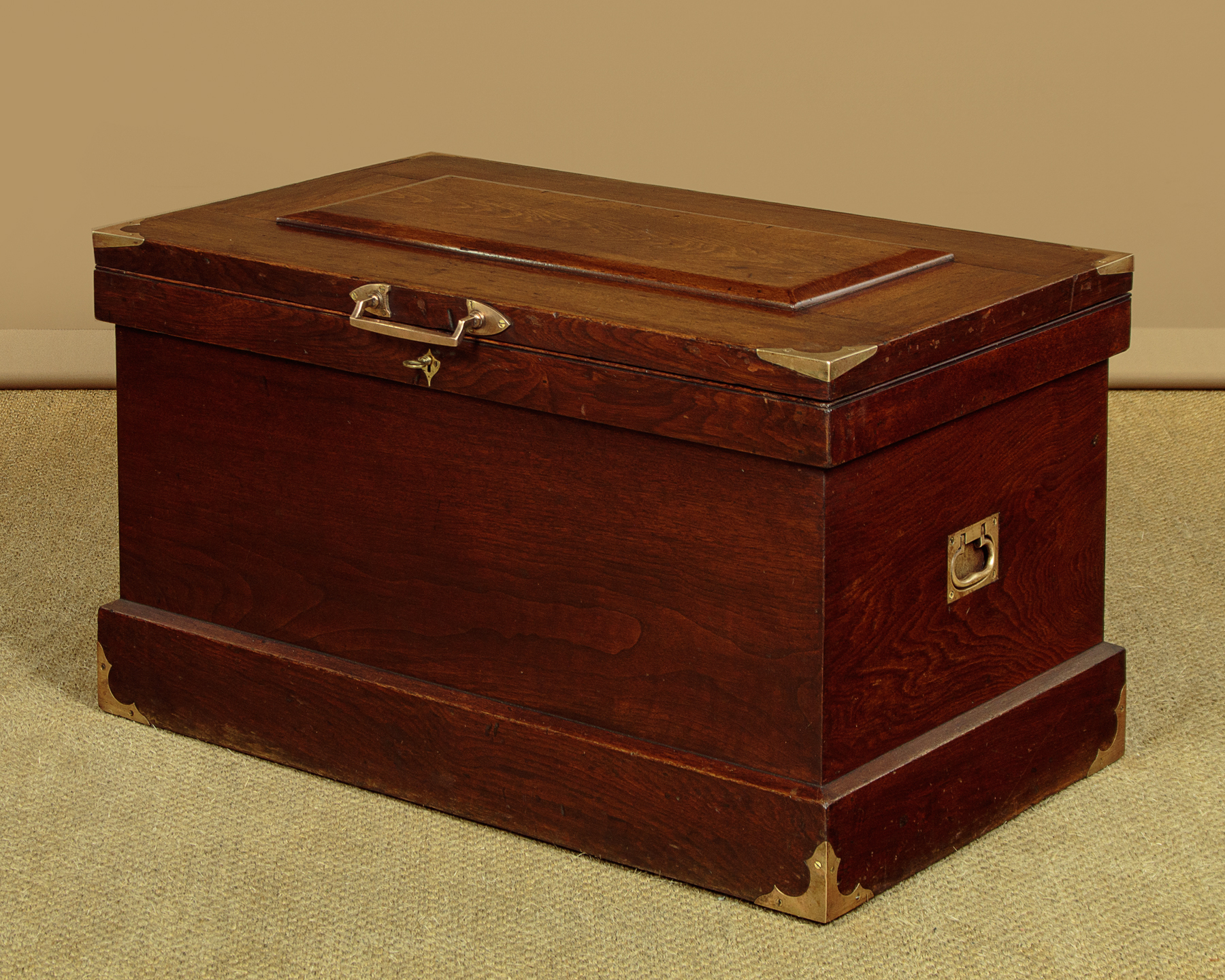 Very sturdy walnut campaign or sea chest c.1880. Would make an attractive coffee table for a period interior. Made from thick boards of American black walnut with an unusual panelled lid and a bumper around the top and base to protect the main body of the chest. The lid and base are further protected with attractively shaped brass corner plates inlaid so they sit flush with the surface. Note also the flush fitting campaign style brass handles at the sides. The lid handle, also in brass and of very good quality is probably a later addition. Original lock and hinges. Very good colour and condition, cleaned and waxed in our workshops. Key supplied.