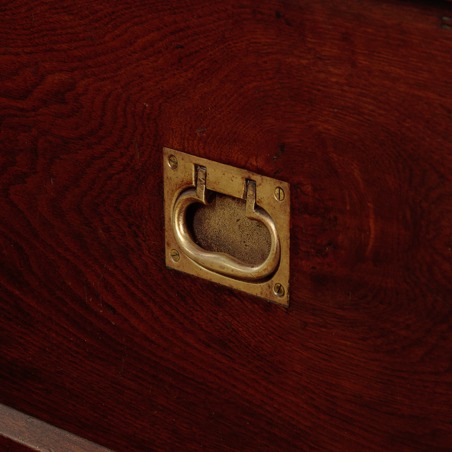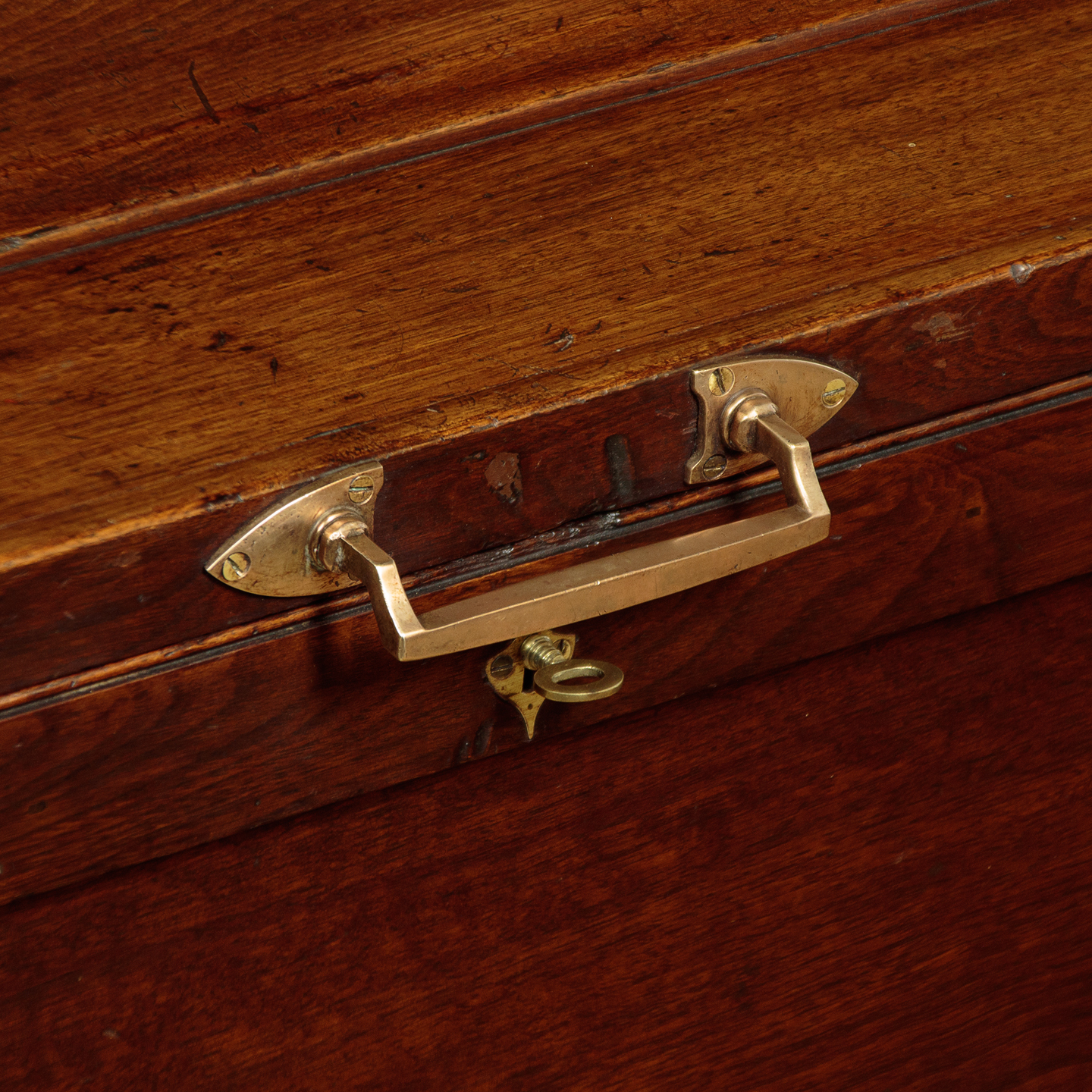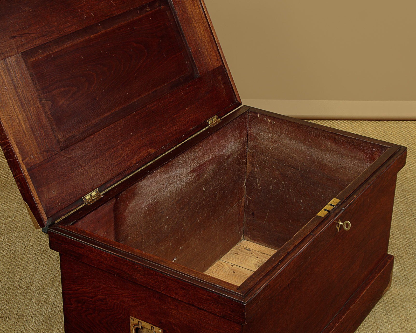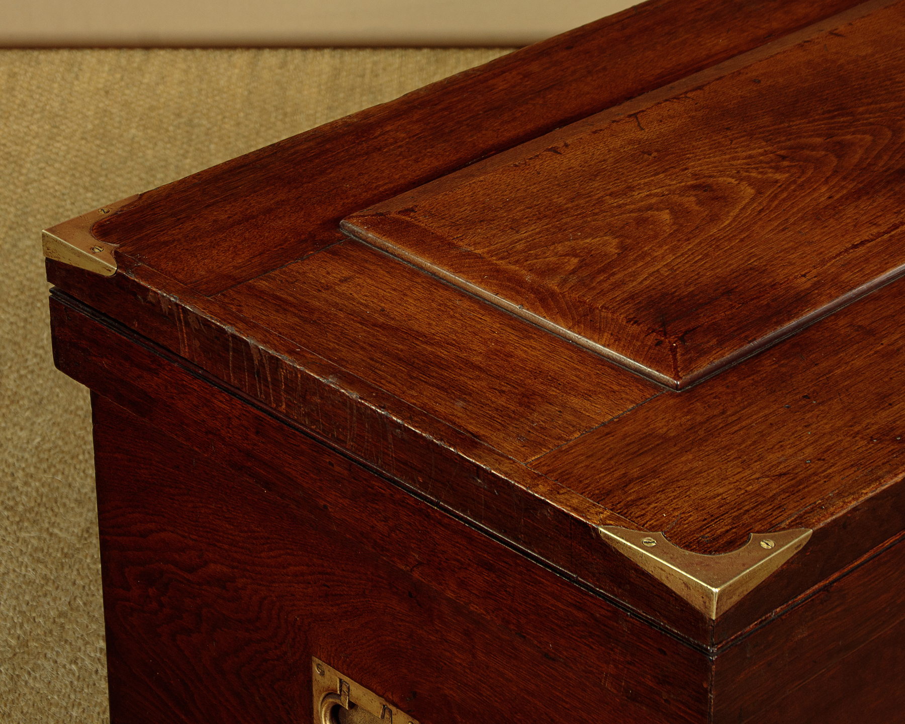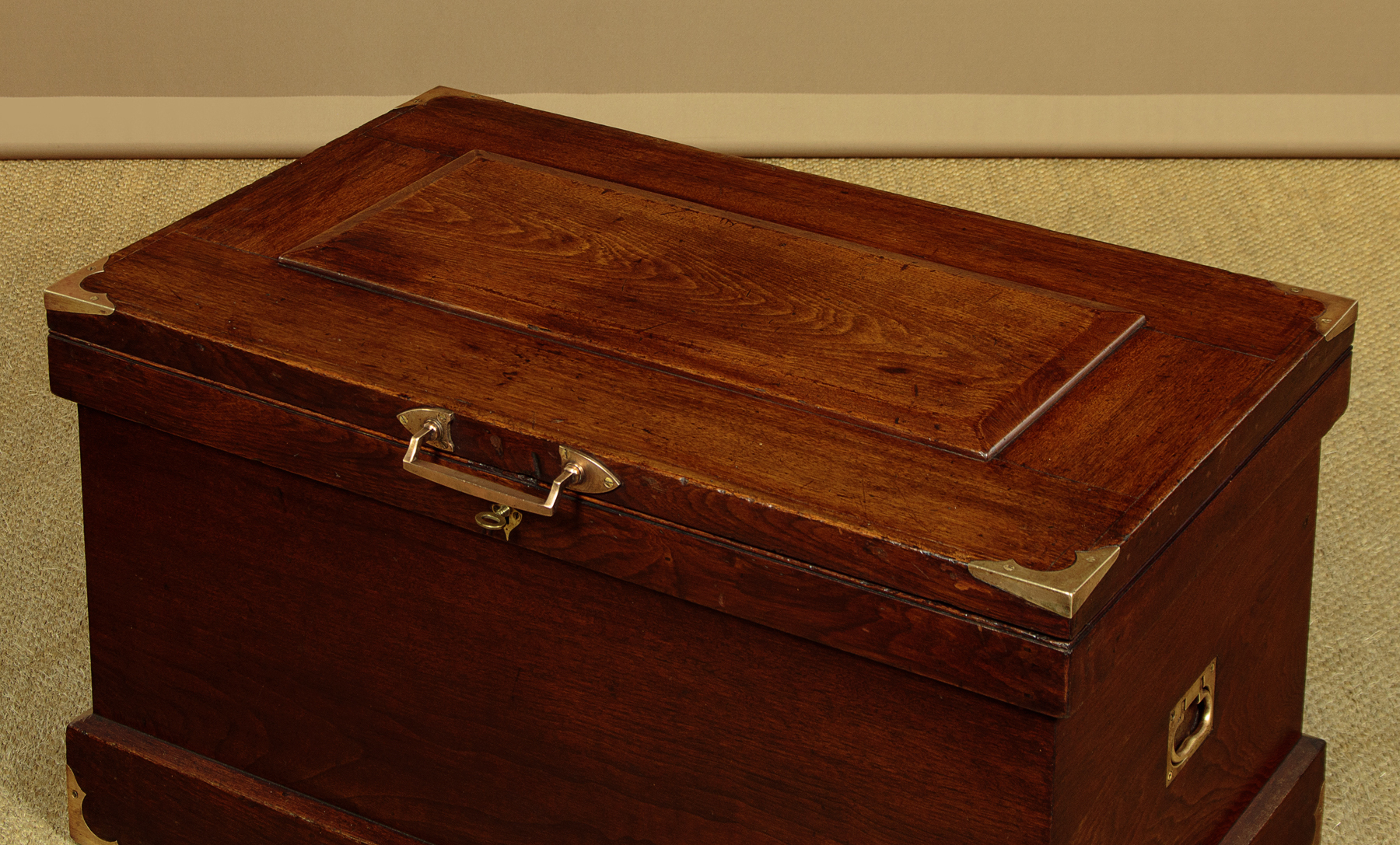 Very sturdy walnut campaign or sea chest c.1880. Would make an attractive coffee table for a period interior. Made from thick boards of American black walnut with an unusual panelled lid and a bumper around the top and base to protect the main body of the chest. The lid and base are further protected with attractively shaped brass corner plates inlaid so they sit flush with the surface. Note also the flush fitting campaign style brass handles at the sides. The lid handle, also in brass and of very good quality is probably a later addition. Original lock and hinges. Very good colour and condition, cleaned and waxed in our workshops. Key supplied.