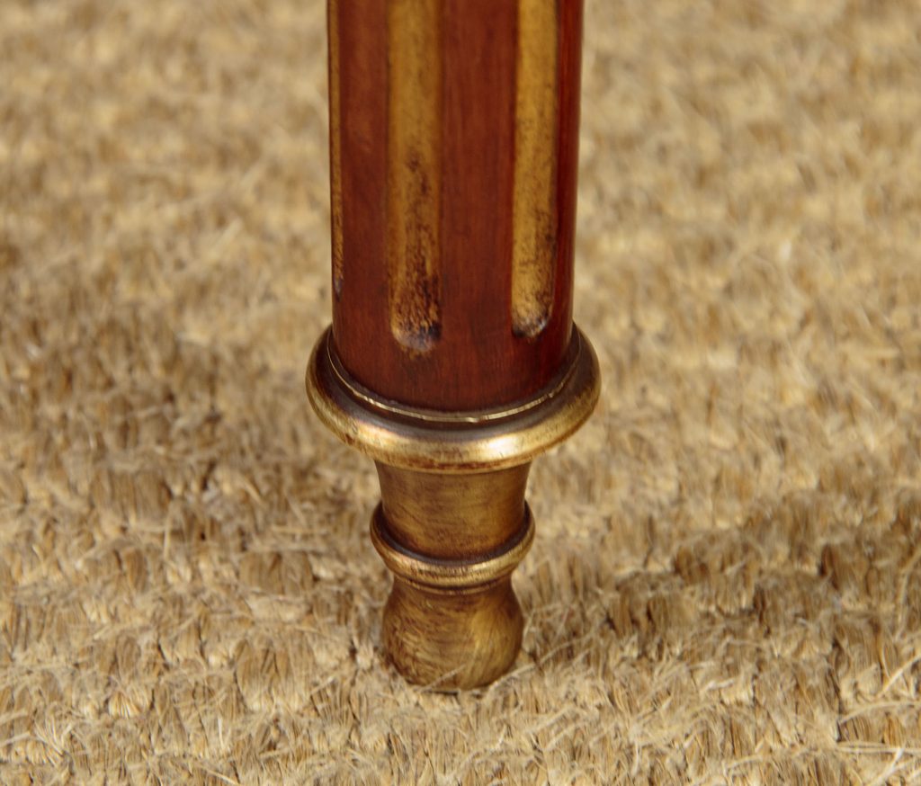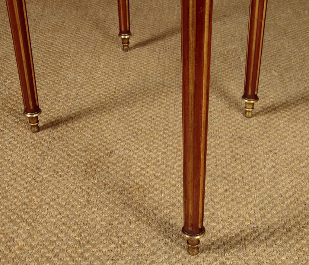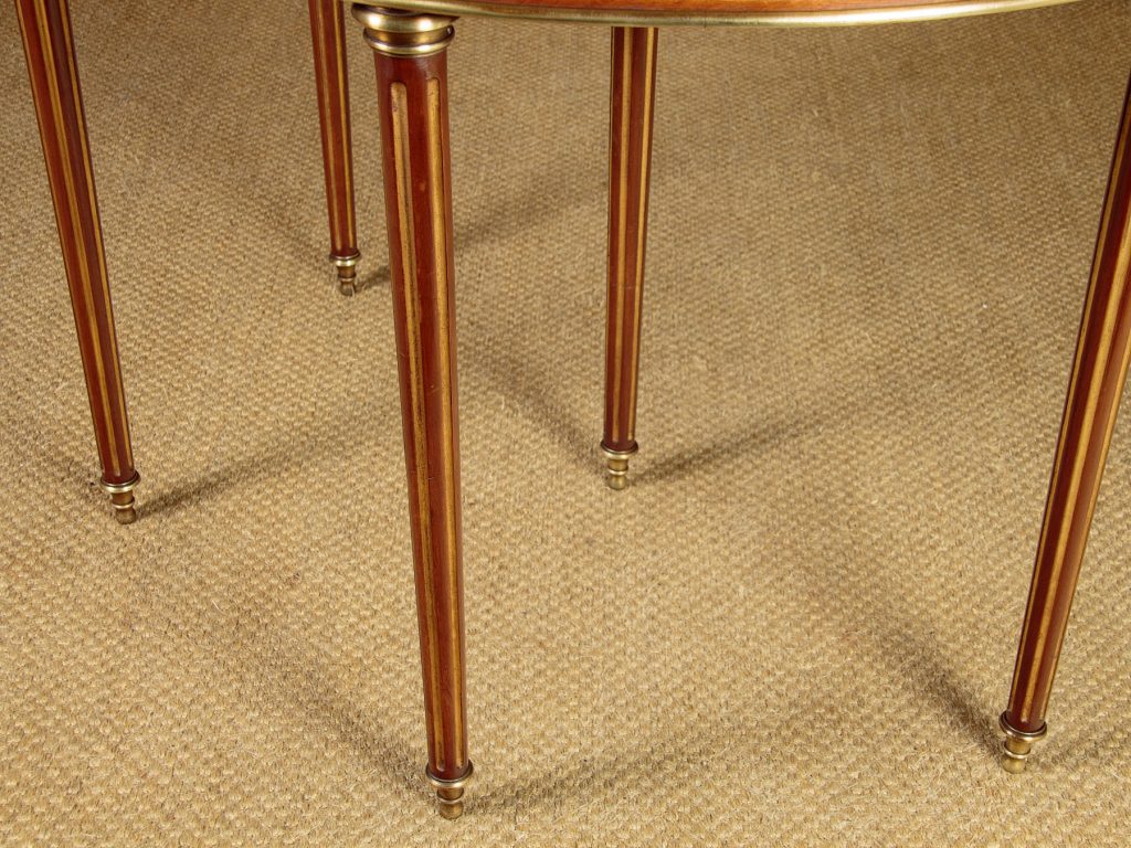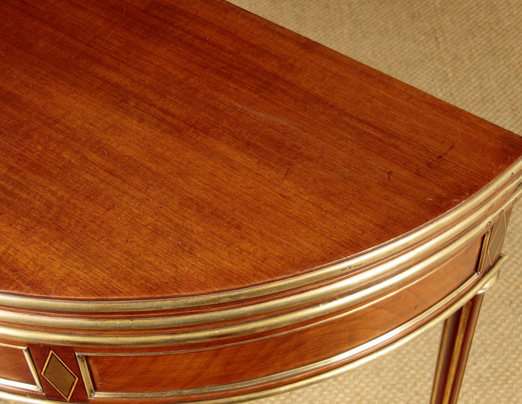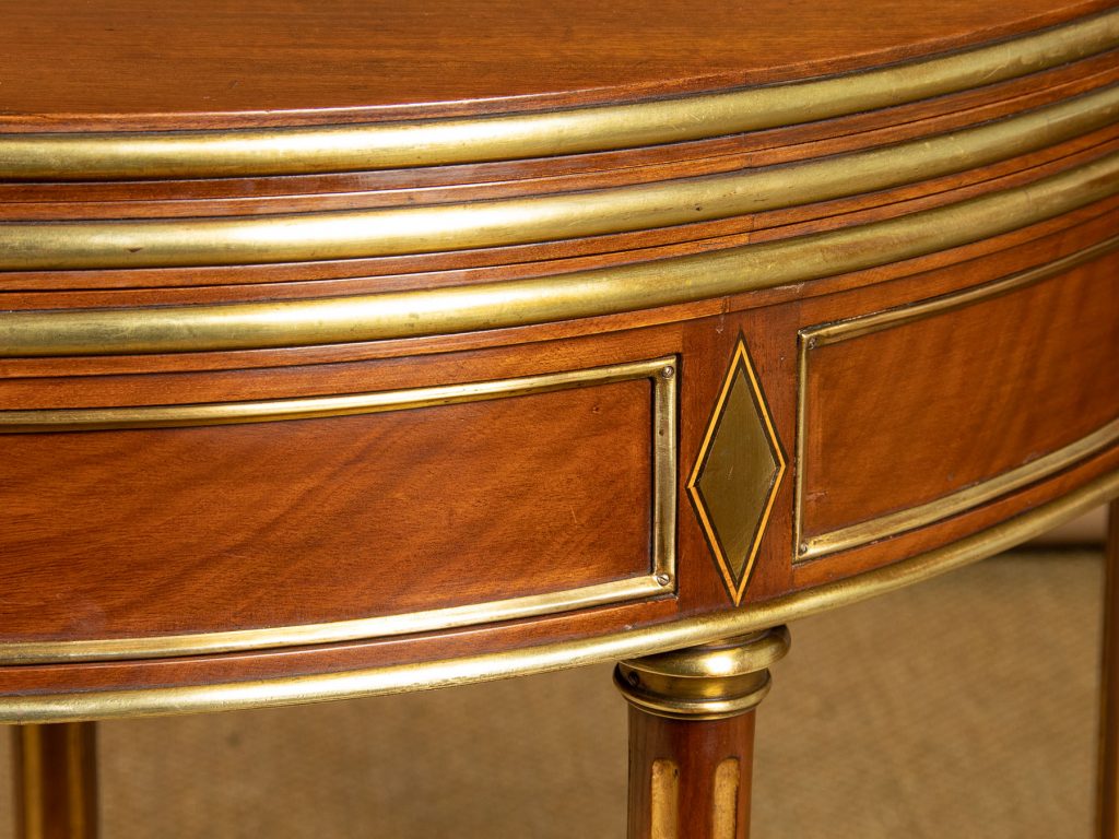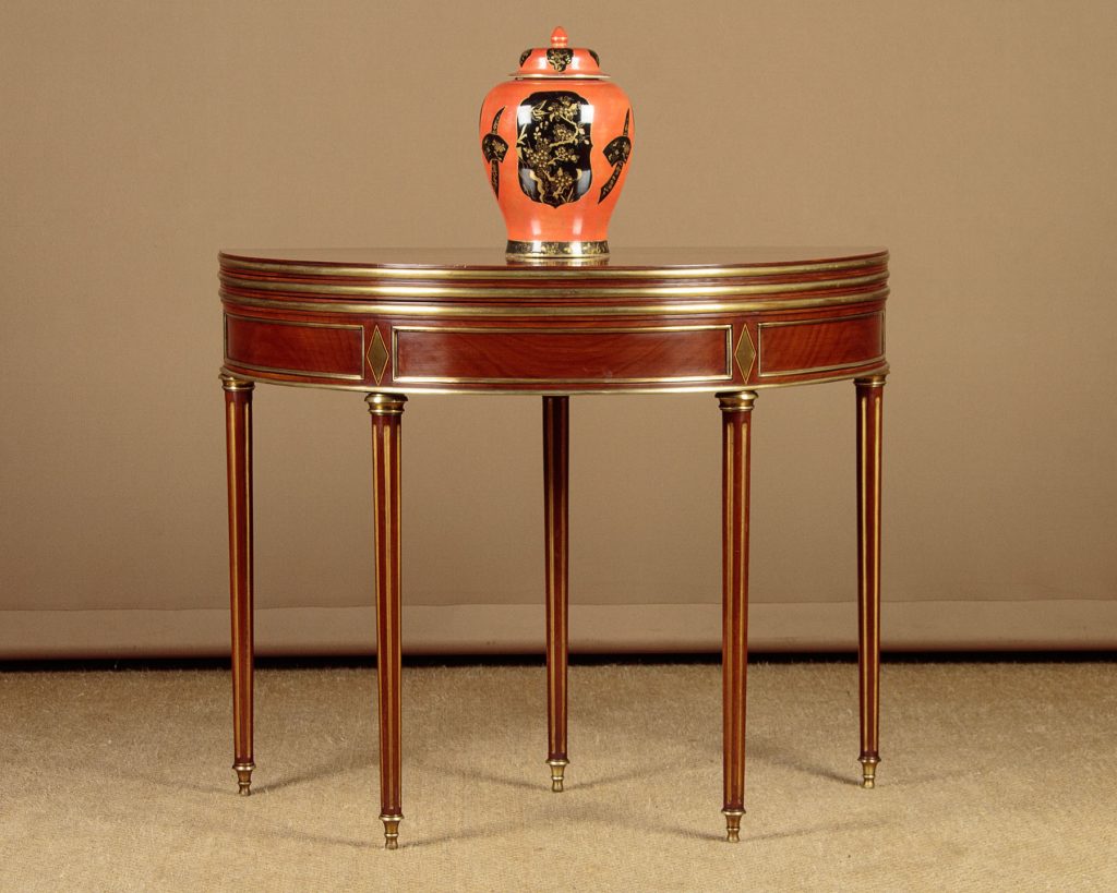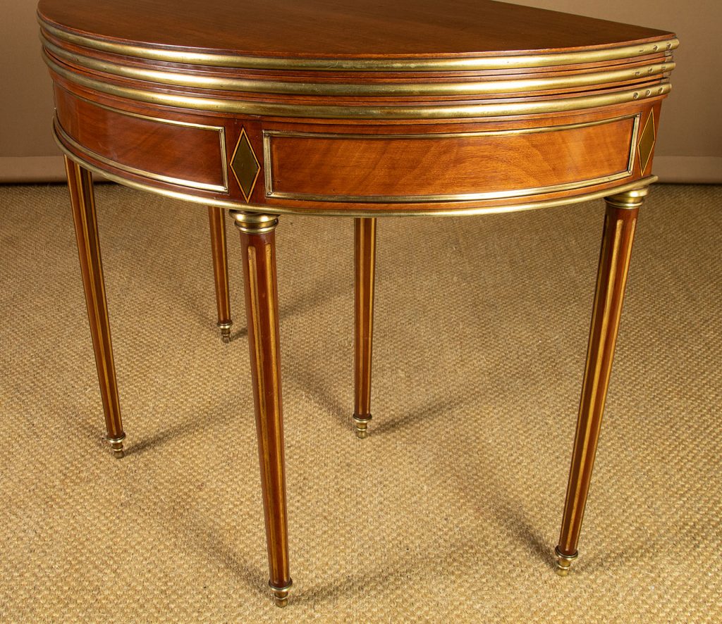 Very smart early 20th.c. brass mounted mahogany fold over table c.1910. Stands flat against the wall as a bow fronted console table or slide out the central rear leg and open to top to make a round supper table for four. Unusually the table has a second folding leaf which opens to reveal a green baize playing surface for cards. Applied brass moulding to the edges of the leaves, decorative brass inlays and moulding to the mahogany apron front and rear. Small drawer to the rear forming a support for the open leaf. Raised on turned, tapering and fluted rear legs with gilded flutes, brass collars and brass finial feet. Some minor wear to the tops. Generally excellent condition, cleaned and waxed in our workshops.