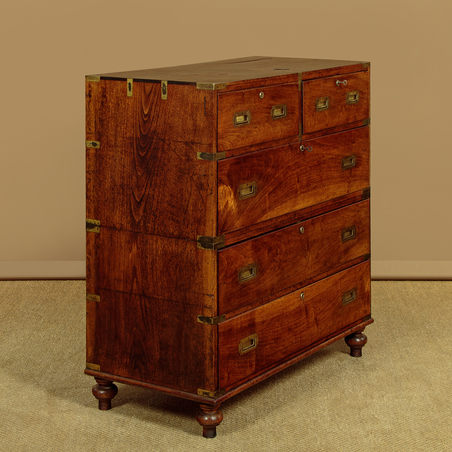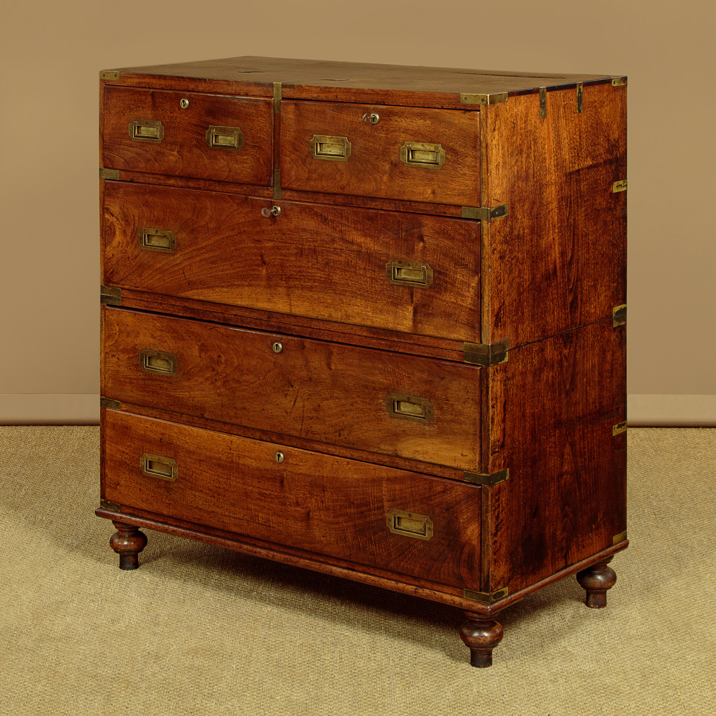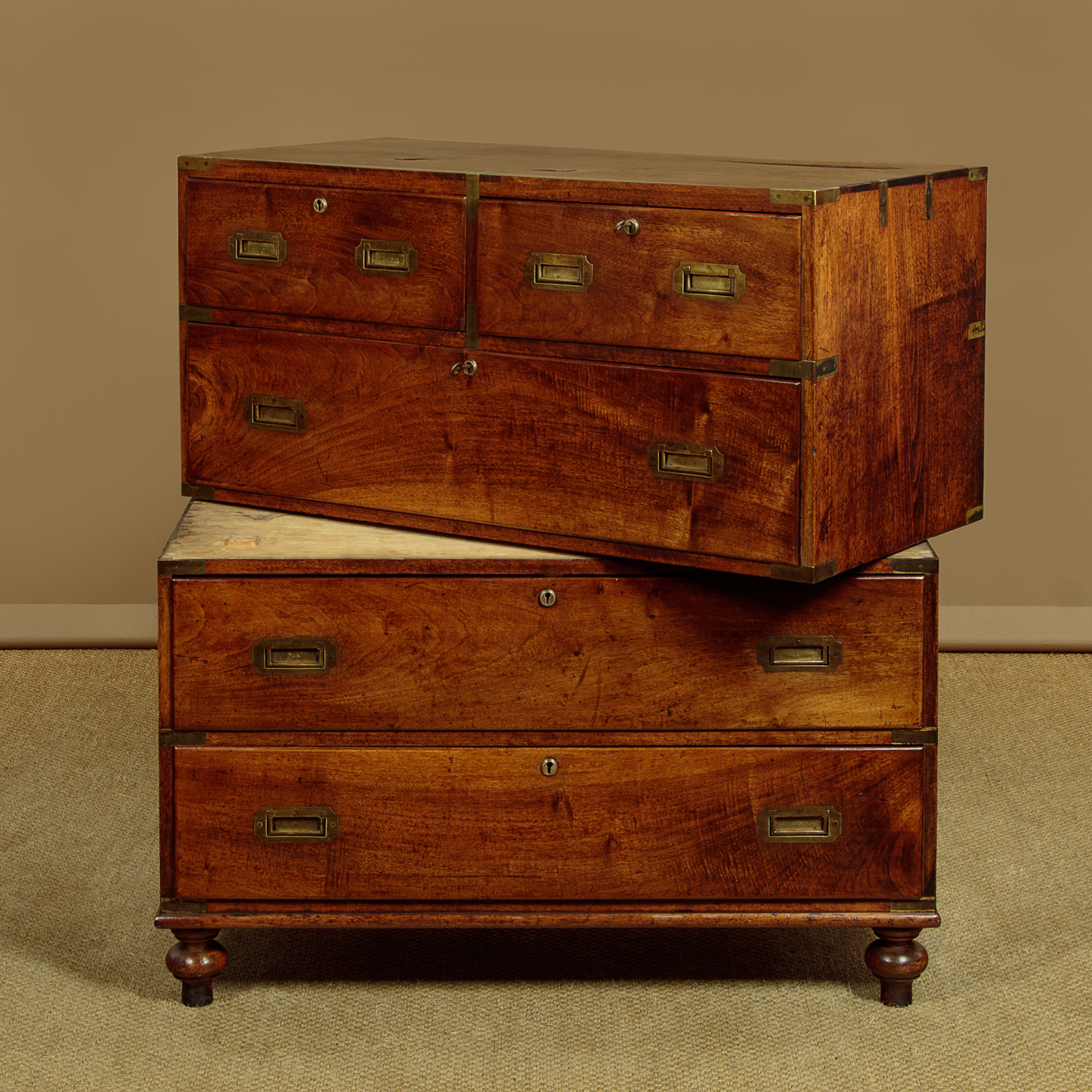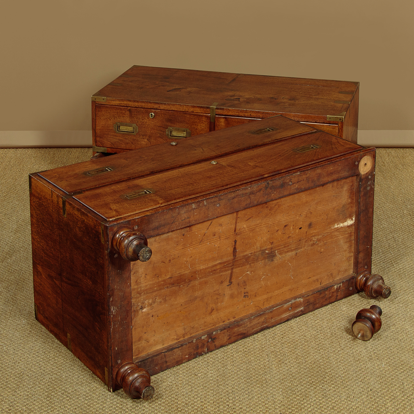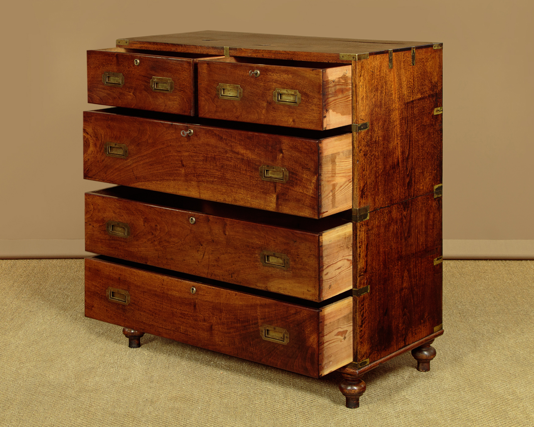 Very good example of the classic 19th.c. campaign chest of drawers c.1860. Designed to travel with an officer on long military campaigns, it is constructed in two sections which fit together to make a chest of two short and three long drawers. The top, drawer fronts and sides are in solid walnut (an unusual choice of timber for campaign furniture) strengthened with brass bindings and corners to protect it from the rigours of travel. Note how the handles are designed to fold flush with the drawer fronts to prevent them from being broken in transit. Likewise the turned feet are removable (or adjustable) with threaded metal fittings. Two old patched repairs to the top where knots in the timber have been removed - these are probably original to the construction of the piece. Plus a repaired split toward the rear right hand corner, which has been reinforced from the underside. Otherwise excellent original colour and condition. Cleaned and waxed in our workshops. Keys supplied.