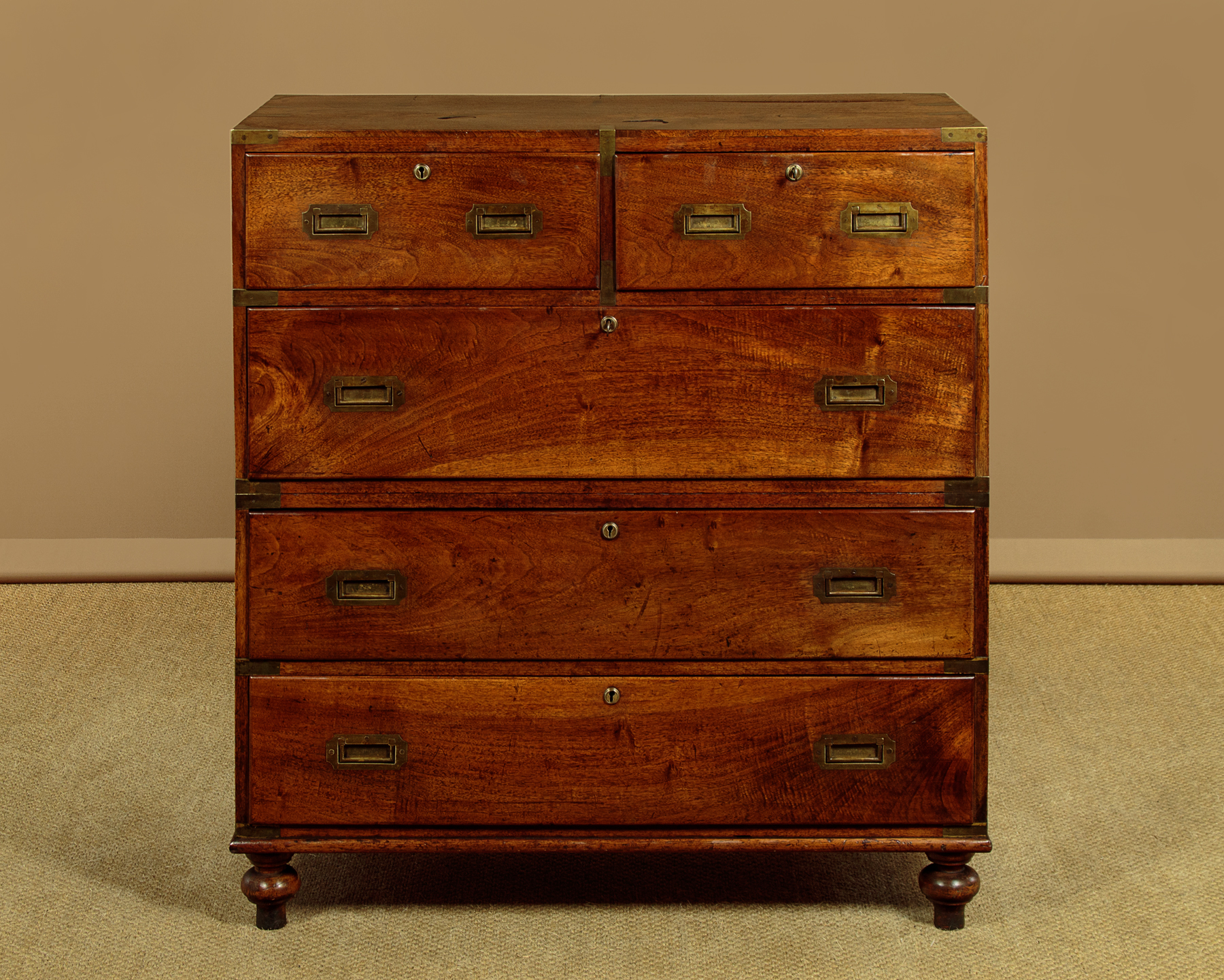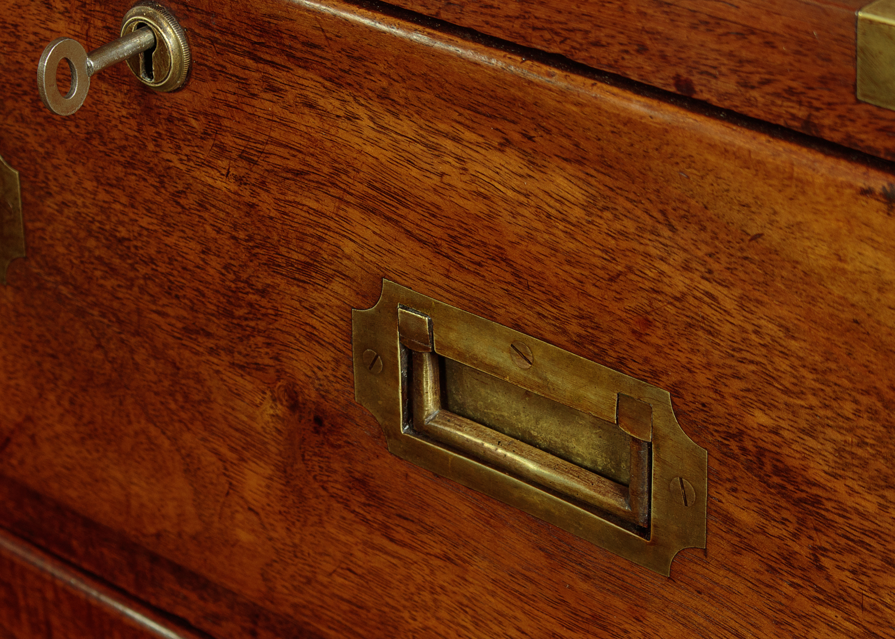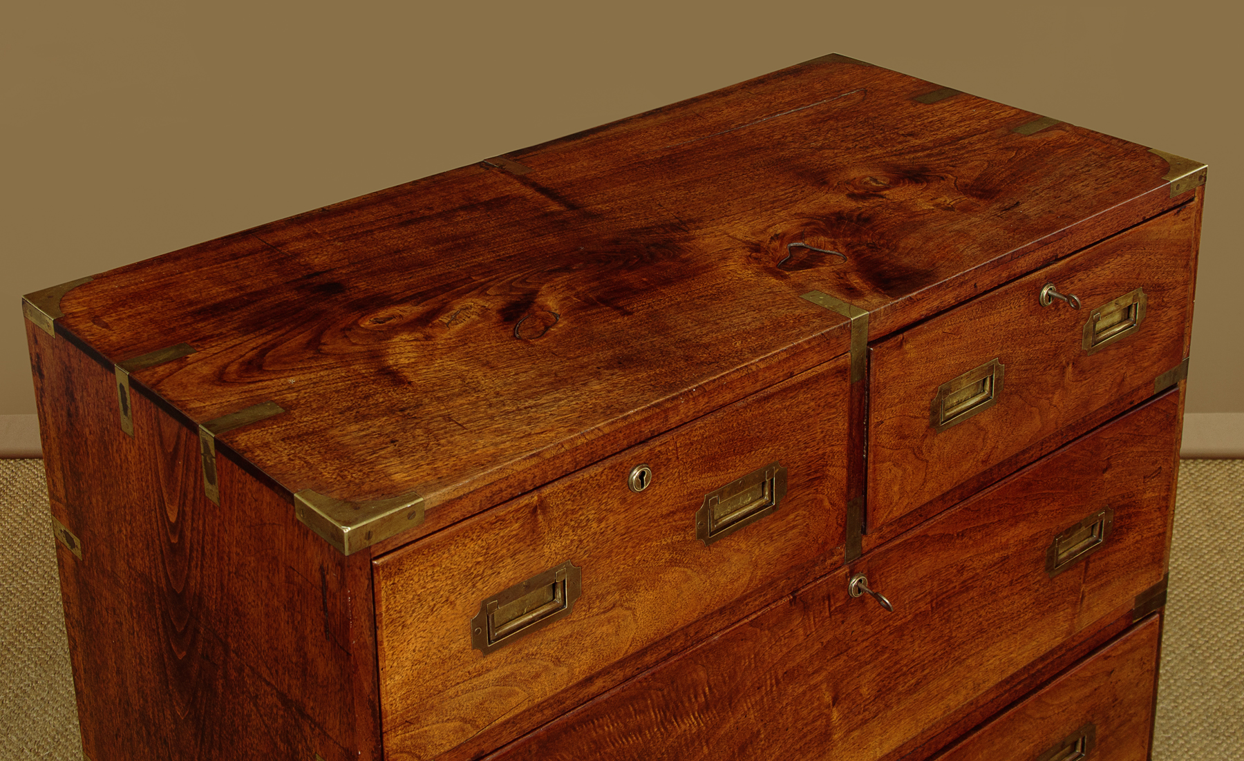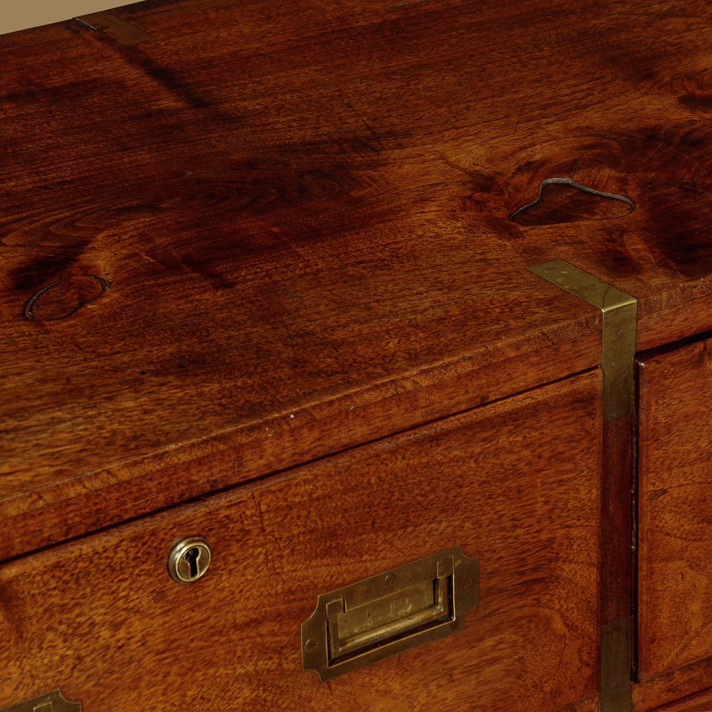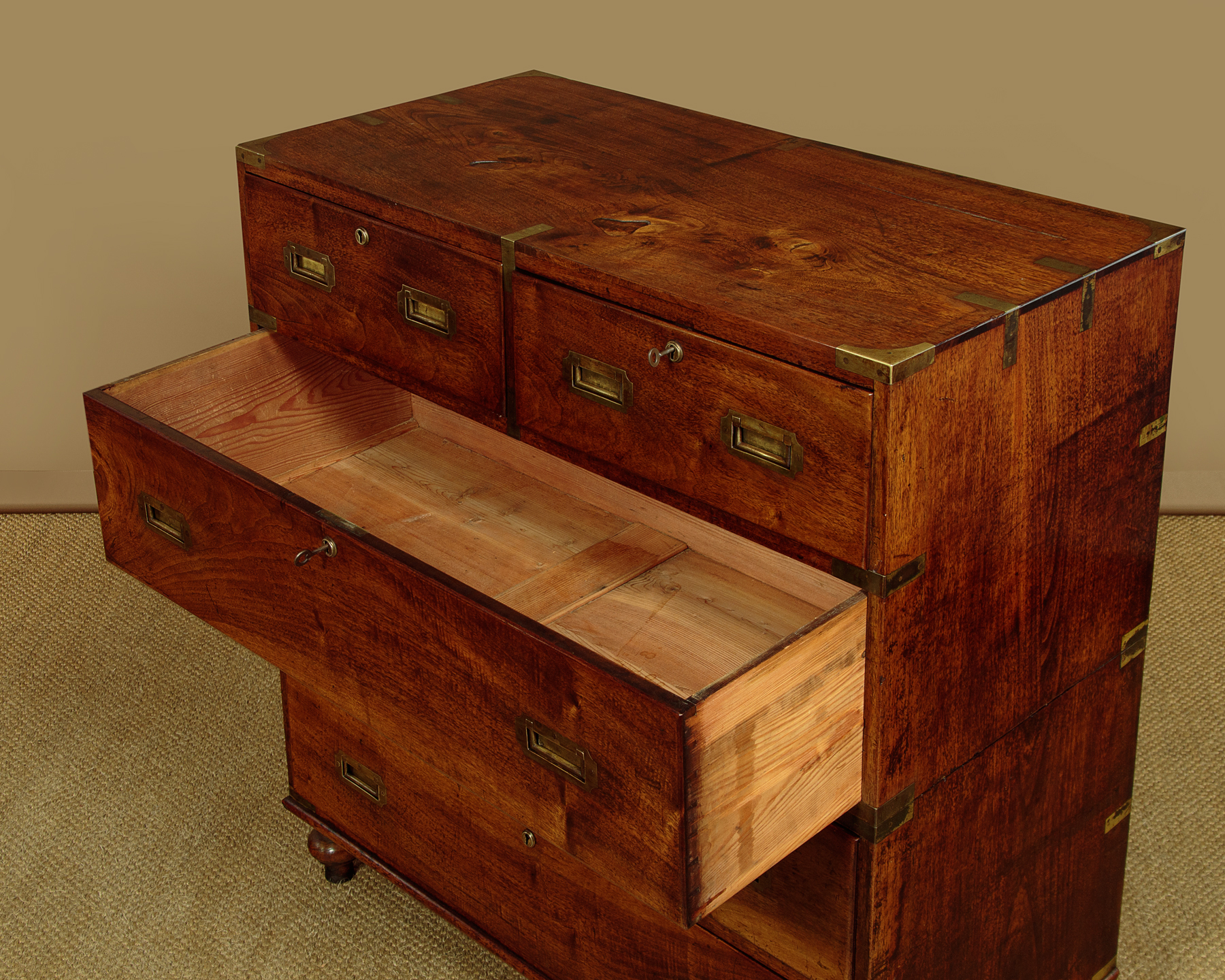 Very good example of the classic 19th.c. campaign chest of drawers c.1860. Designed to travel with an officer on long military campaigns, it is constructed in two sections which fit together to make a chest of two short and three long drawers. The top, drawer fronts and sides are in solid walnut (an unusual choice of timber for campaign furniture) strengthened with brass bindings and corners to protect it from the rigours of travel. Note how the handles are designed to fold flush with the drawer fronts to prevent them from being broken in transit. Likewise the turned feet are removable (or adjustable) with threaded metal fittings. Two old patched repairs to the top where knots in the timber have been removed - these are probably original to the construction of the piece. Plus a repaired split toward the rear right hand corner, which has been reinforced from the underside. Otherwise excellent original colour and condition. Cleaned and waxed in our workshops. Keys supplied.