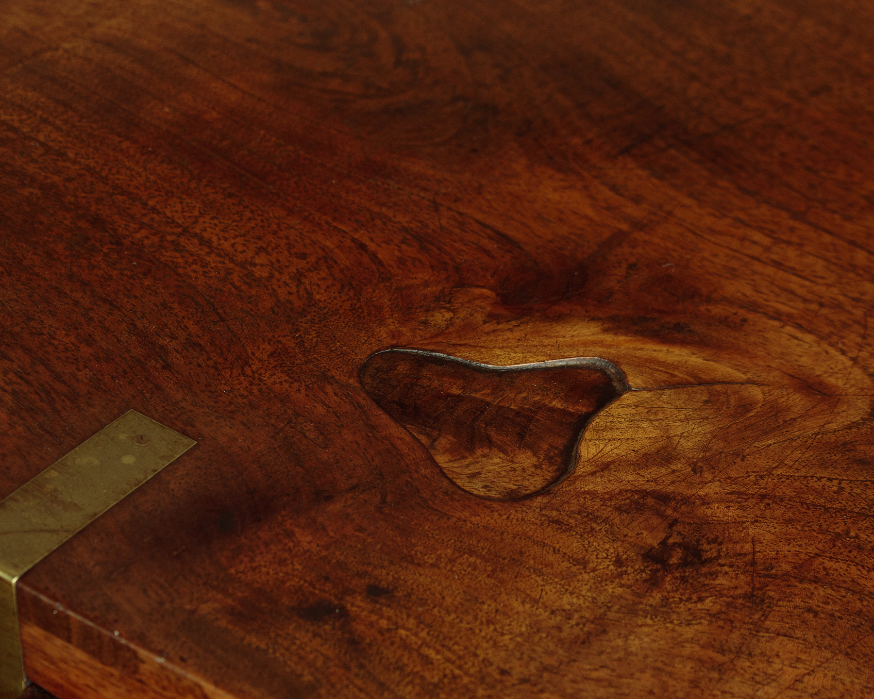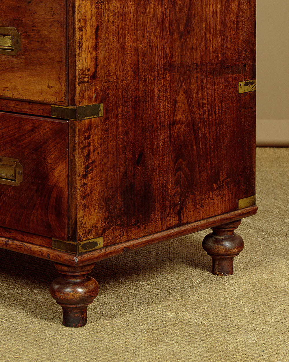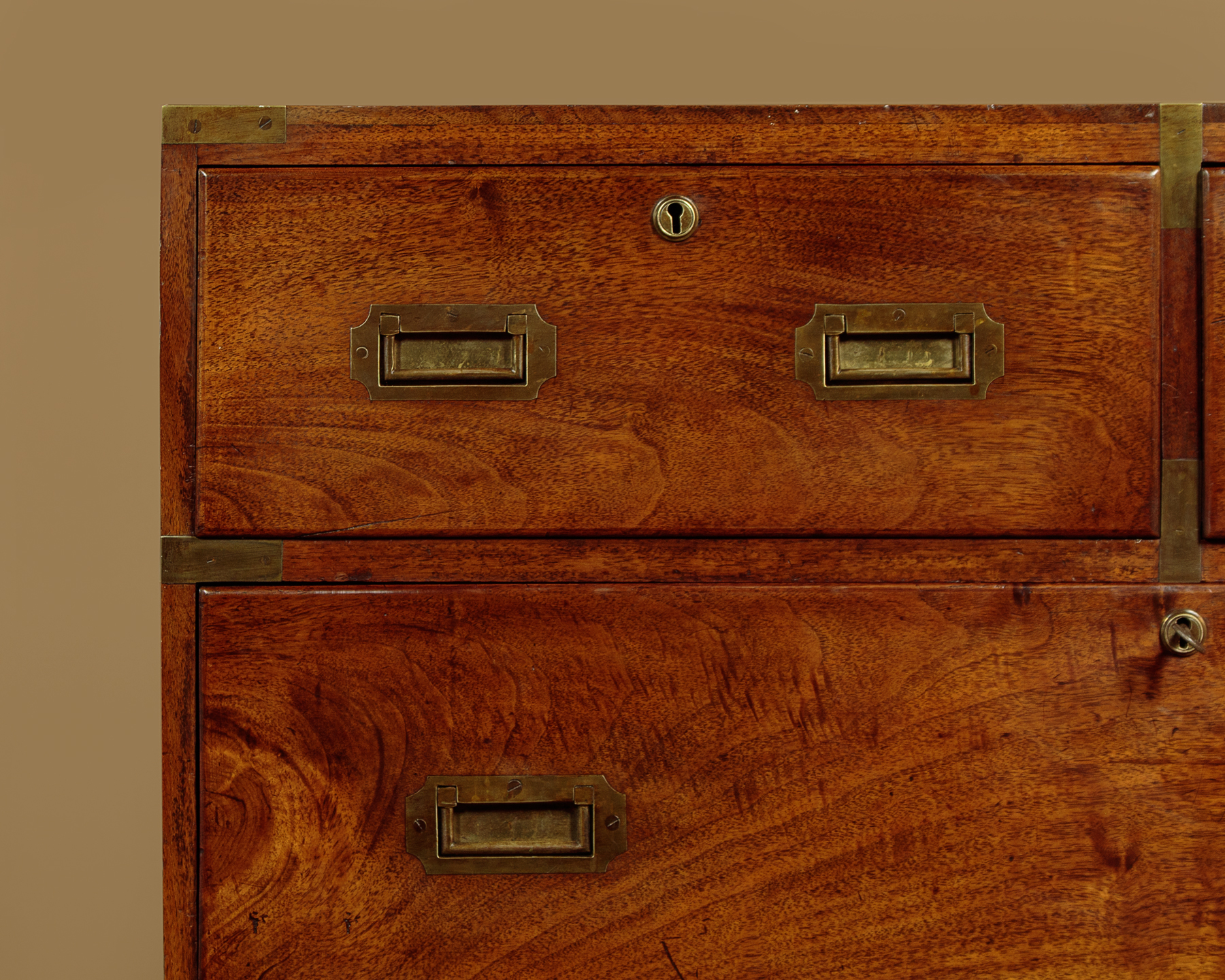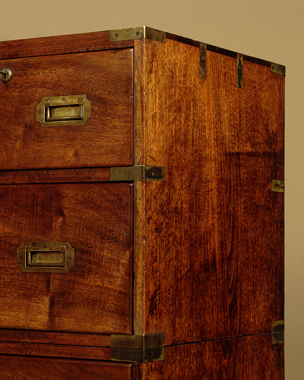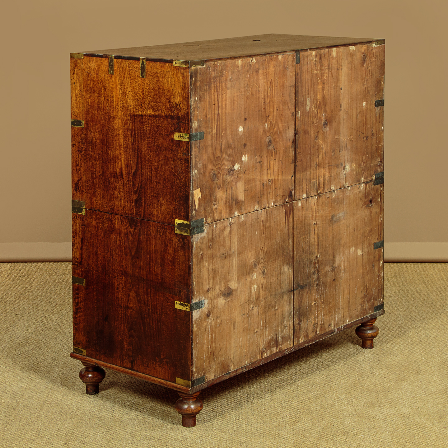 Very good example of the classic 19th.c. campaign chest of drawers c.1860. Designed to travel with an officer on long military campaigns, it is constructed in two sections which fit together to make a chest of two short and three long drawers. The top, drawer fronts and sides are in solid walnut (an unusual choice of timber for campaign furniture) strengthened with brass bindings and corners to protect it from the rigours of travel. Note how the handles are designed to fold flush with the drawer fronts to prevent them from being broken in transit. Likewise the turned feet are removable (or adjustable) with threaded metal fittings. Two old patched repairs to the top where knots in the timber have been removed - these are probably original to the construction of the piece. Plus a repaired split toward the rear right hand corner, which has been reinforced from the underside. Otherwise excellent original colour and condition. Cleaned and waxed in our workshops. Keys supplied.