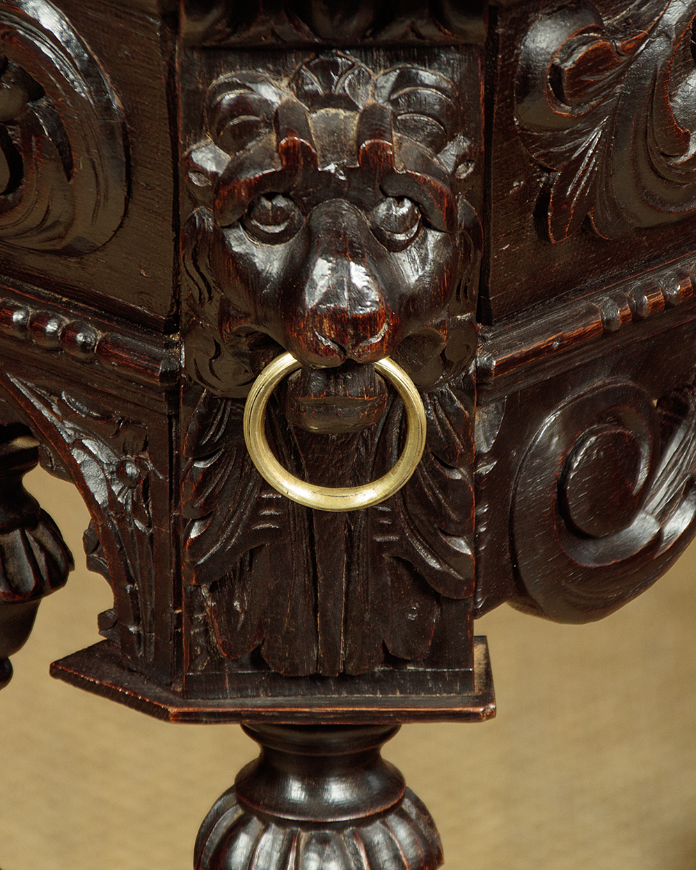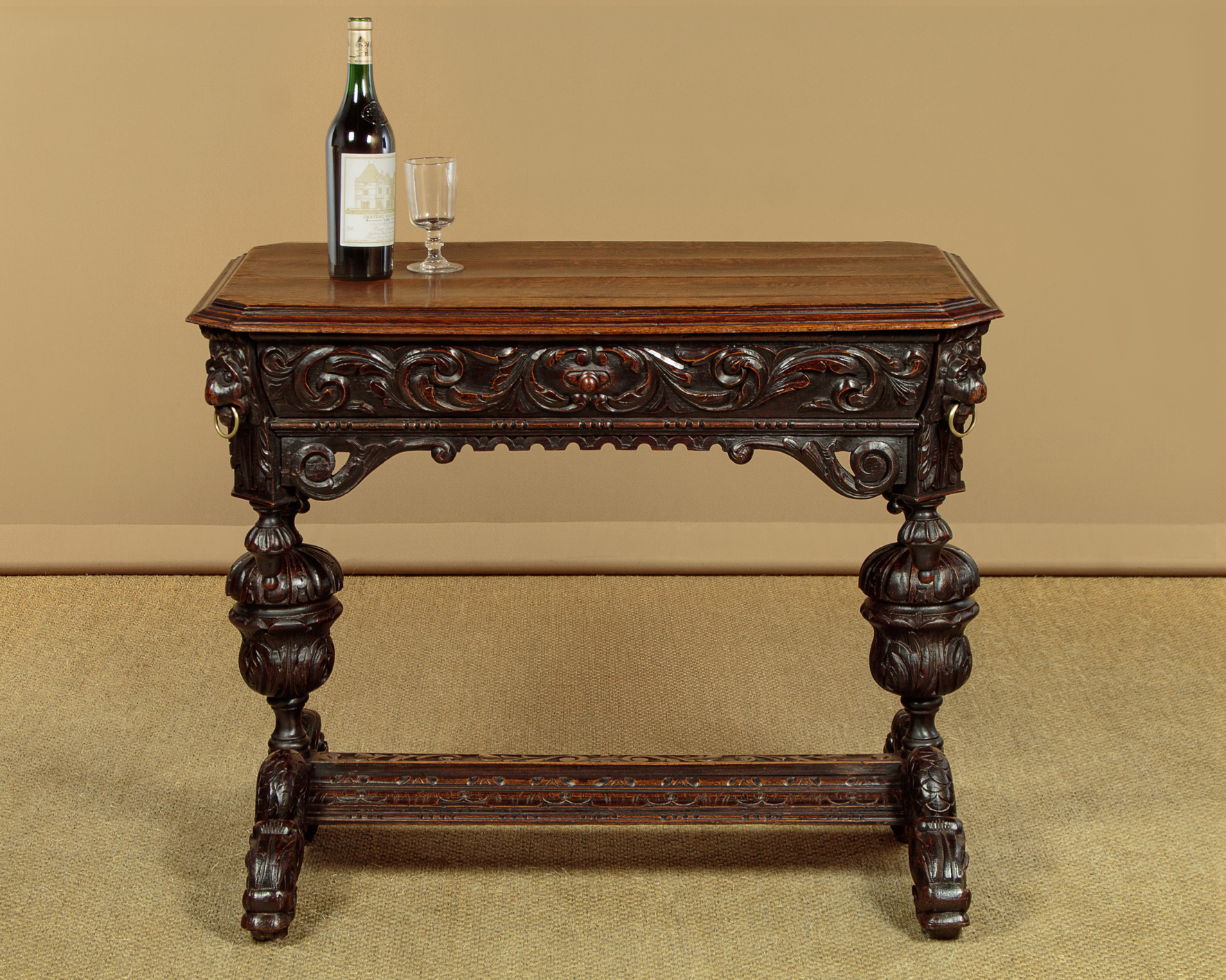 Splendid late 19th.c. Renaissance revival carved oak side table c.1890. Oak top with a deep moulded edge and canted corners over a single drawer. Carved frieze to all four sides with lions masks at the corners, each with a brass ring in it's mouth. Over a shaped and carved apron with turned and carved finial droppers at the sides. Carved cup and cover legs raised on Classical style dolphin shaped feet and joined with a broad carved and moulded stretcher. Excellent condition, cleaned and waxed in our workshops.