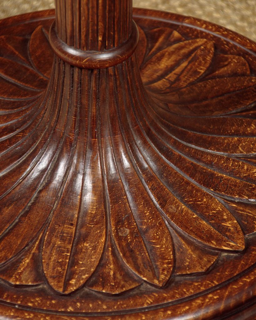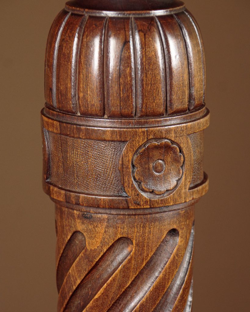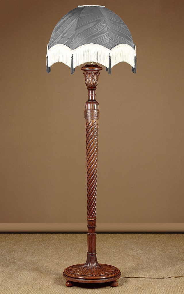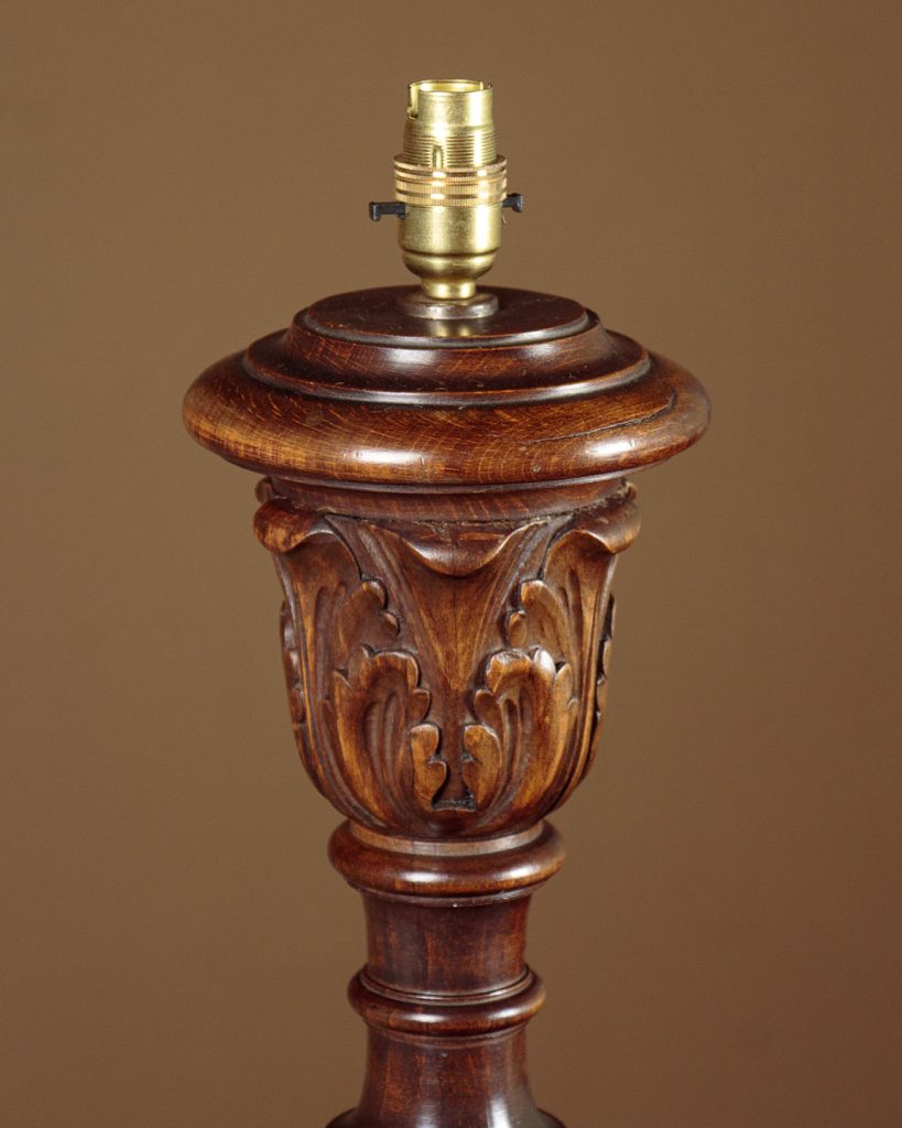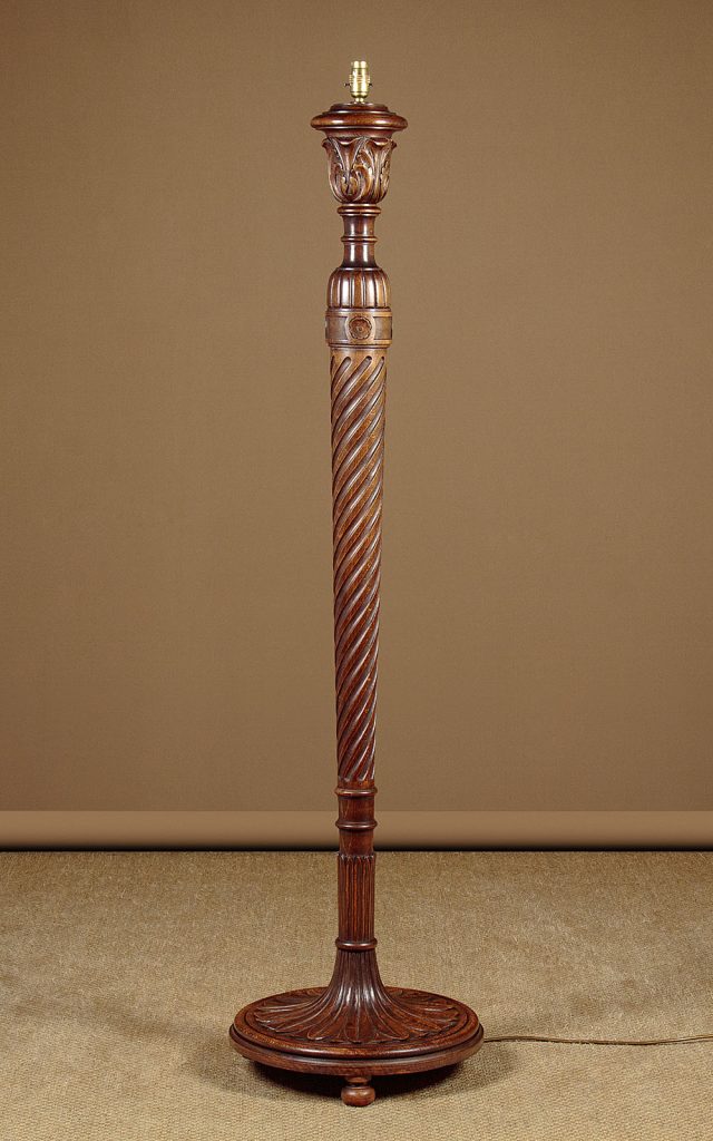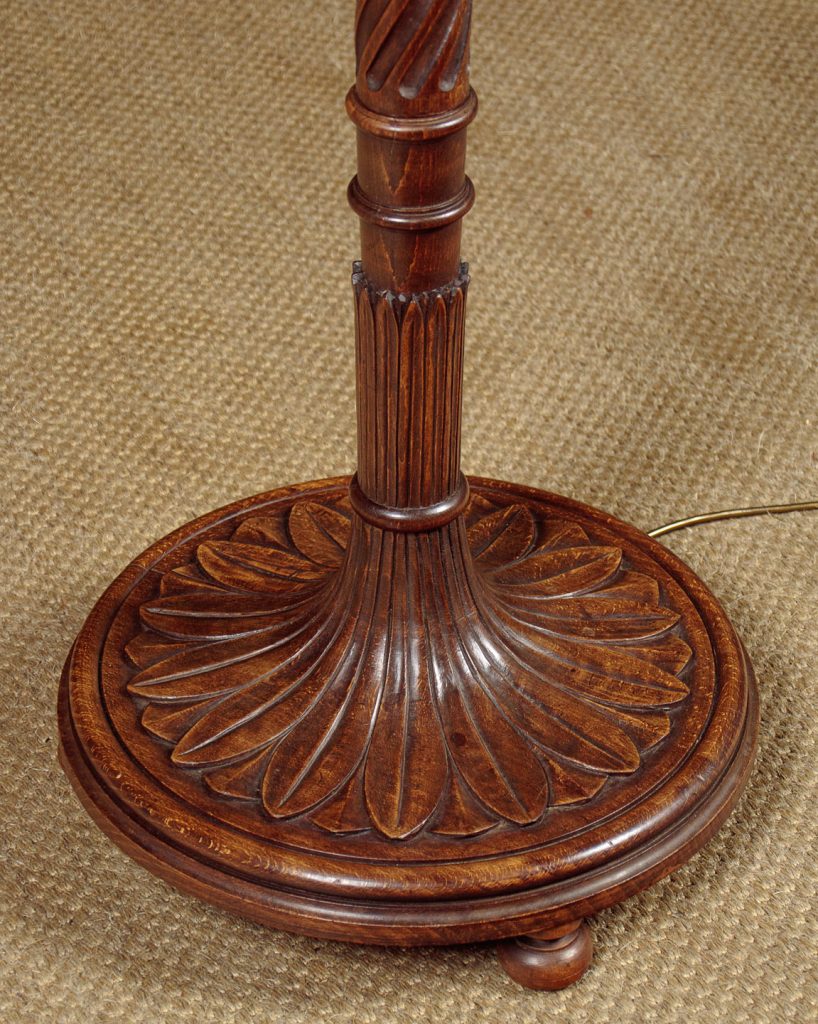 Great quality heavily carved oak standard lamp c.1920. Tapering twist column, beautifully carved at the top with acanthus leaves. Further carved bands towards the base of the column and raised on a large base with three bun feet. Excellent condition, cleaned and waxed. Rewired and sold with a PAT test certificate.