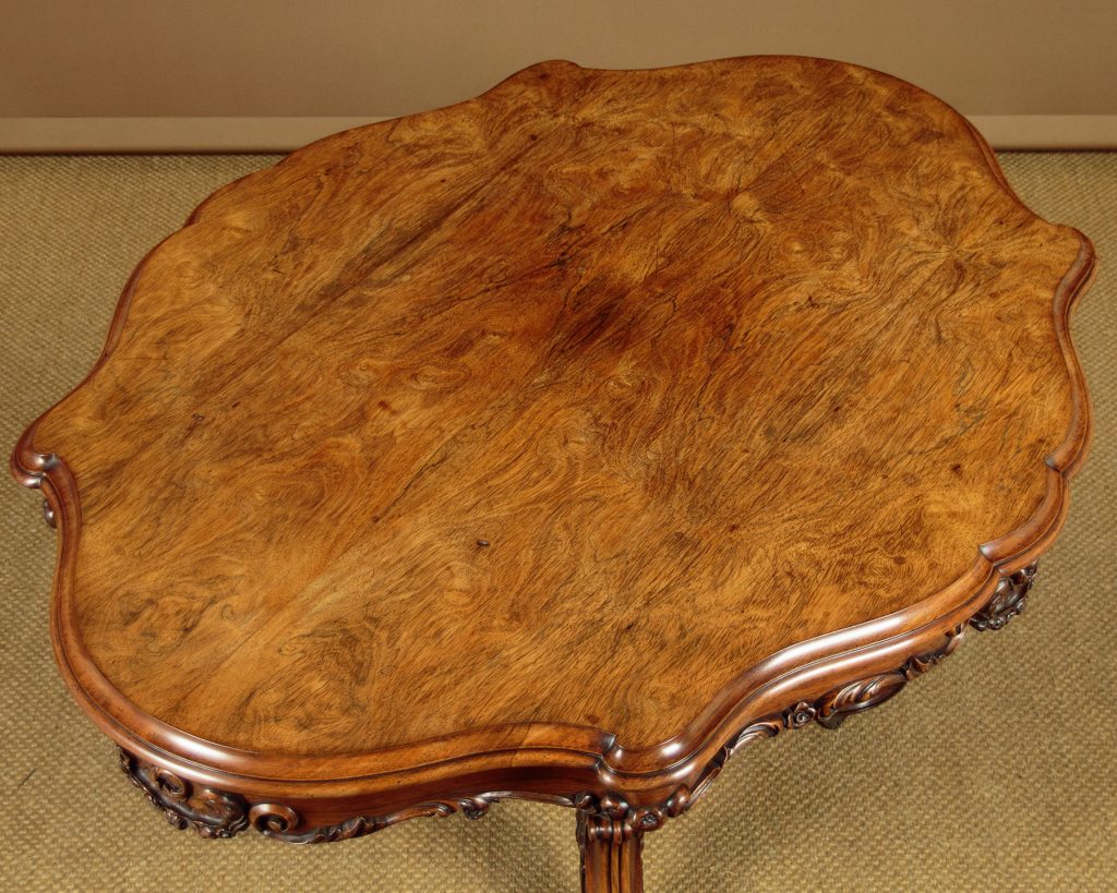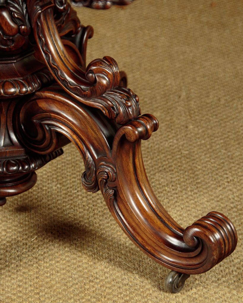 Splendid mid 19th.c. rosewood centre table c.1860. Symmetrical rosewood veneered top with a serpentine shaped and deep moulded edge over a carved apron. Big enough to seat four people. Raised on a remarkable elaborate carved pedestal featuring a turned central column with acanthus carving over octagonal base with gadroon edges. The column is surrounded by separate acanthus carved supports over scrolling legs with the original wooden castors below. Excellent colour and condition, cleaned and waxed in our workshops.