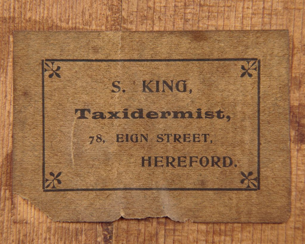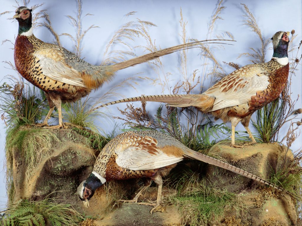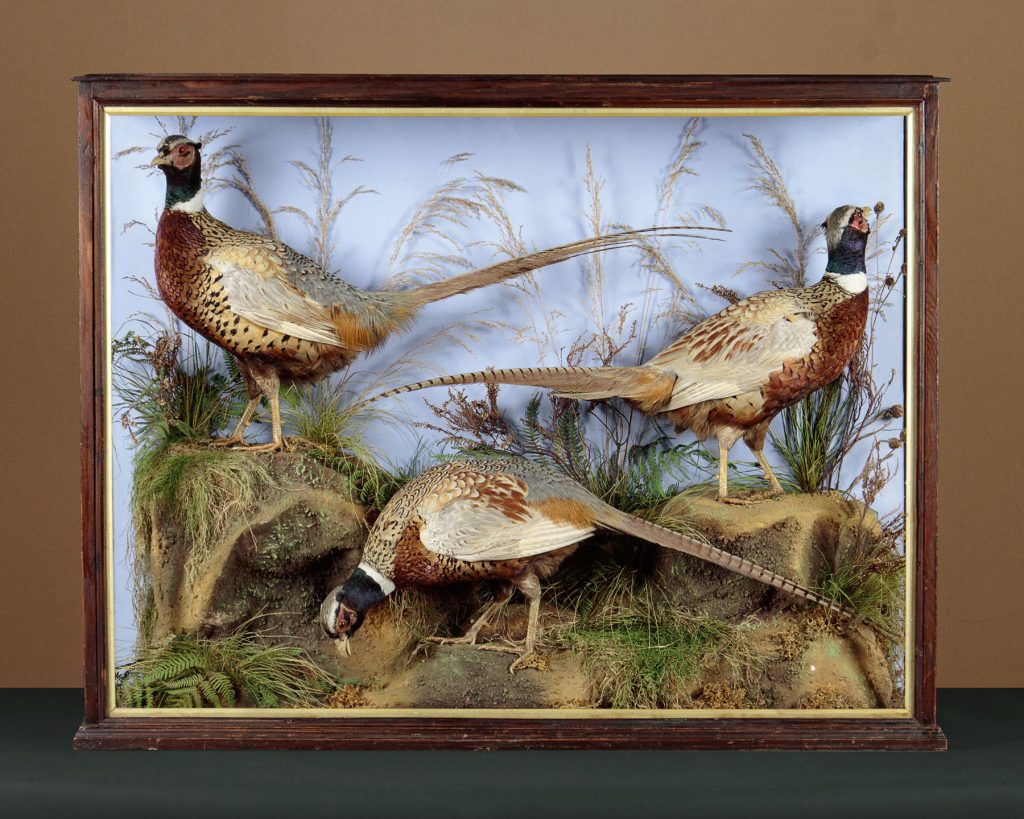 Splendid large cased taxidermy display of pheasants by S.King of Hereford c.1910. Three cock pheasants in a naturalistic arrangement, presented on artificial rocks with grasses heathers and ferns against a blue painted background. Wooden case glazed at the front and sides, with moulded cornice and base and a gilded moulding to the front. Paper label on the rear for S.King Taxidermist, 78 Elgin St Hereford. Some minor wear to case, generally very good condition.