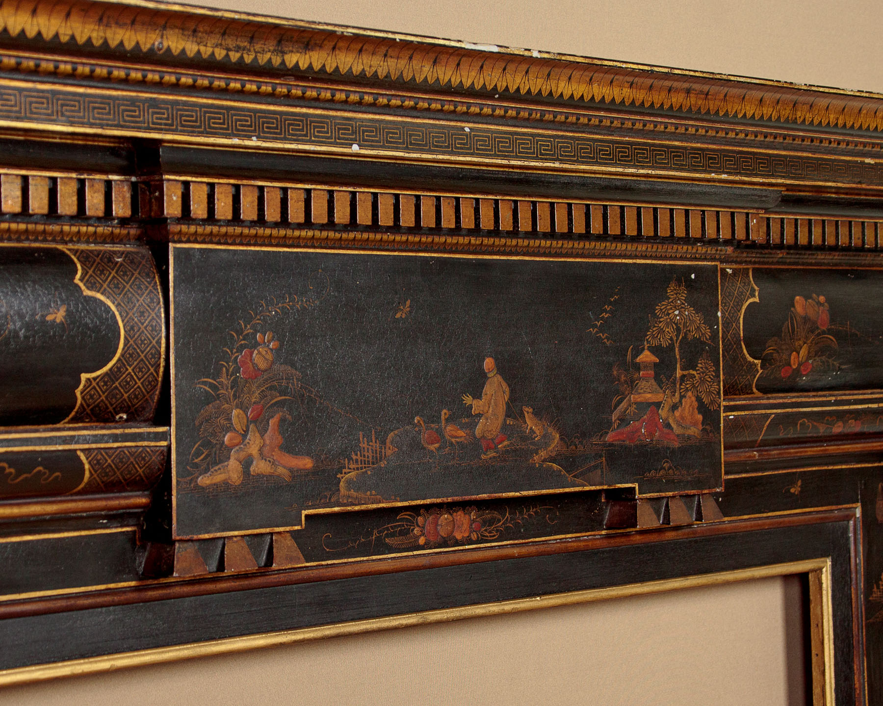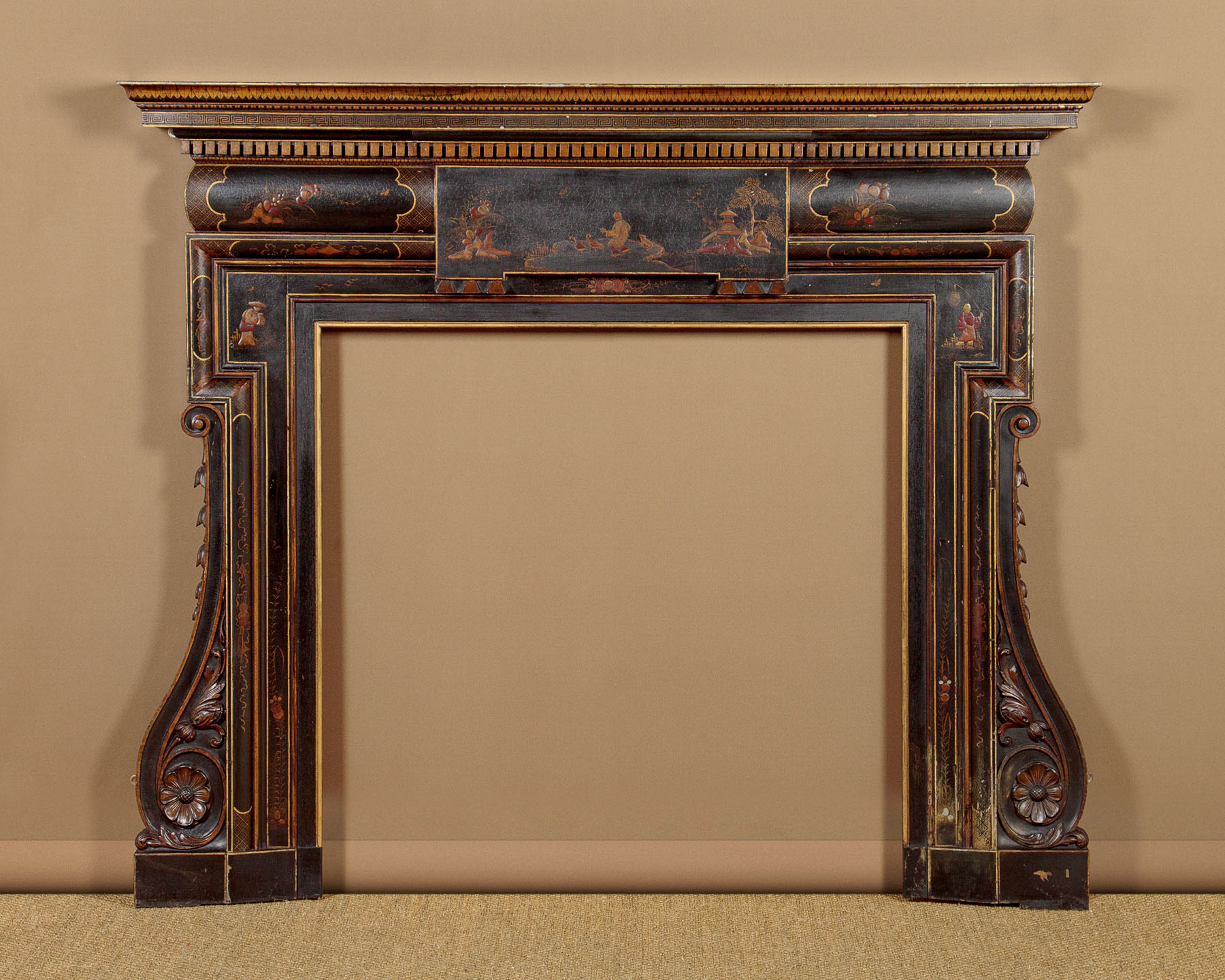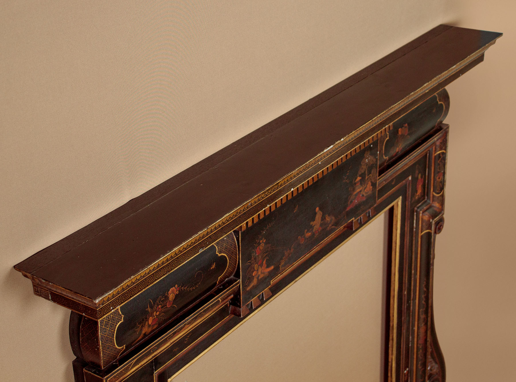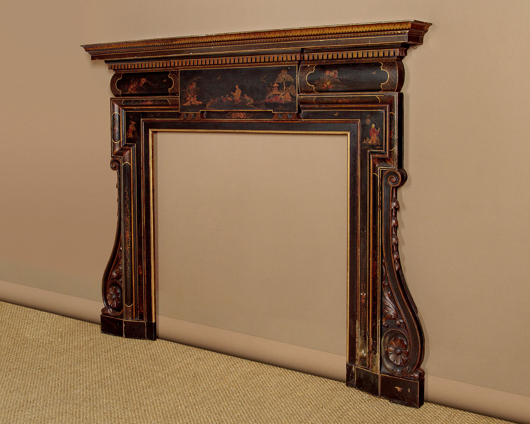 Unusual Chinoiserie lacquered fire surround c.1910. Wooden fire surround with a 7" deep mantelpiece and 38" x 38" aperture. Moulded cornice and dentil frieze over a moulded surround with carved scrolling foliage and harebell garlands at the sides. Decorated with oriental figures, landscape elements and plants in raised lacquerwork with hand painted against a black ground. Additional leaf, Greek key and trellis detail in gold paint, which is also used to highlight the mouldings. Presented as found, an extra 1½" depth appears to have been added to the rear edge of the surround at the top and sides (could be removed if preferred). Very good condition with only minor wear to the paintwork.