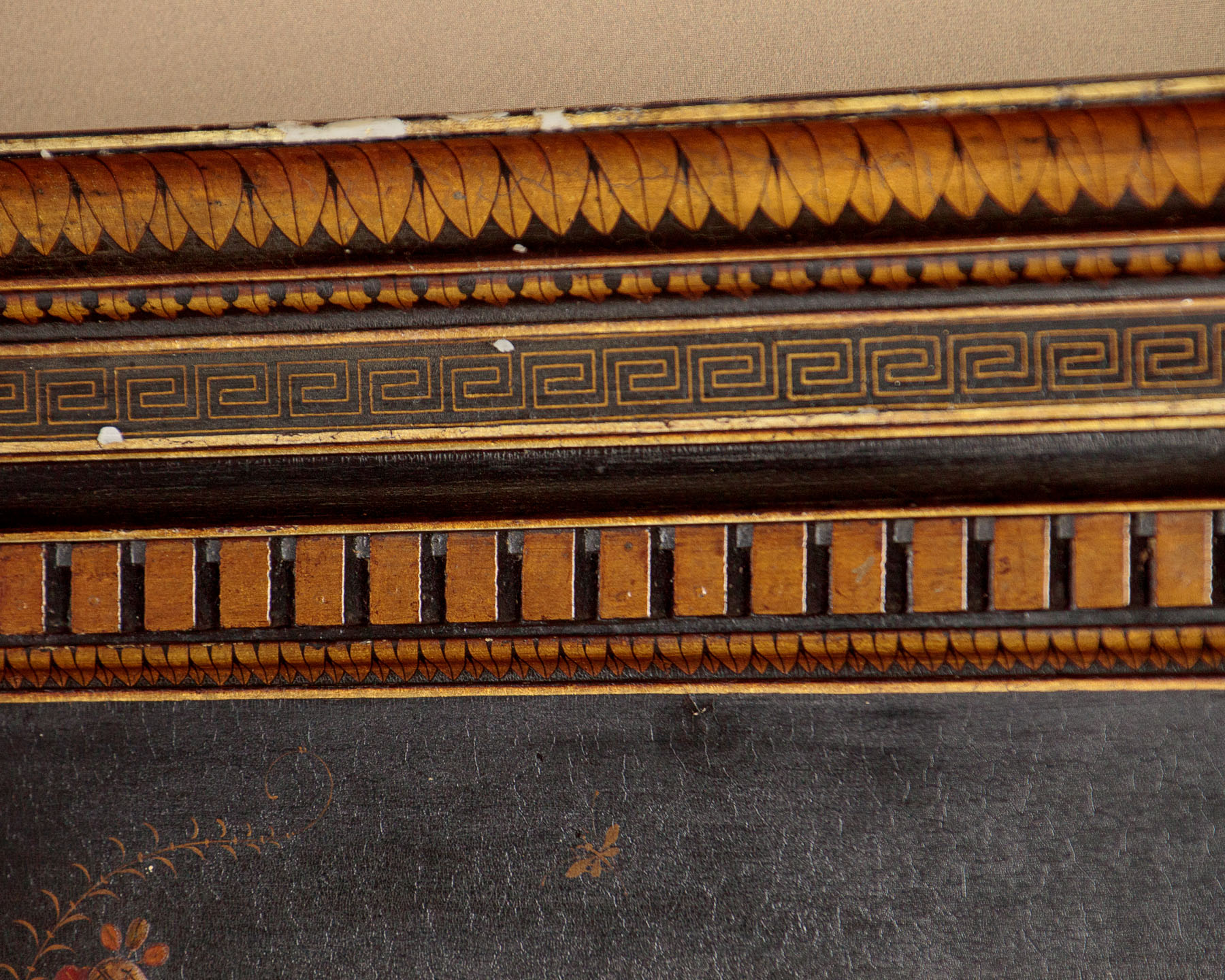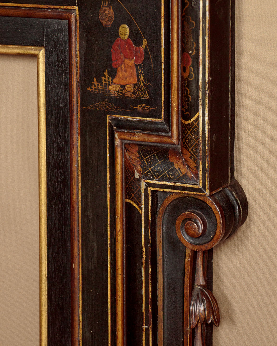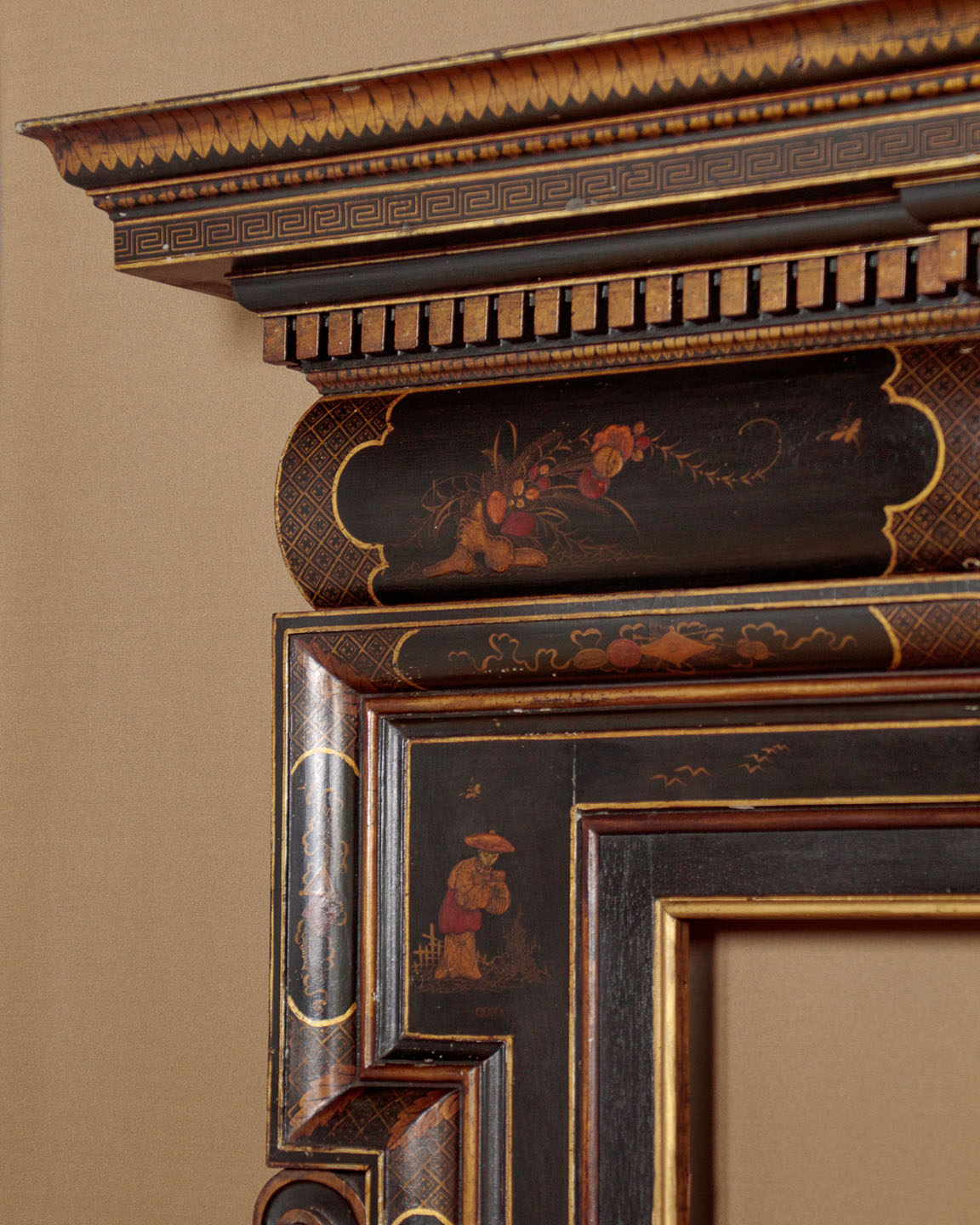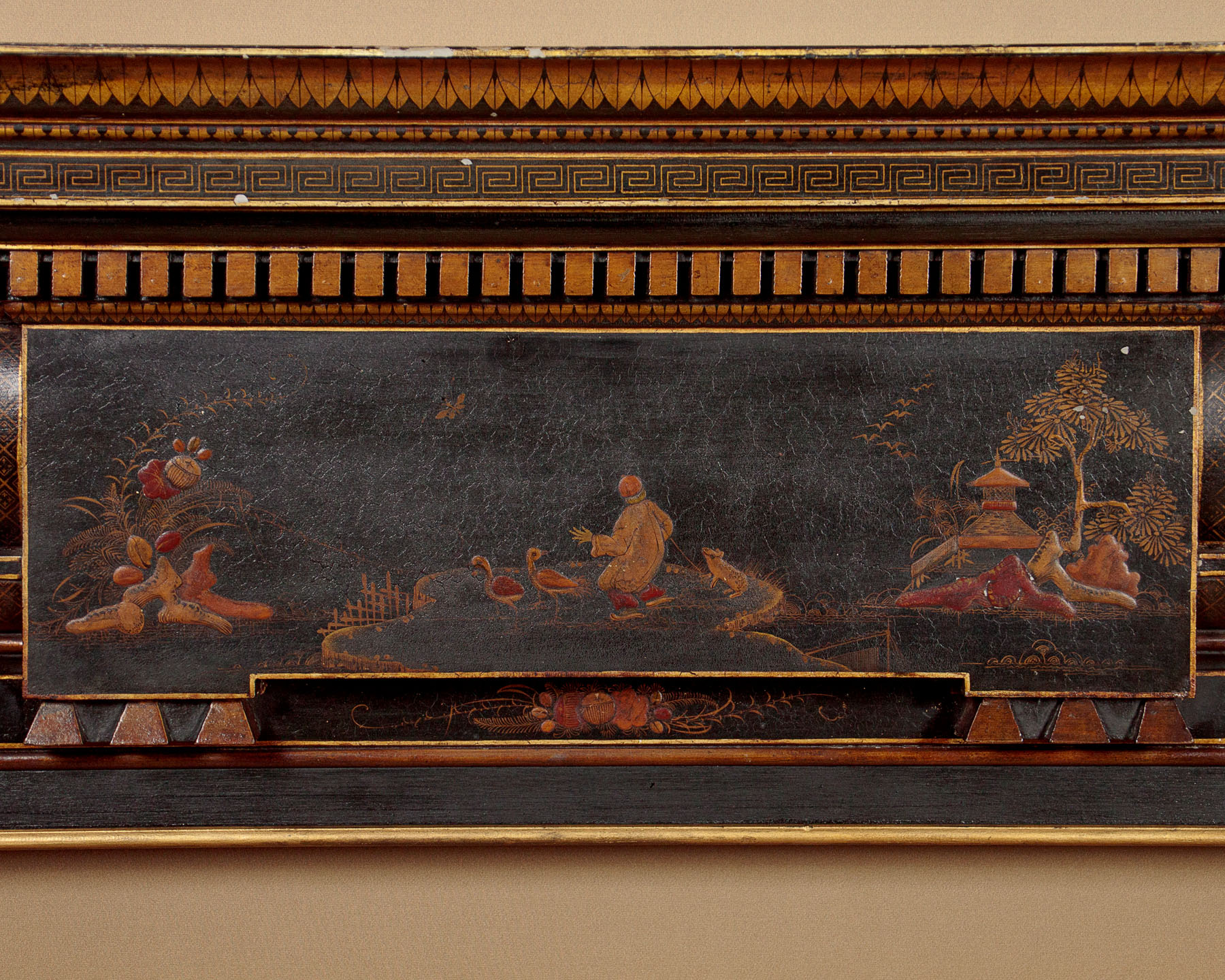 Unusual Chinoiserie lacquered fire surround c.1910. Wooden fire surround with a 7" deep mantelpiece and 38" x 38" aperture. Moulded cornice and dentil frieze over a moulded surround with carved scrolling foliage and harebell garlands at the sides. Decorated with oriental figures, landscape elements and plants in raised lacquerwork with hand painted against a black ground. Additional leaf, Greek key and trellis detail in gold paint, which is also used to highlight the mouldings. Presented as found, an extra 1½" depth appears to have been added to the rear edge of the surround at the top and sides (could be removed if preferred). Very good condition with only minor wear to the paintwork.