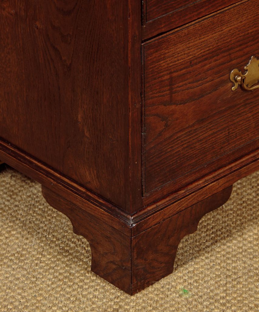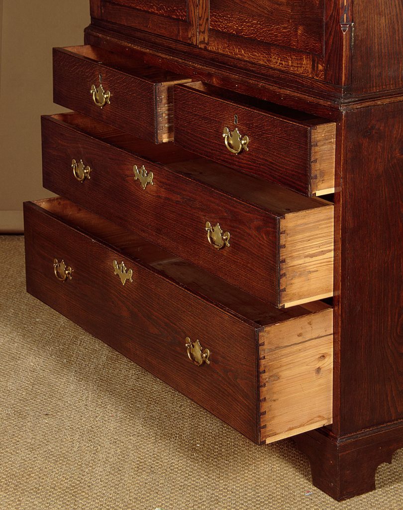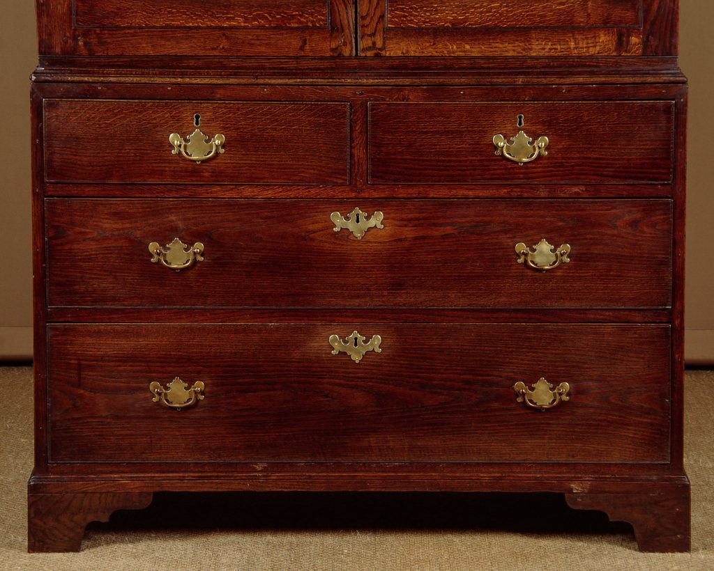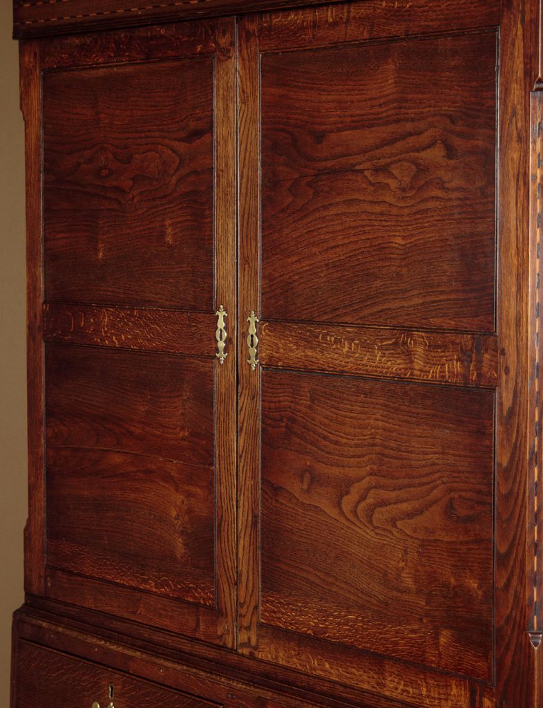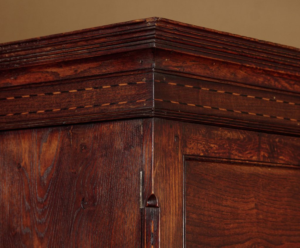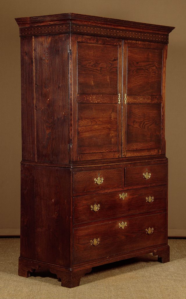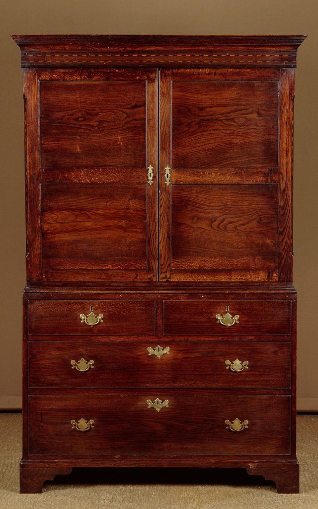 Very useful early 19th.c. Welsh oak kitchen cupboard or linen press c.1810. Large two door cupboard top fitted inside with two adjustable shelves (depth 19"). Over a chest of two short and two long drawers of graduated height. Moulded cornice over a lovely inlaid frieze of contrasting timbers, continued on the sides and repeated on the canted outer edges of the doors. Flat door panels of particularly good grain. Solid oak drawer fronts with Georgian pattern brass handles. Ogee mouldings at the waist and around the base. Solid oak sides, raised on bracket feet front and rear. Excellent colour and condition, cleaned and waxed in our workshops. Key supplied.