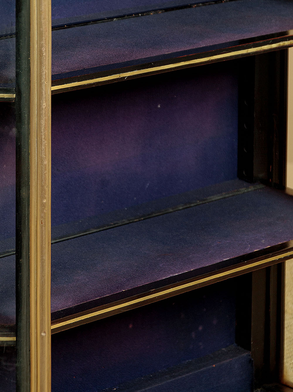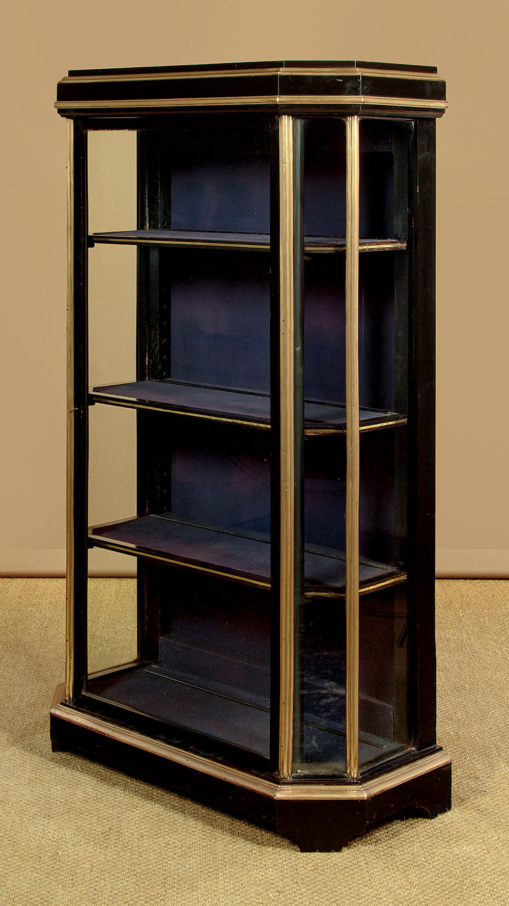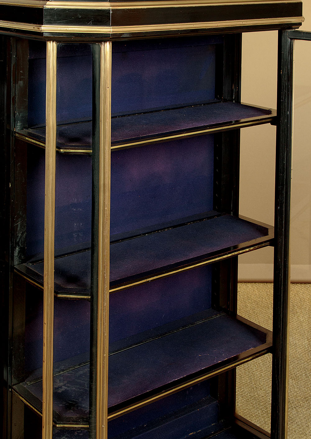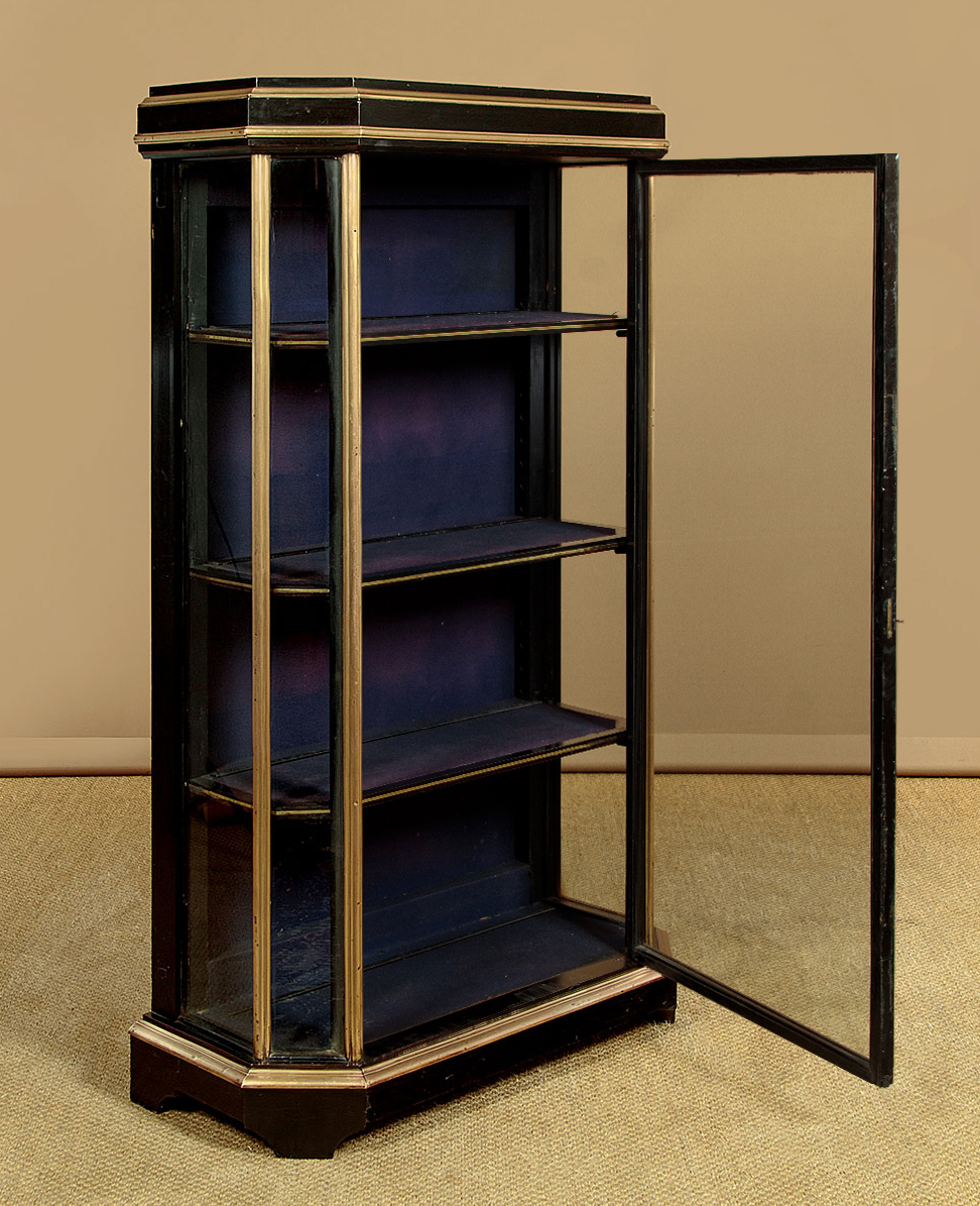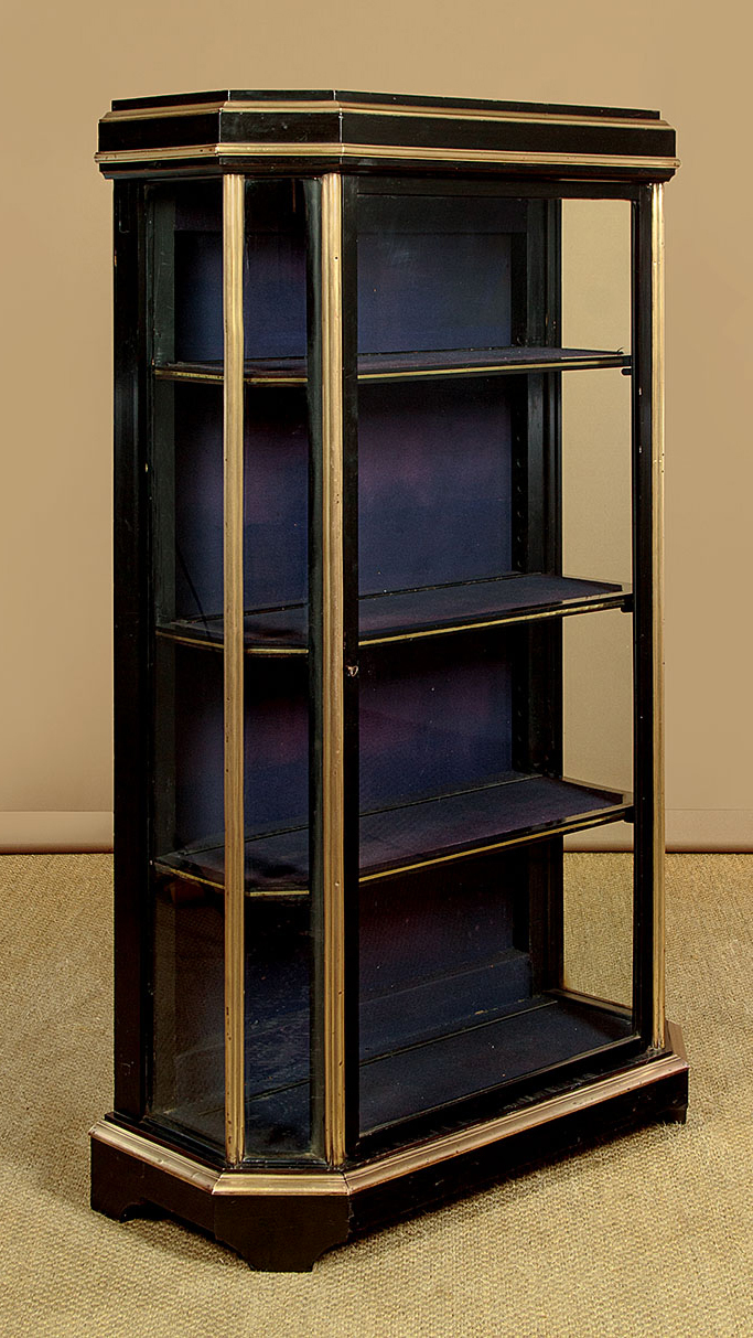 Very smart ebonised and brass mounted vitrine or display cabinet c.1920. Single door cabinet fitted with three shelves inside (internal depth 10½") and lined in dark blue baize. Canted corners and sides also glazed. Ebonised hardwood frame with extensive brass mouldings to dramatic effect. Note the brass inlay to the front edge of the shelves. Shaped detail to the feet at the front and sides. Some surface wear to the exterior and wear to the lining fabric. Generally very good condition, cleaned and waxed in our workshops. Key supplied.