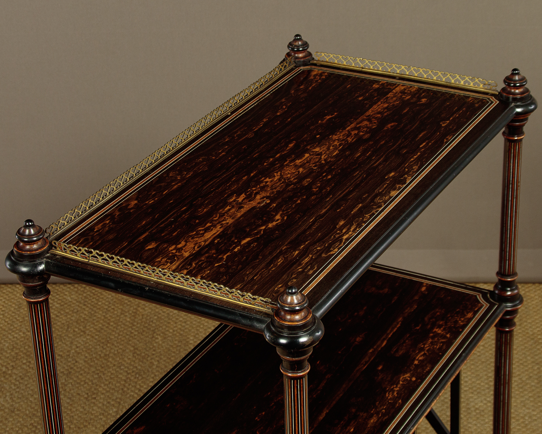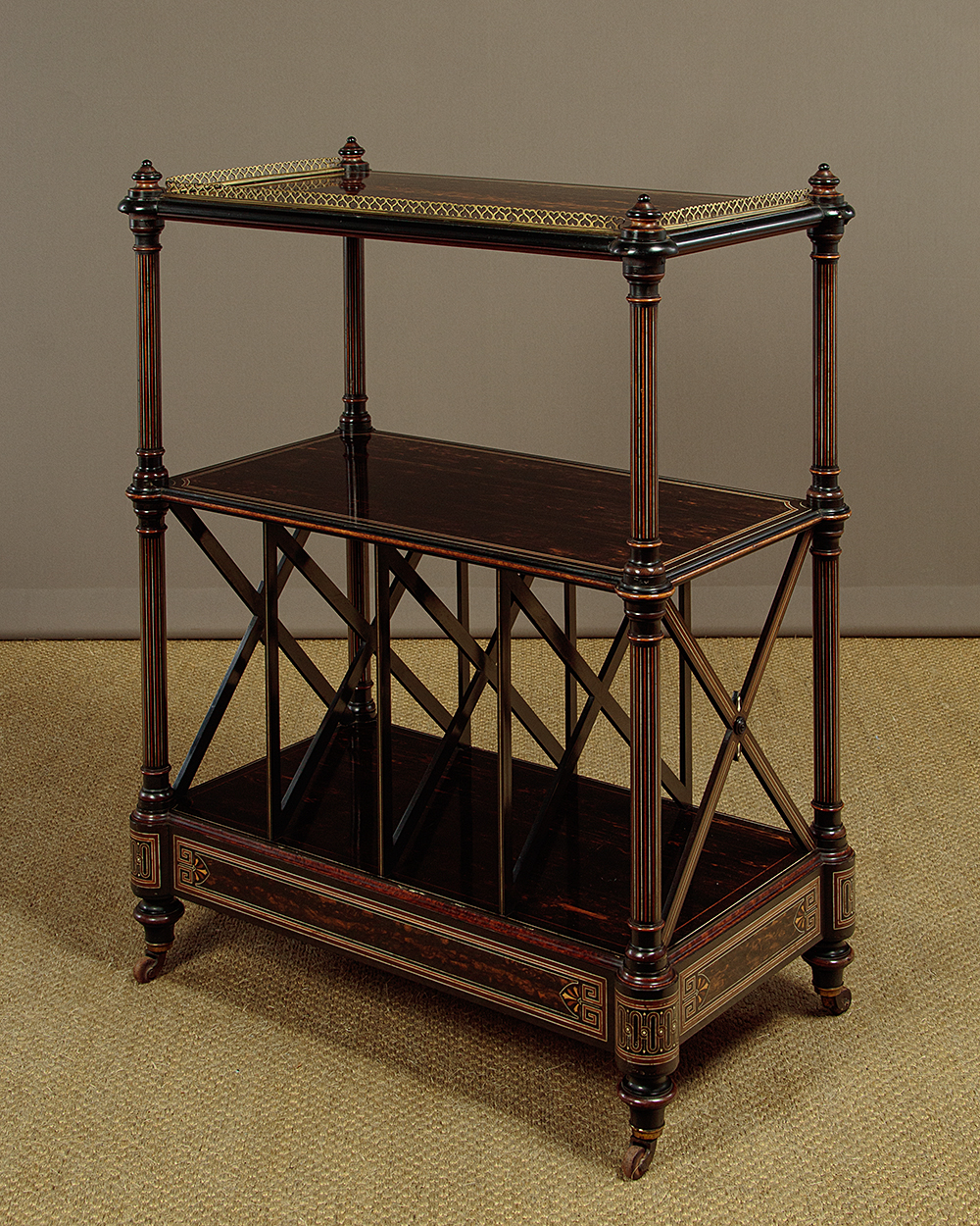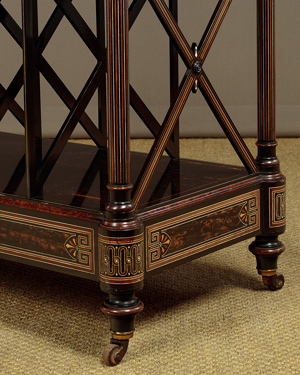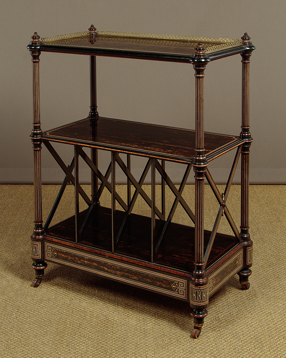 Exceptional quality canterbury and side table in coromandel with fabulous inlaid detail in the manner of Owen Jones c.1860. Two open shelves over a canterbury or book rack with X shape dividers, plus a single drawer in the base. Veneered in beautifully figured coromandel with a brass gallery to the top shelf with delightful heart-shaped pierced detail, mahogany and ebony inlaid borders, ivory stringing and ebonised mouldings. Raised on turned columns with fine inlaid stringing all round, turned finial tops and moulded and ebonised elements. The inlay continues on the ends of the canterbury and reaches a crescendo with the superb Classical Greek inspired detail on all four sides of the plinth and on the projecting corners. Raised on short turned feet with wooden castors. Missing a few small pieces of the curved moulding from around the underside where the columns join the top shelf. Generally excellent colour and condition, cleaned and waxed in our workshops.