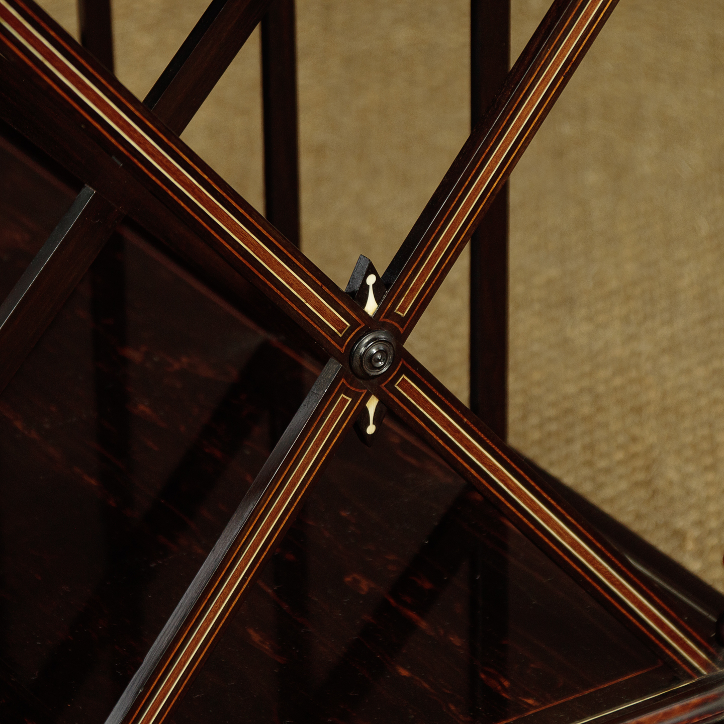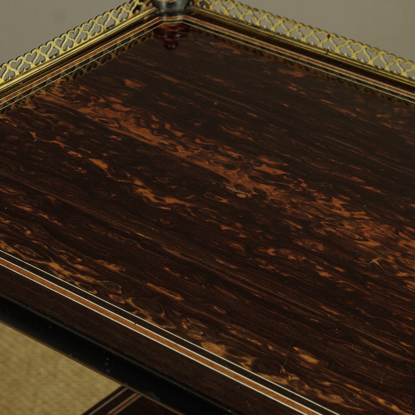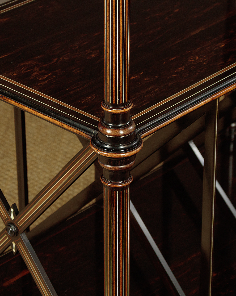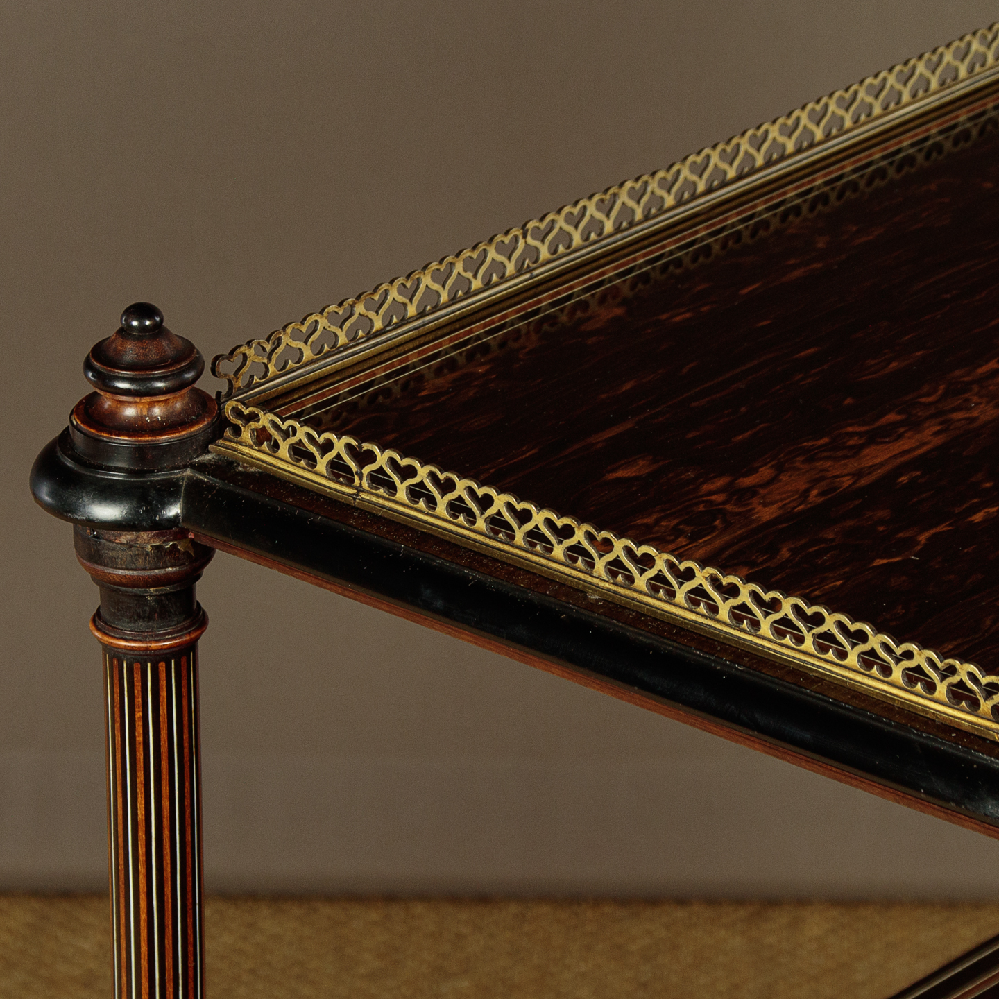 Exceptional quality canterbury and side table in coromandel with fabulous inlaid detail in the manner of Owen Jones c.1860. Two open shelves over a canterbury or book rack with X shape dividers, plus a single drawer in the base. Veneered in beautifully figured coromandel with a brass gallery to the top shelf with delightful heart-shaped pierced detail, mahogany and ebony inlaid borders, ivory stringing and ebonised mouldings. Raised on turned columns with fine inlaid stringing all round, turned finial tops and moulded and ebonised elements. The inlay continues on the ends of the canterbury and reaches a crescendo with the superb Classical Greek inspired detail on all four sides of the plinth and on the projecting corners. Raised on short turned feet with wooden castors. Missing a few small pieces of the curved moulding from around the underside where the columns join the top shelf. Generally excellent colour and condition, cleaned and waxed in our workshops.