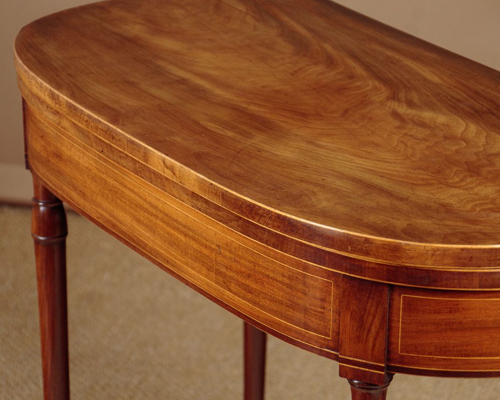 George III mahogany fold over games table c.1800. Stands flat against the wall as a console or side table or open the hinged rear legs and fold open the top to make a square card table for four people with a green baize playing surface. Well figured flame mahogany veneered top with crossbanded edges and inlaid boxwood stringing continued on the apron. Raised on slim turned and tapering legs front and rear. Original brass hinges. Excellent colour and condition, cleaned and waxed in our workshops.