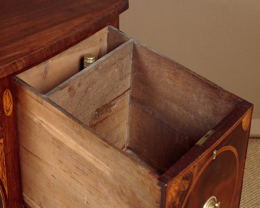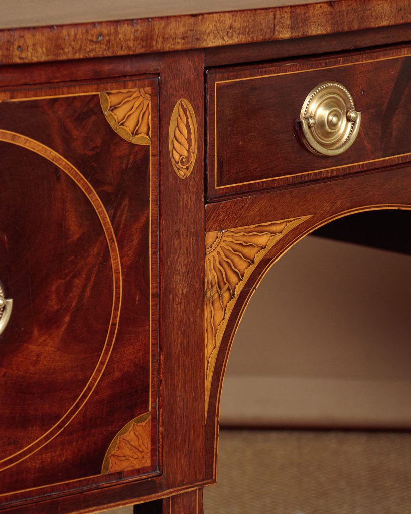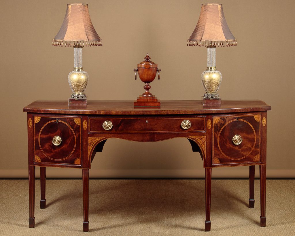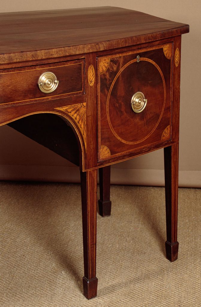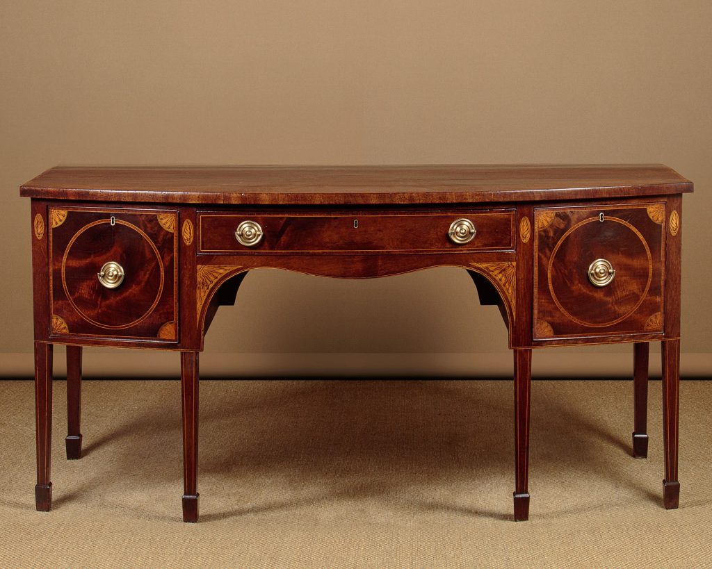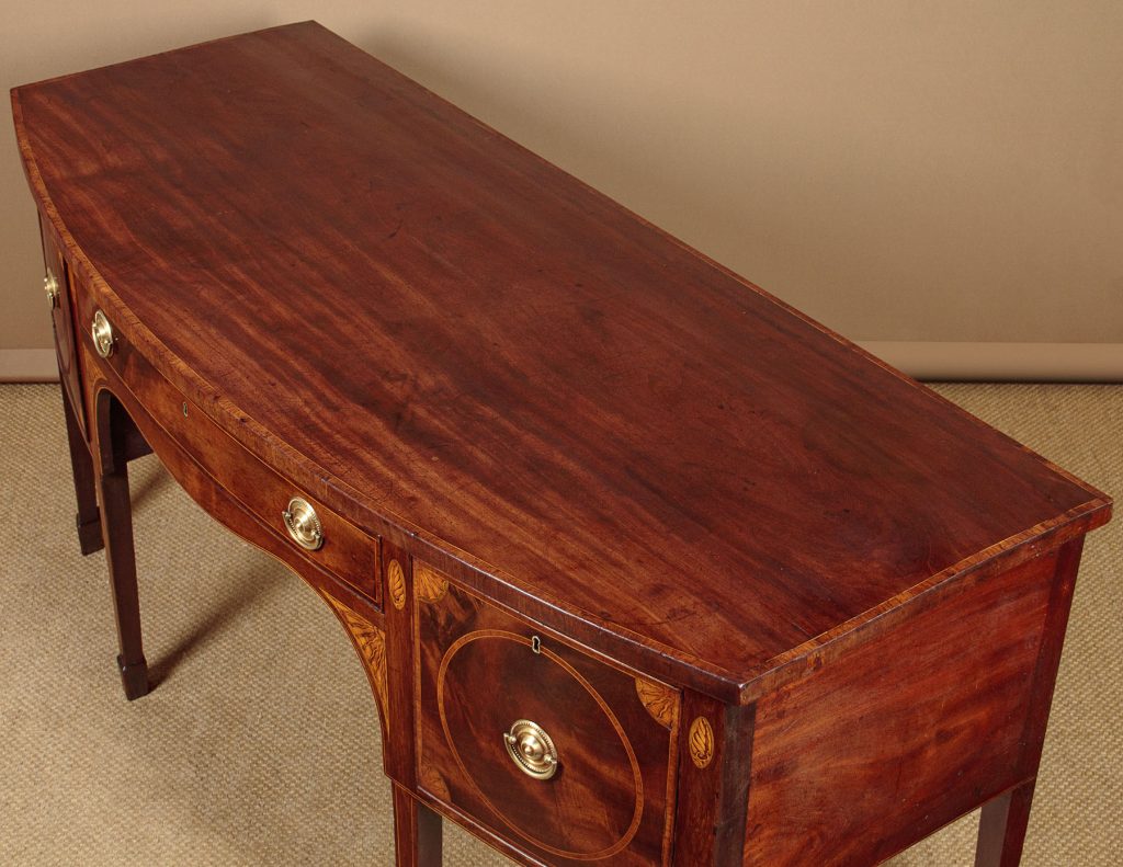 Large George III mahogany bow front sideboard c.1810. Deep mahogany veneered top with an inlaid and rosewood crossbanded edge. Over a slim centre drawer flanked by deeper drawers to both sides (note the hidden compartment at the back of the right and drawer). Highly figured mahogany veneers to the drawer fronts with inlaid satinwood crossbanding and lovely sunburst spandrels at the corners. Further inlaid with shell motif to the uprights either side of the drawers and with a larger repeat of the sunburst at either side of the curving apron below the centre drawer. Inlaid stringing to the bottom edge and raised on tapering square legs with spade feet, also inlaid at the front. Solid mahogany sides and oak drawer linings. Some old marks and to the top and later brass handles. Otherwise very good colour and condition, cleaned and waxed in our workshops.