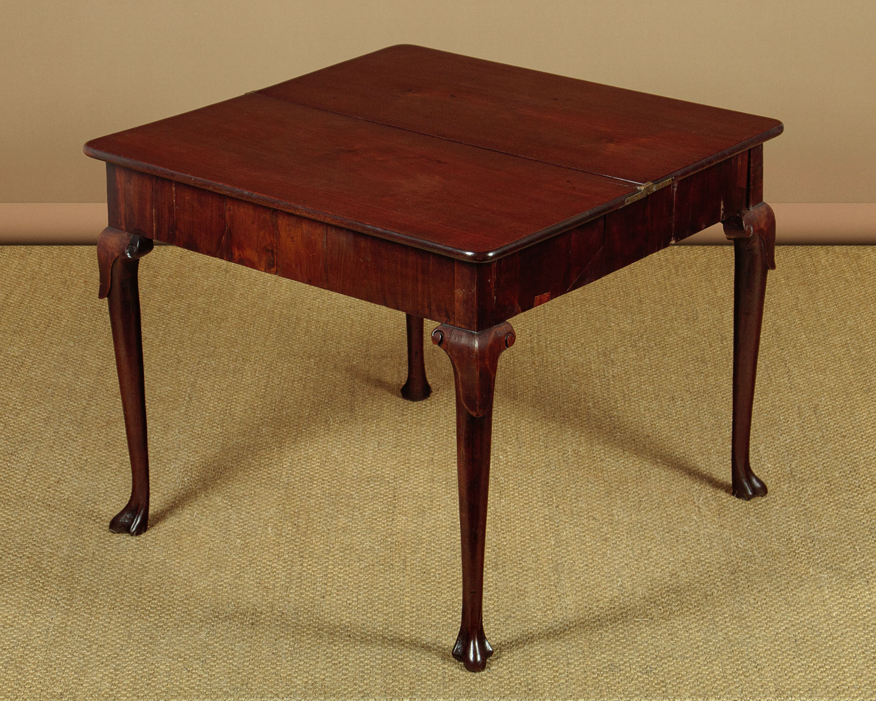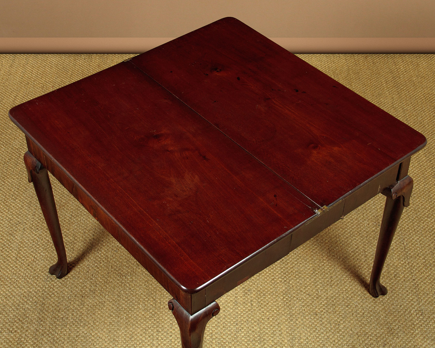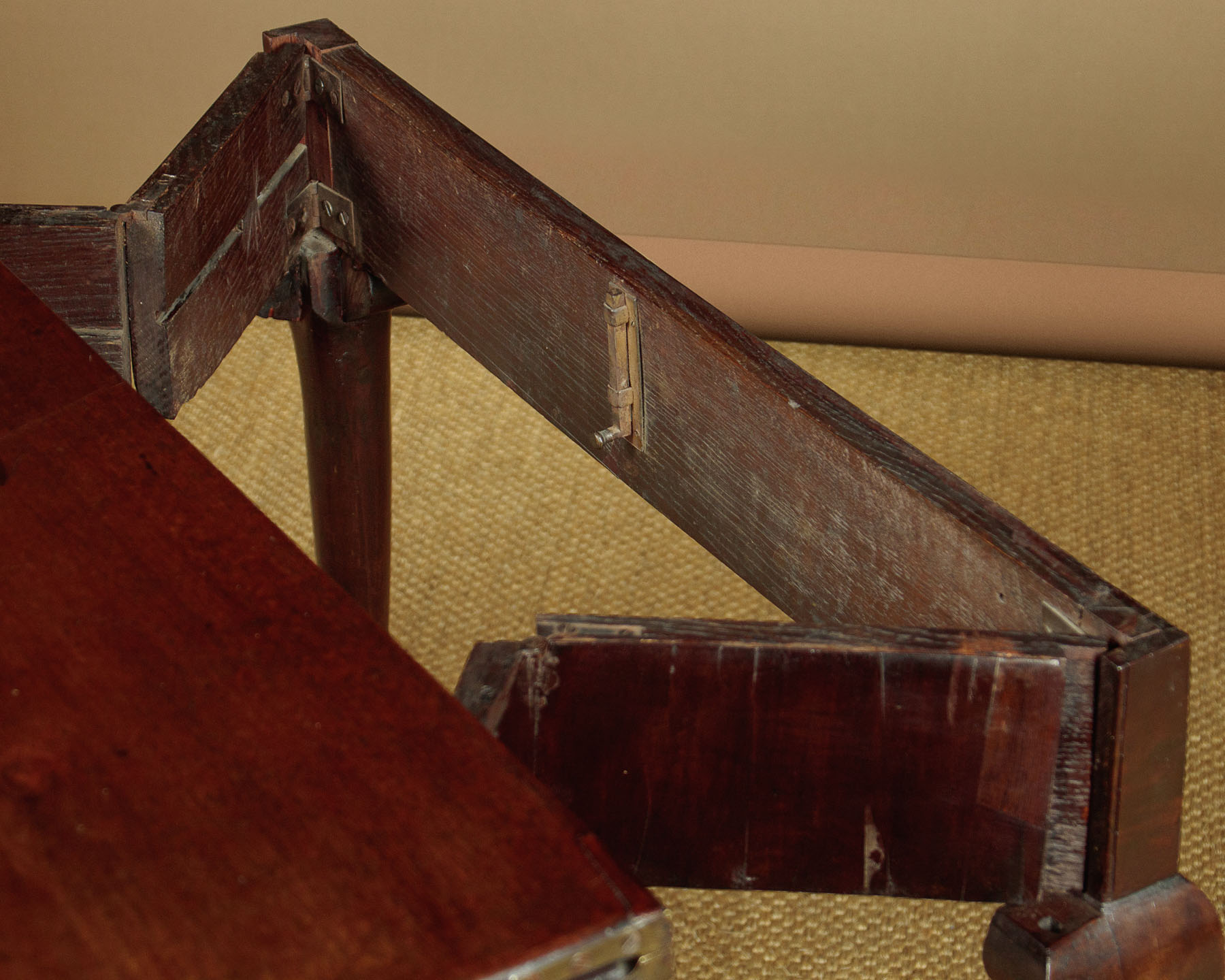 George II mahogany fold over supper table with a concertina action c.1760. Stands flat against the wall as an elegant console table or open the mechanism and fold open the top to make a table for four people. The concertina mechanism has the advantage of forming a crossbanded apron to each side of the table when open. Note the original sliding oak board with pierced hand grip to lock the mechanism. Raised on tapering legs with carved shoulders and feet. Solid mahogany leaves and oak groundwork to the apron. Minor repairs to the veneers on the apron. Generally very good colour and condition. Cleaned and waxed in our workshops.