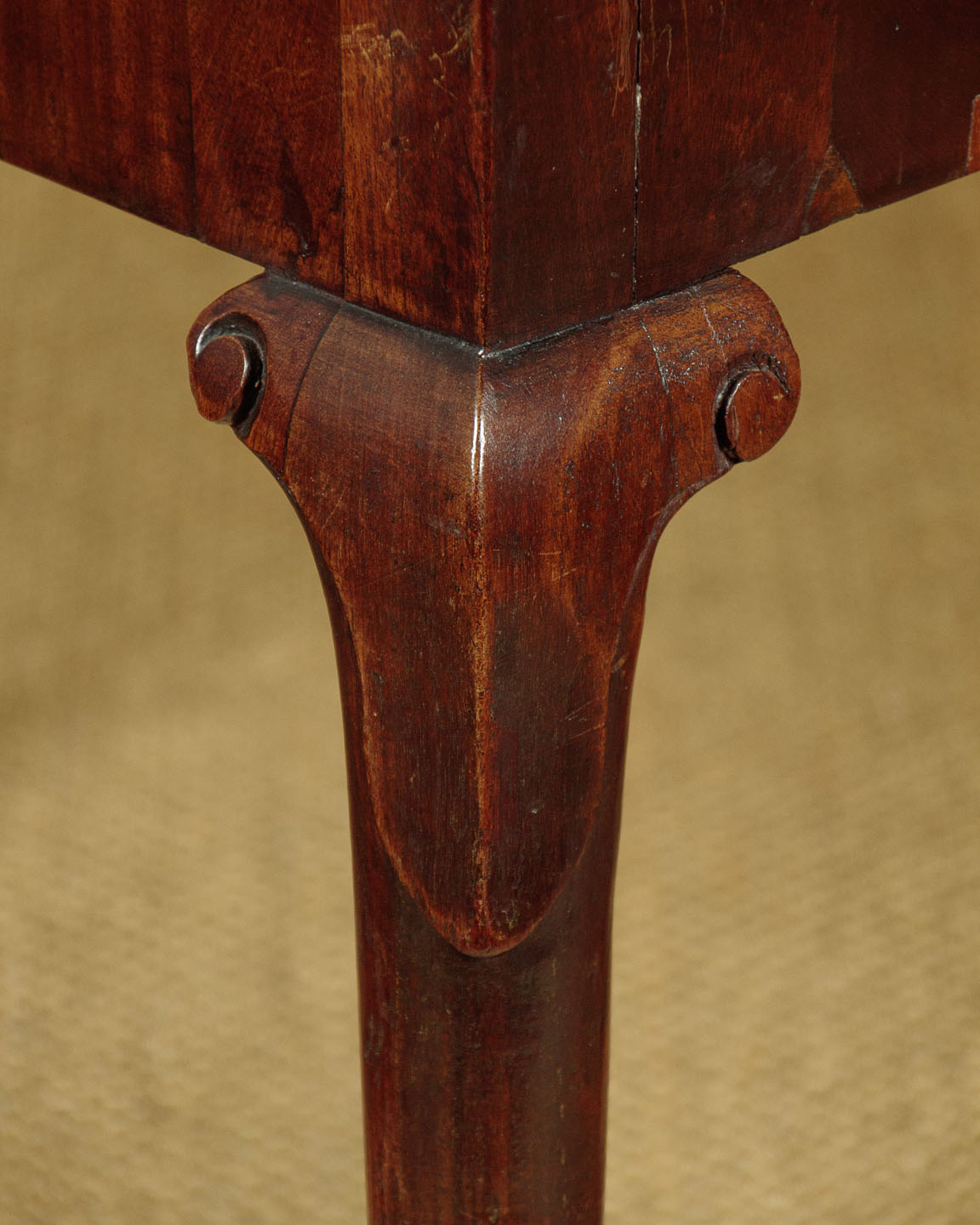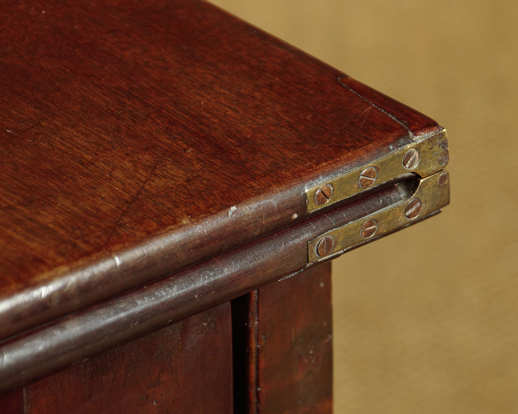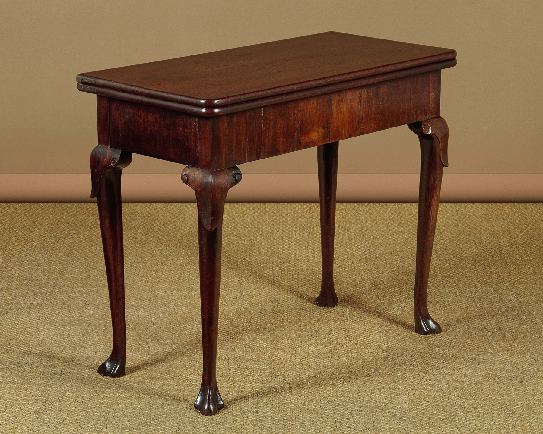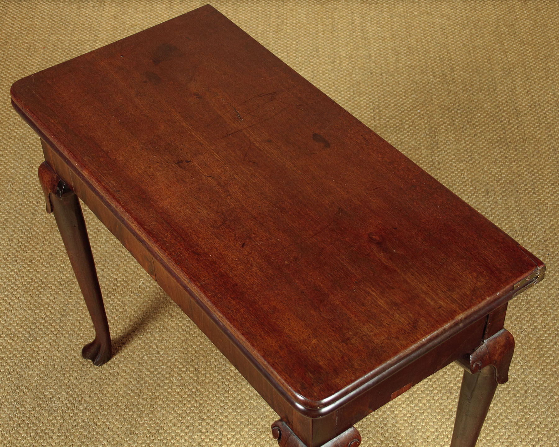George II mahogany fold over supper table with a concertina action c.1760. Stands flat against the wall as an elegant console table or open the mechanism and fold open the top to make a table for four people. The concertina mechanism has the advantage of forming a crossbanded apron to each side of the table when open. Note the original sliding oak board with pierced hand grip to lock the mechanism. Raised on tapering legs with carved shoulders and feet. Solid mahogany leaves and oak groundwork to the apron. Minor repairs to the veneers on the apron. Generally very good colour and condition. Cleaned and waxed in our workshops.