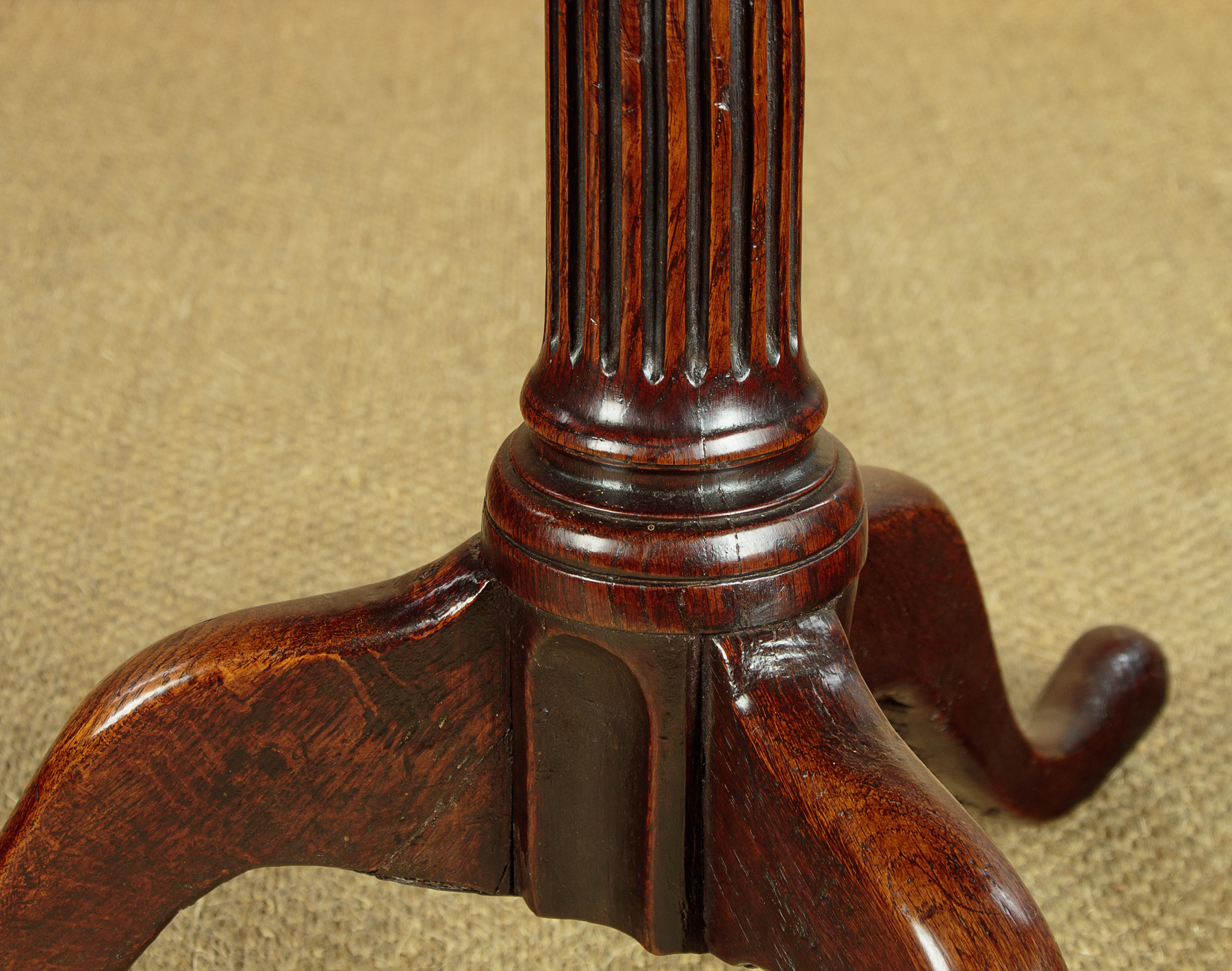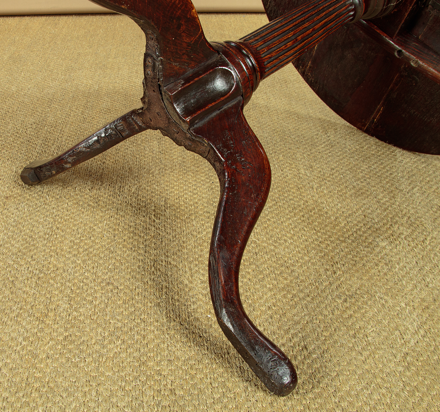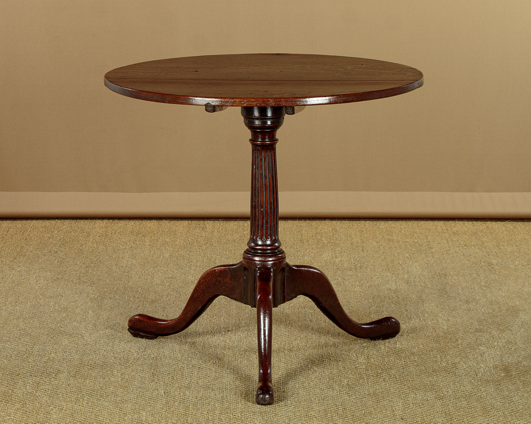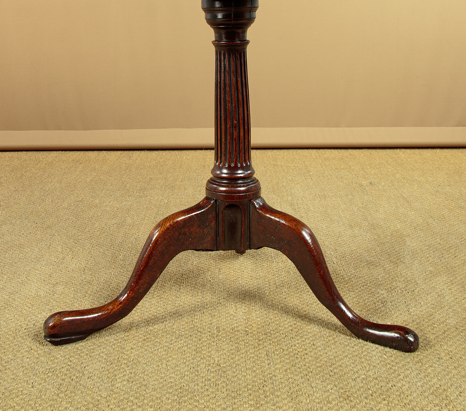 Beautiful George III oak tripod table c.1760. 29" diameter top made from three oak boards. Raised on a lovely column with carved flutes and turnings top and bottom. On a tripod base with shaped legs and feet. Top can be tipped to vertical when not in use, locking into place with the original iron catch. Excellent condition with some previous restorations. Superb colour and patina to the base. Cleaned and waxed in our workshops.