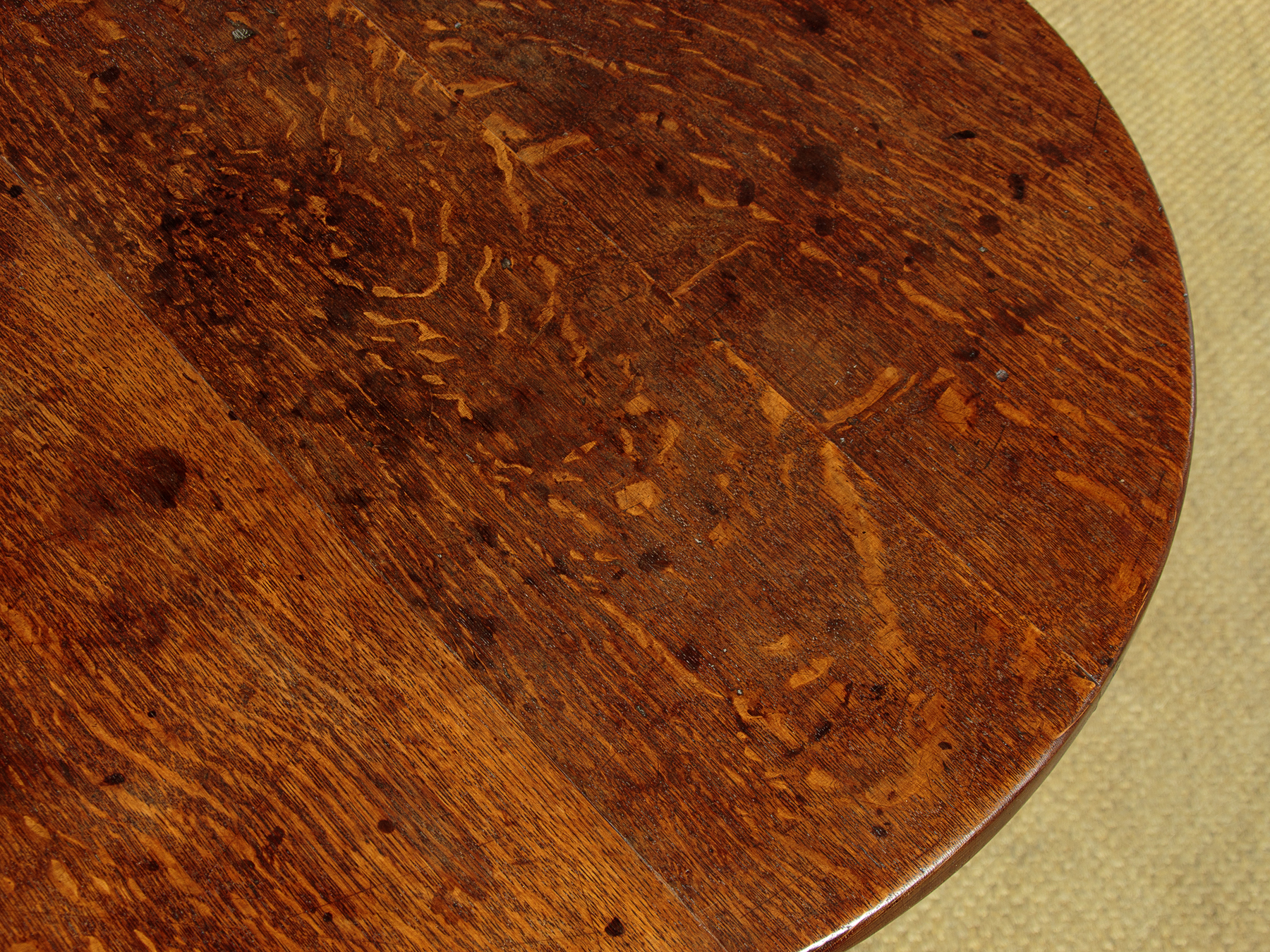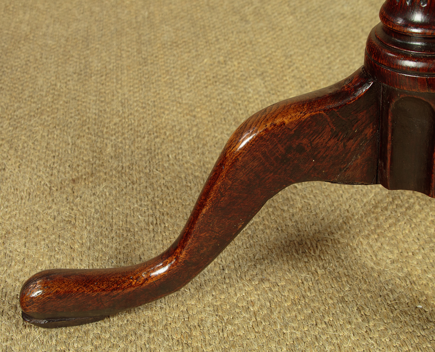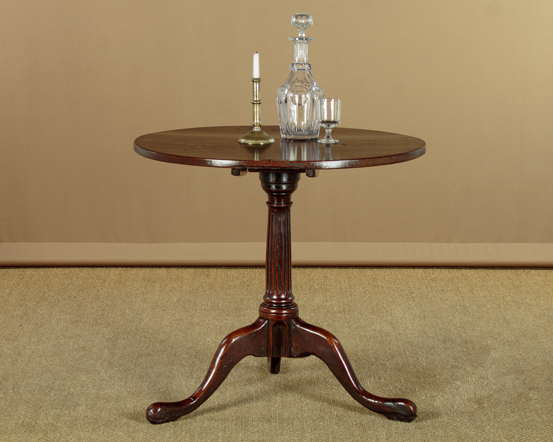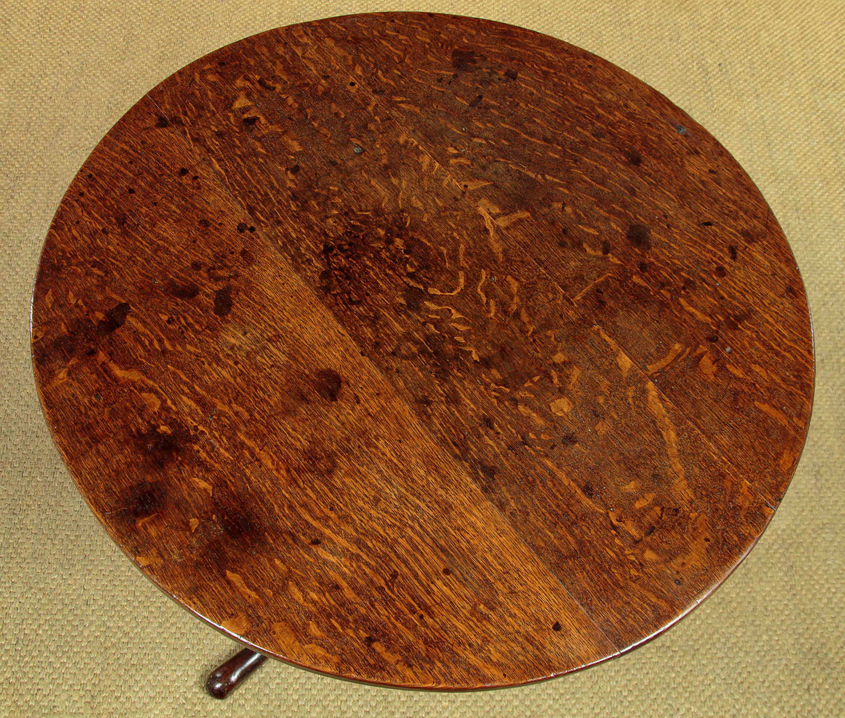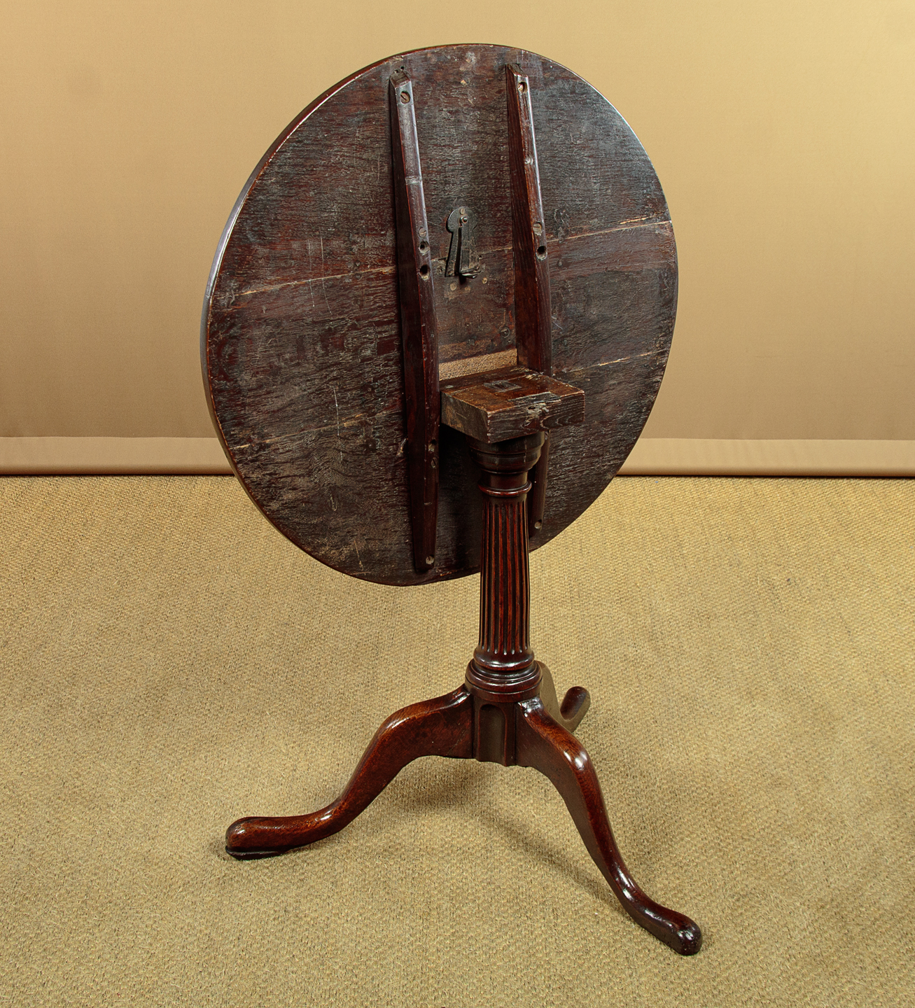 Beautiful George III oak tripod table c.1760. 29" diameter top made from three oak boards. Raised on a lovely column with carved flutes and turnings top and bottom. On a tripod base with shaped legs and feet. Top can be tipped to vertical when not in use, locking into place with the original iron catch. Excellent condition with some previous restorations. Superb colour and patina to the base. Cleaned and waxed in our workshops.