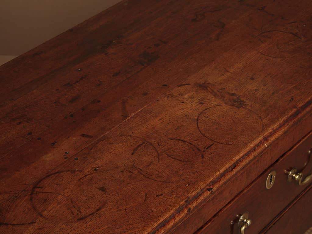 Beautiful late 18th.c. oak Welsh dresser base, mid Wales borders c.1780. Three plank top with a simple moulded edge and an applied moulding below. Over three good sized drawers, the inch thick drawer fronts with cockbeaded edges and original brass swan neck handles. Particularly attractive apron featuring three ogee arches with a shaped point across the front and continued on the sides. Raised on good cabriole front legs with square pad feet and simple square stiles at the rear. Solid oak side panels, drawer linings and backboard. Excellent colour and condition, cleaned and waxed in our workshops.