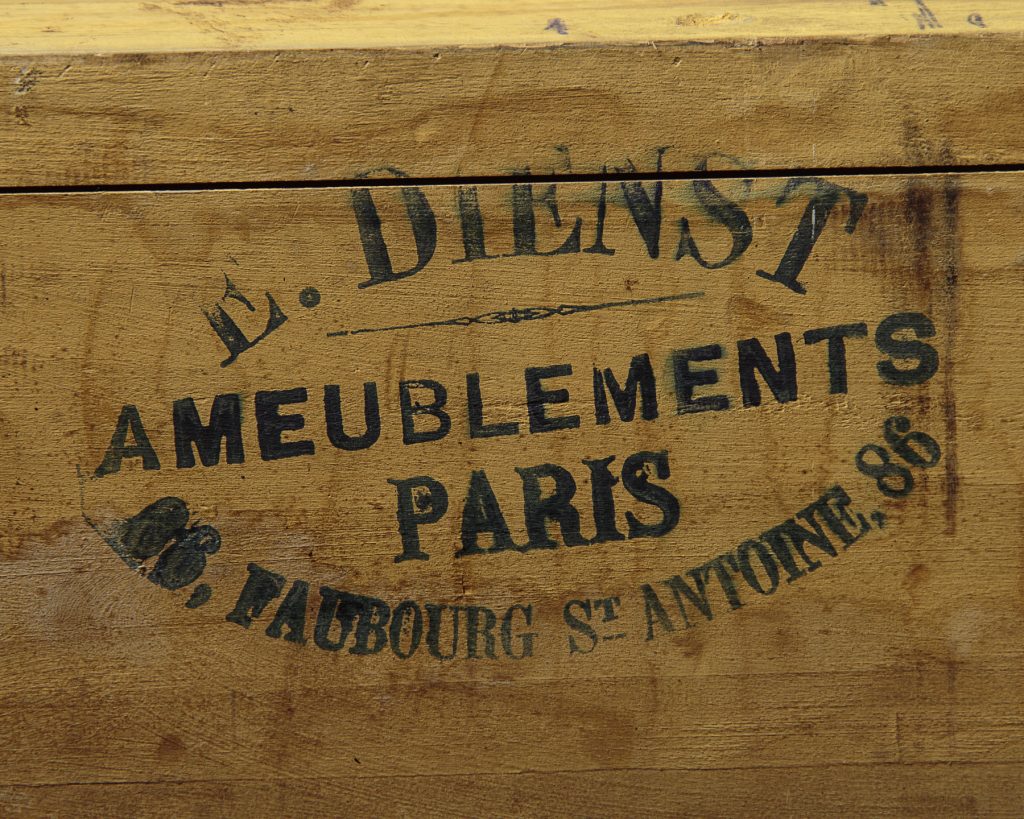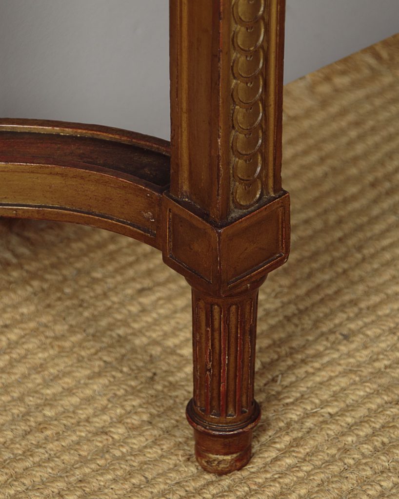 Smart little gilded marble top console table by the high end Paris makers E. Dienst c.1900. Just 28½" wide. Original marble top with projecting front corners, swept sides and a moulded edge. Gilded base with a finely carved and moulded frieze over front legs with scrolling acanthus tops and guilloche carved front edge, joined with a curved and moulded stretcher with carved finial at the centre. Raised on short tuned and fluted column feet. Original gilding, rubbed and worn through in places to reveal the red ground below. Large maker's stamp to the rear. Some minor wear to the edges of the marble otherwise very good condition.