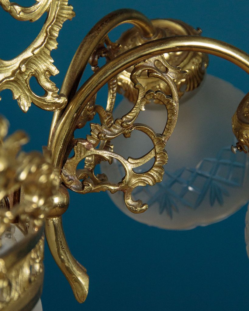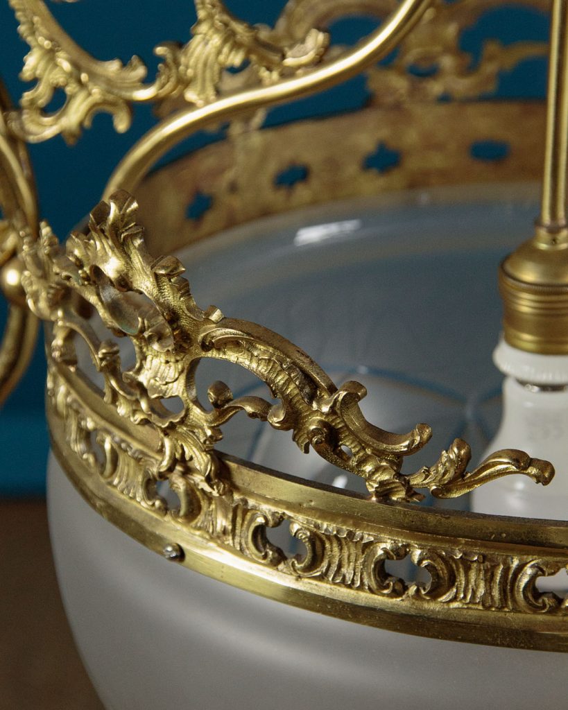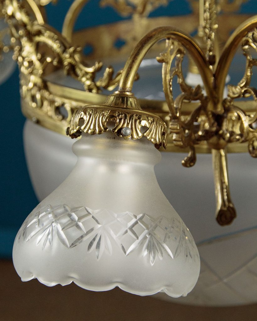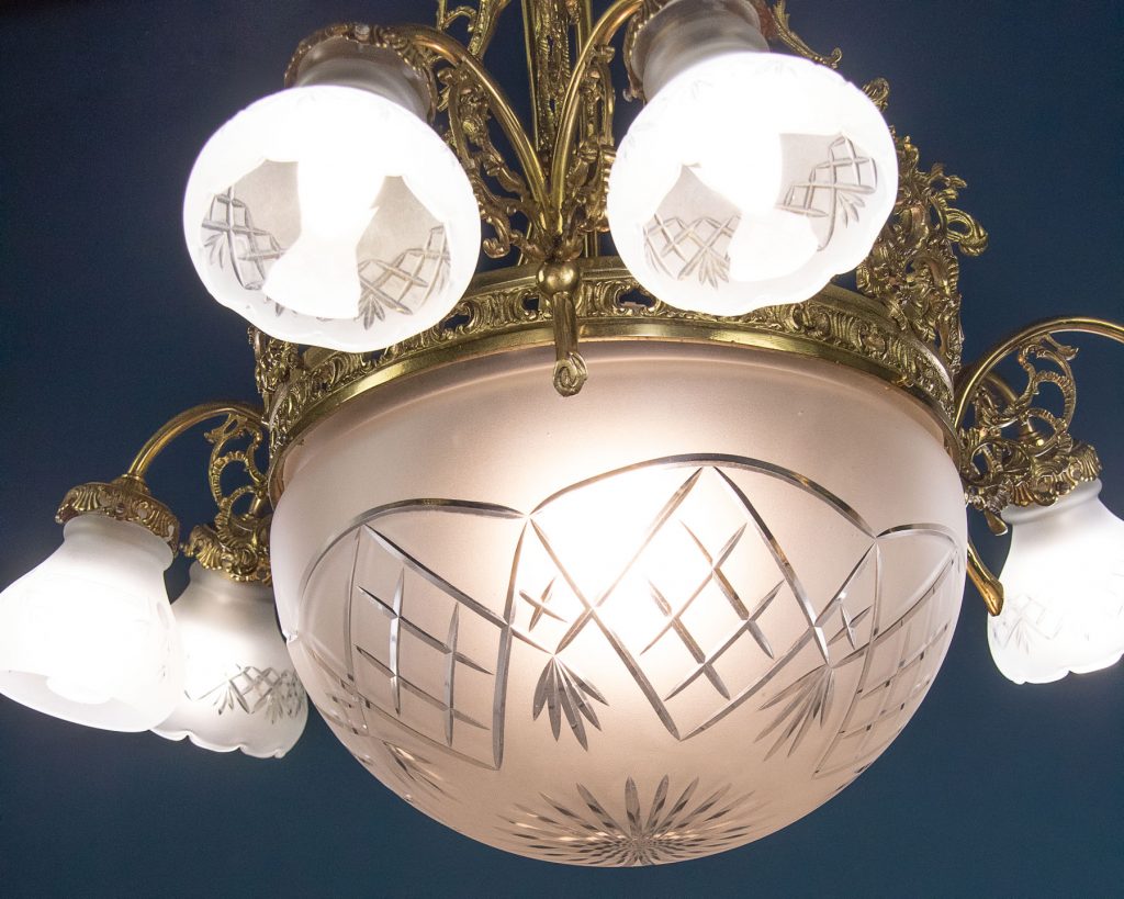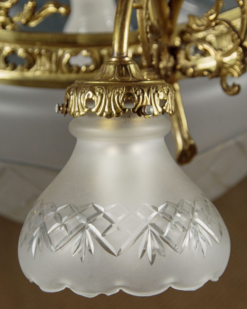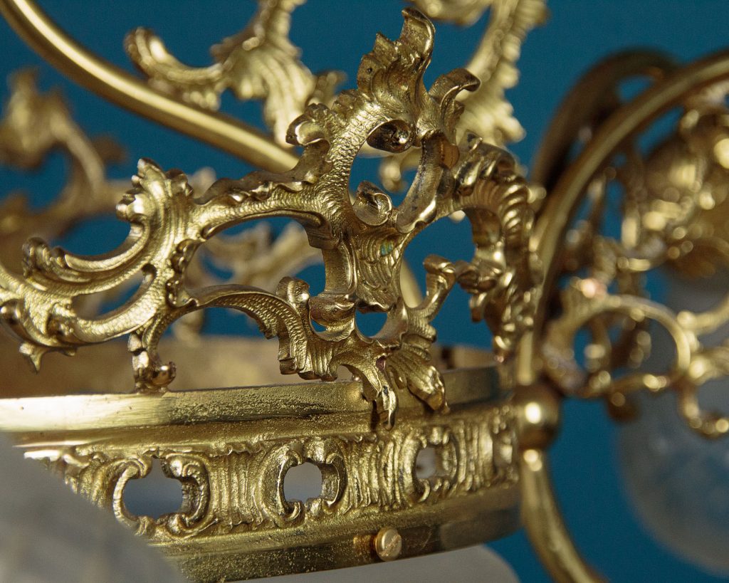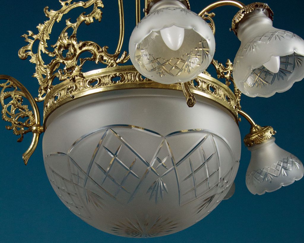 Large and impressive Edwardian era chandelier c.1910. Six bulbs on short curving branches around a central bulb within a large frosted glass bowl with cut decoration. Gilded brass frame with very elaborate acanthus leaf decoration and pierced detail to the collar around the central bowl. Frosted and etched glass shades to match the bowl. One replacement shade, otherwise excellent condition. Cleaned and rewired and ready to hang. Chain and ceiling fitting supplied.