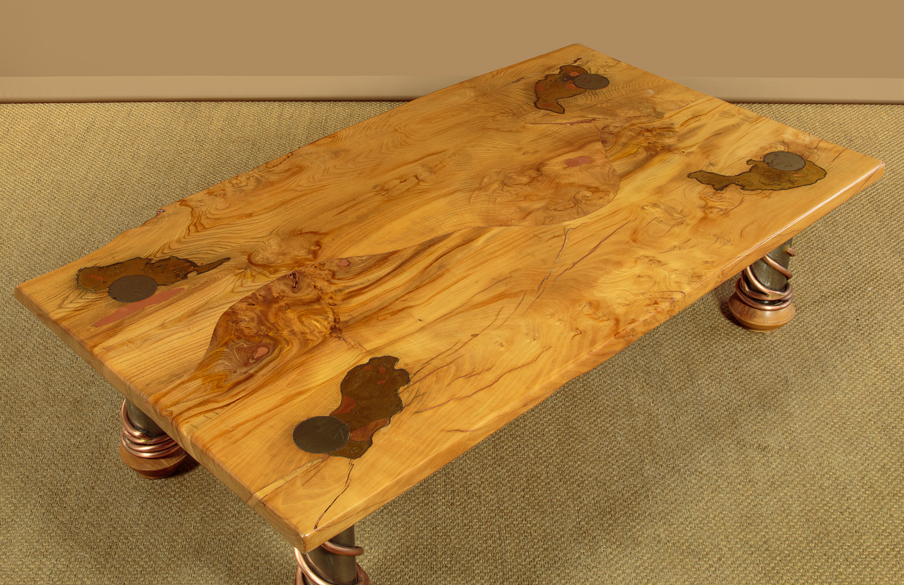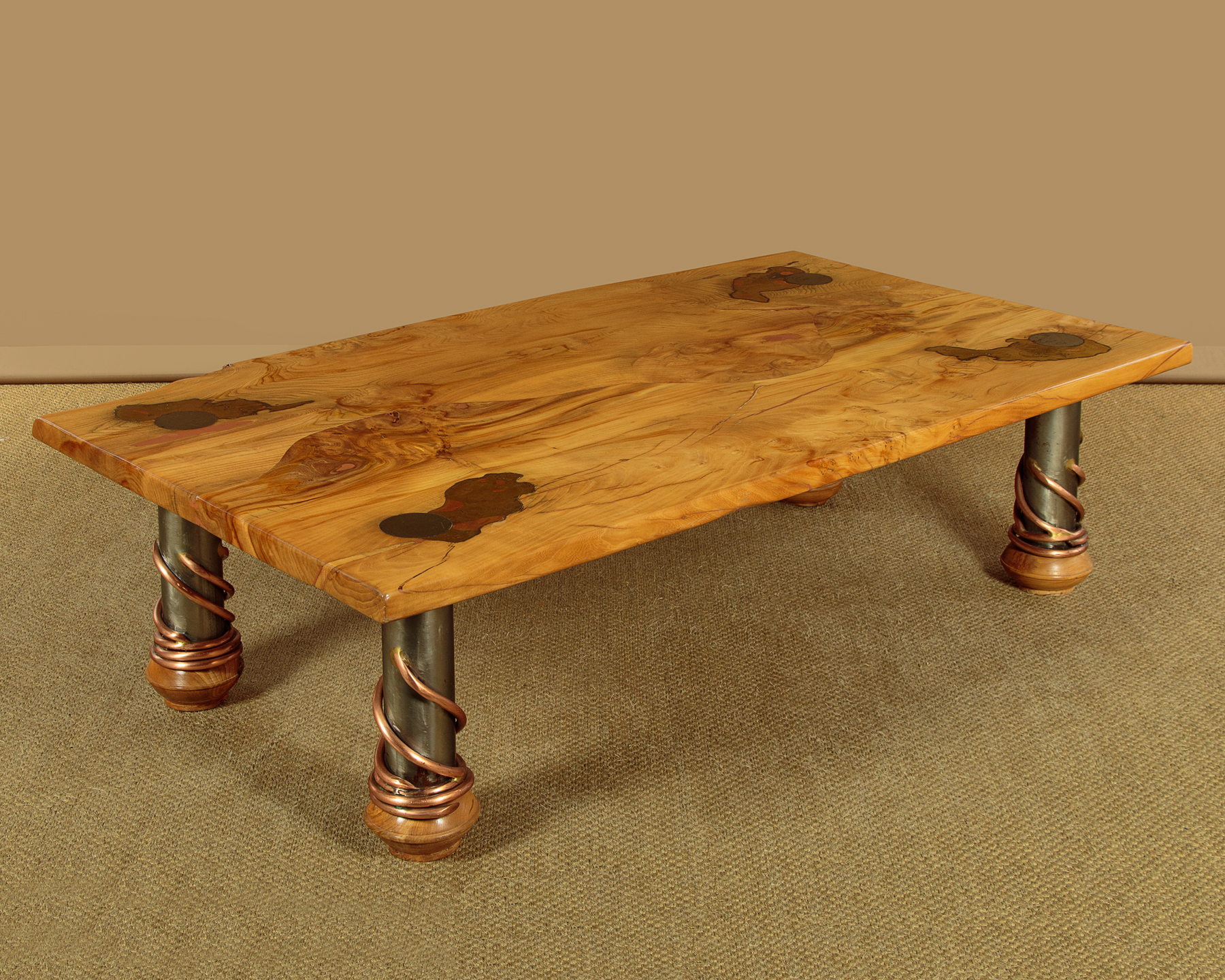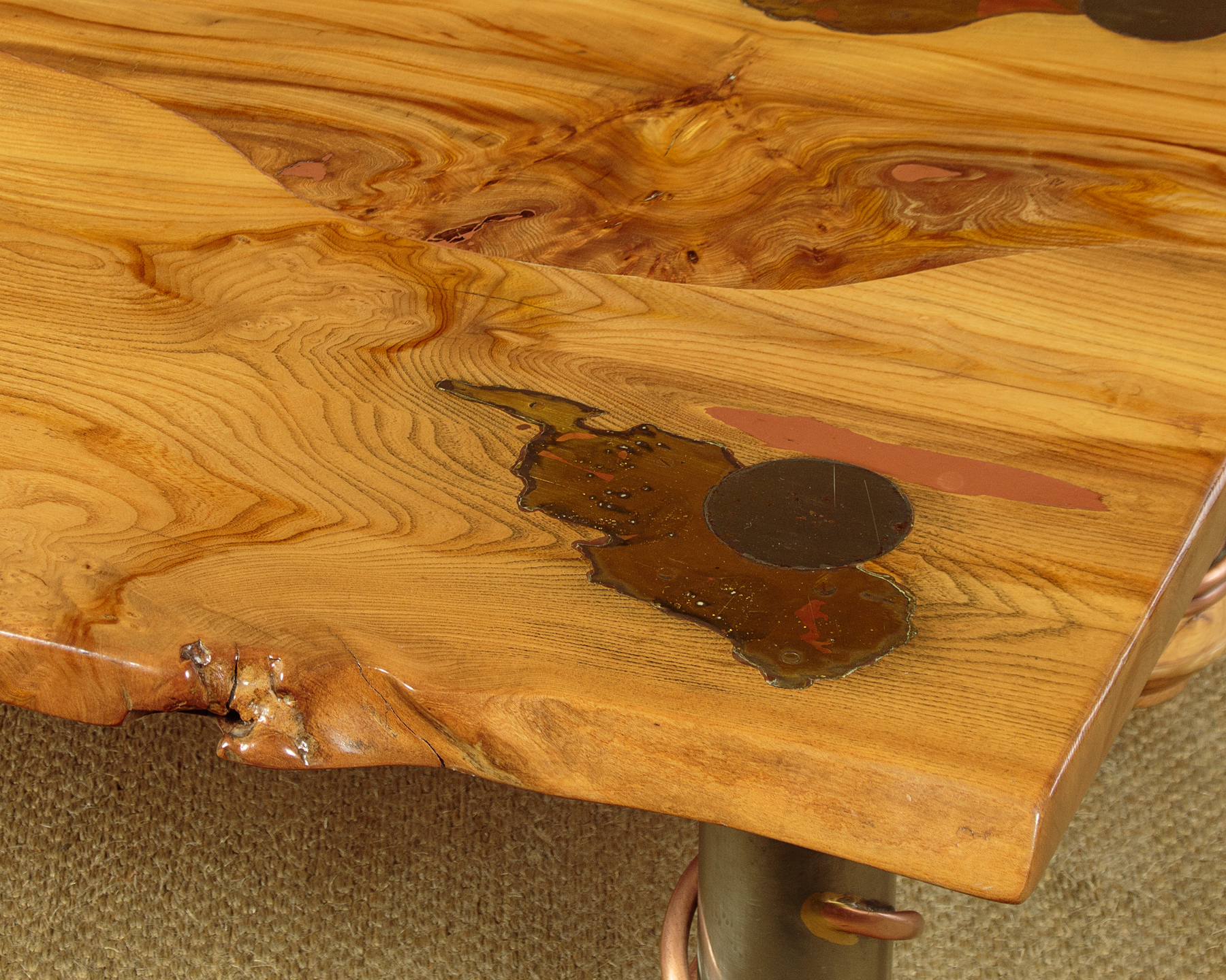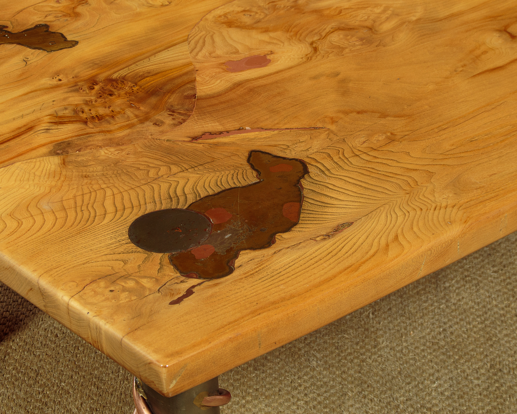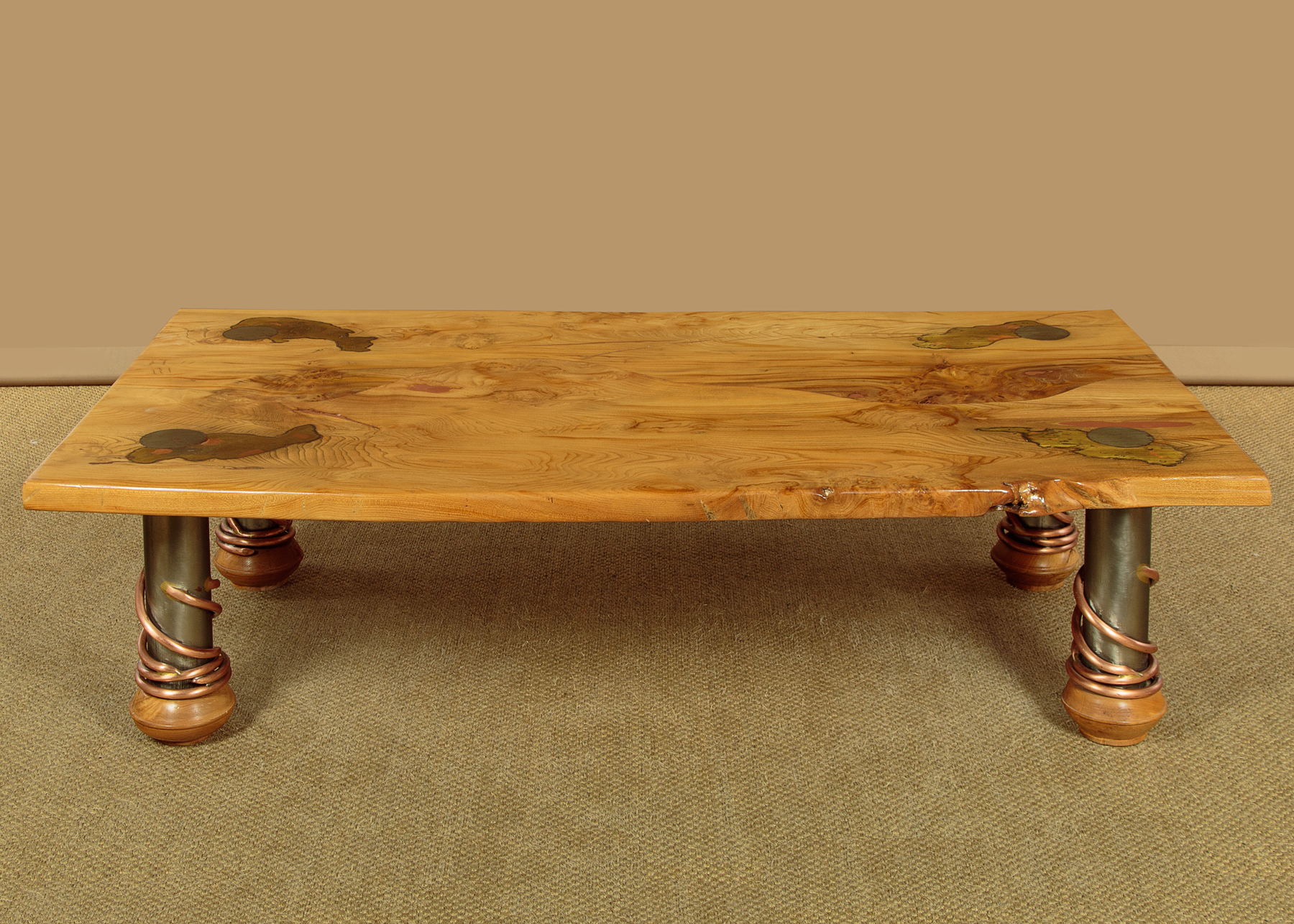 Fabulous large and very sturdy handmade elm and metalwork coffee table, produced as a bespoke piece (commissioned by the previous owner) by the acclaimed modern Scottish furniture designer Paul Hodgkiss c.1994. 1½" thick elm boards of beautiful curving grain and sections of burr, with an irregular wavy join down the centre, inlaid brass elements at each corner where the legs pierce the top and with the original natural edge preserved on one side. Raised on stout steel legs with spiral copper decoration and turned and moulded elm feet. Very good condition.