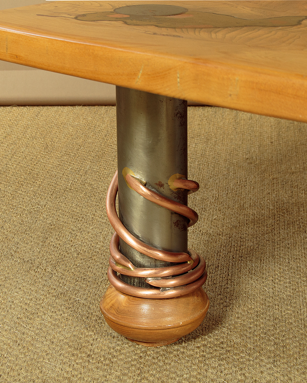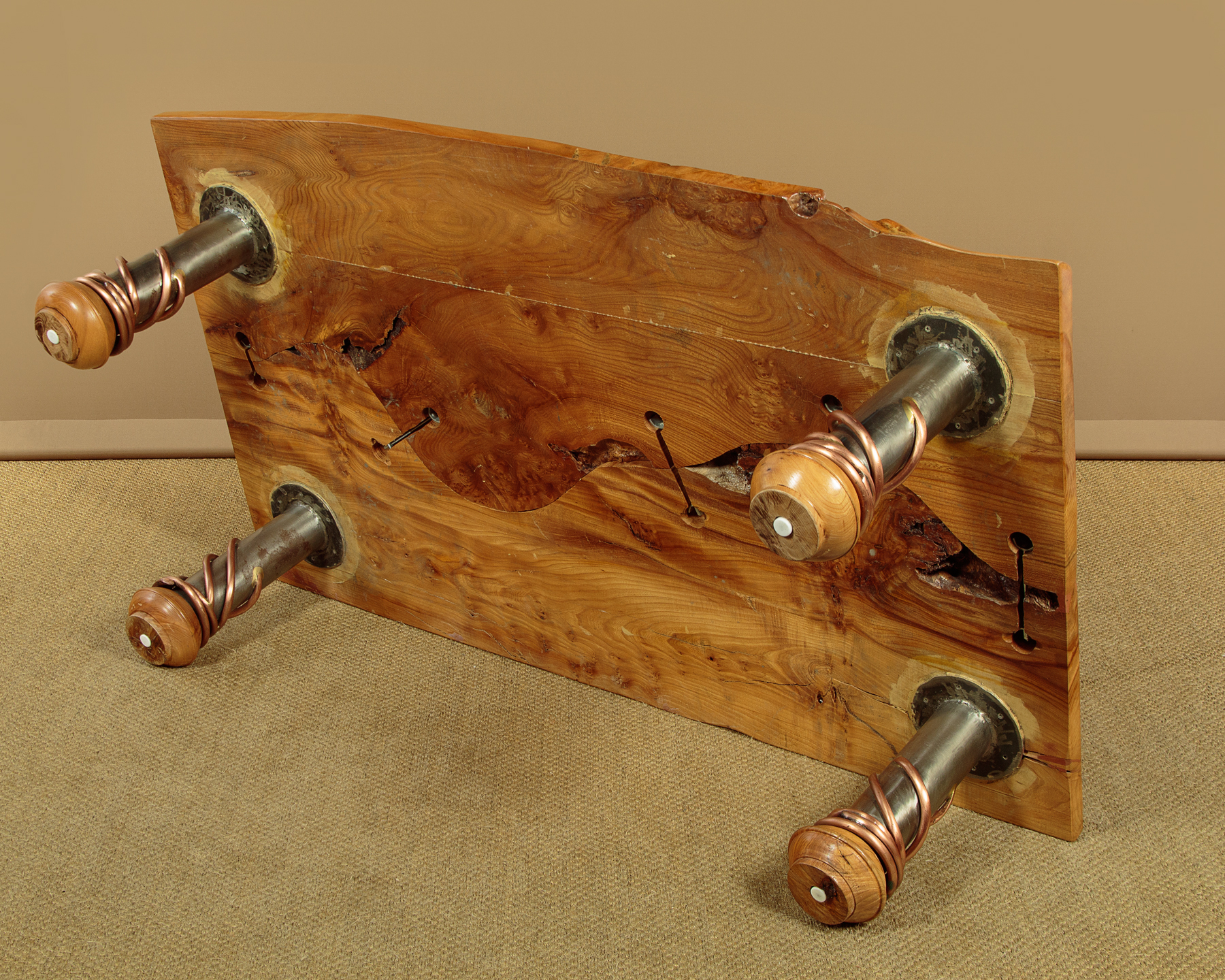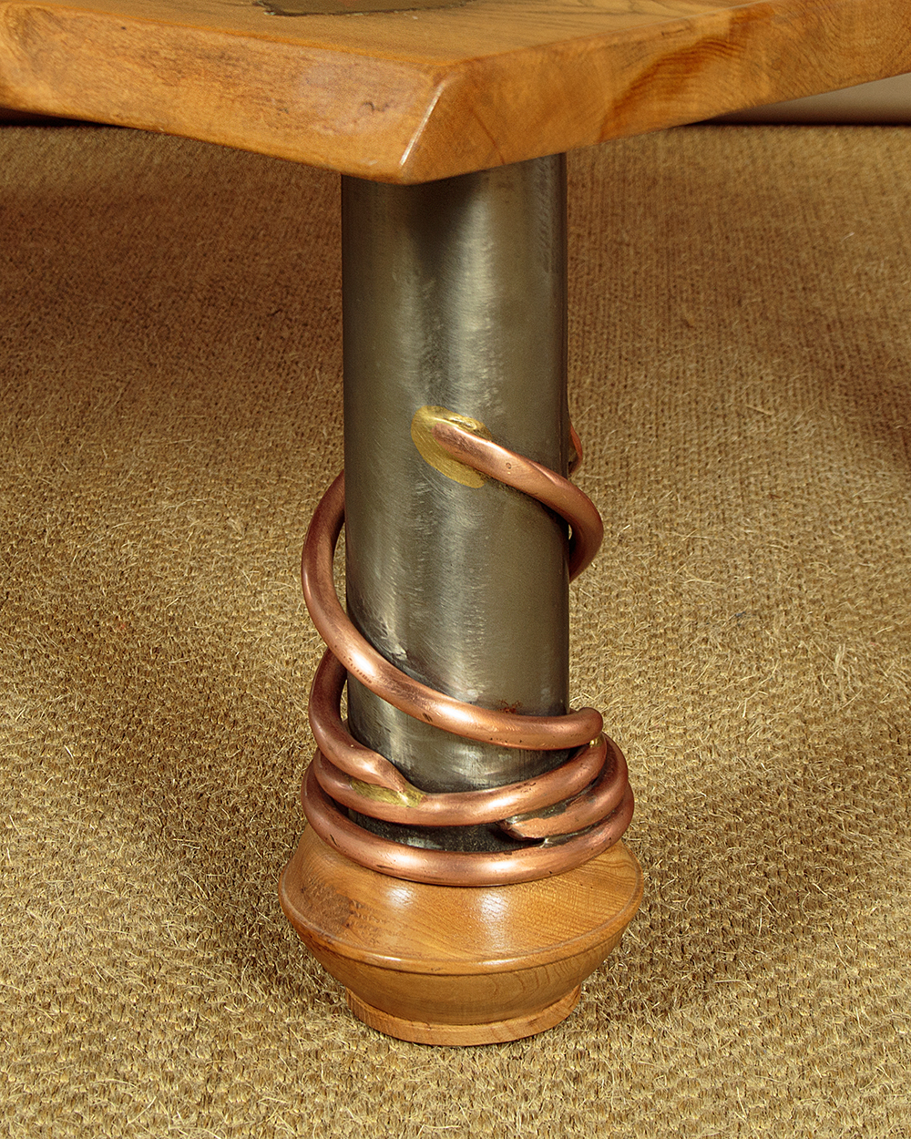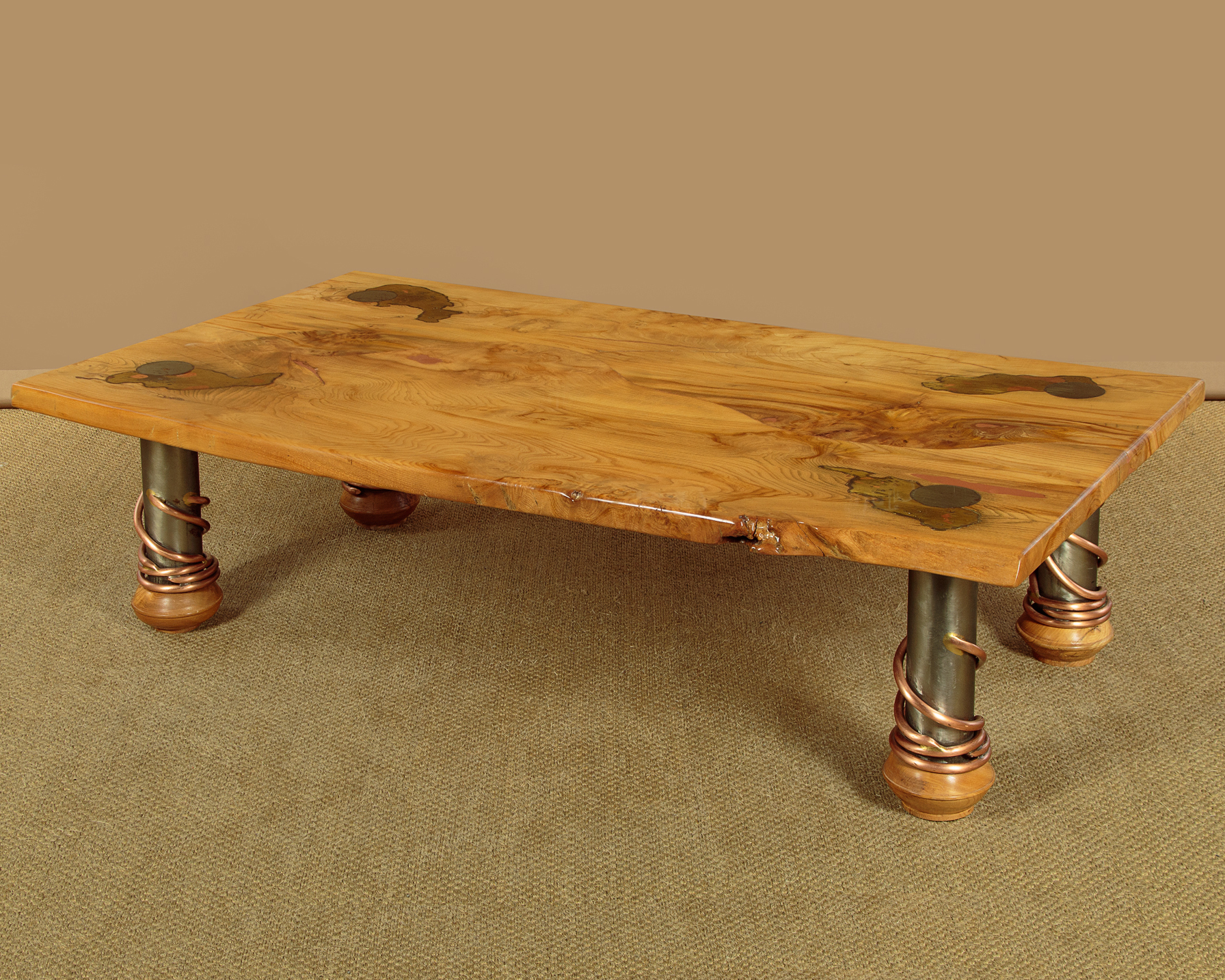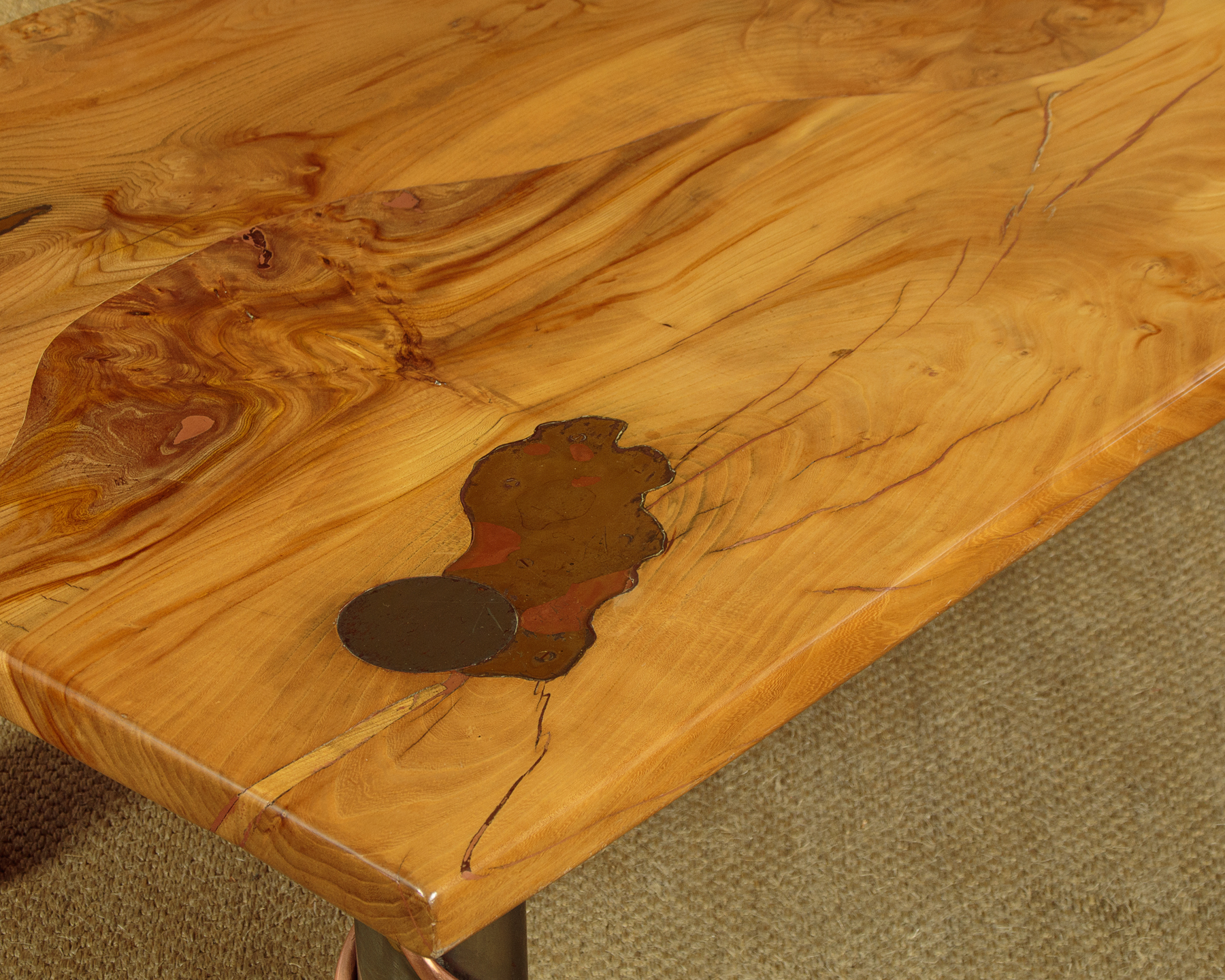 Fabulous large and very sturdy handmade elm and metalwork coffee table, produced as a bespoke piece (commissioned by the previous owner) by the acclaimed modern Scottish furniture designer Paul Hodgkiss c.1994. 1½" thick elm boards of beautiful curving grain and sections of burr, with an irregular wavy join down the centre, inlaid brass elements at each corner where the legs pierce the top and with the original natural edge preserved on one side. Raised on stout steel legs with spiral copper decoration and turned and moulded elm feet. Very good condition.