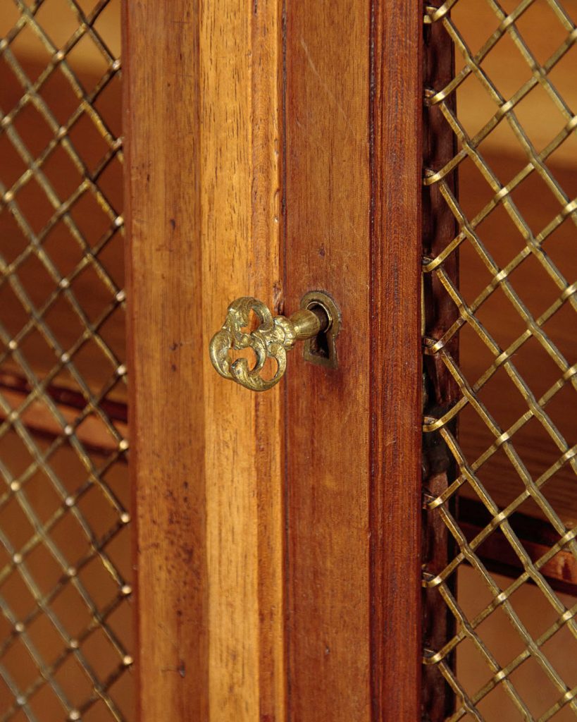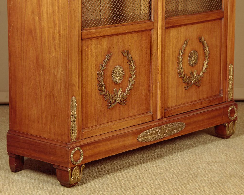 Tall and impressive Empire style walnut bookcase c.1930. Two long doors with open brass grill upper panels and blind panels below. Fitted inside with four adjustable shelves (internal depth 12"). Raised triangular pediment and moulded cornice. Extensive large Empire style brass mounts across the front featuring a Classical winged mask, laurel wreath and anthemion motifs. Slim moulded plinth and moulded feet also brass mounted. Very good colour and condition, cleaned and waxed in our workshops, key supplied.