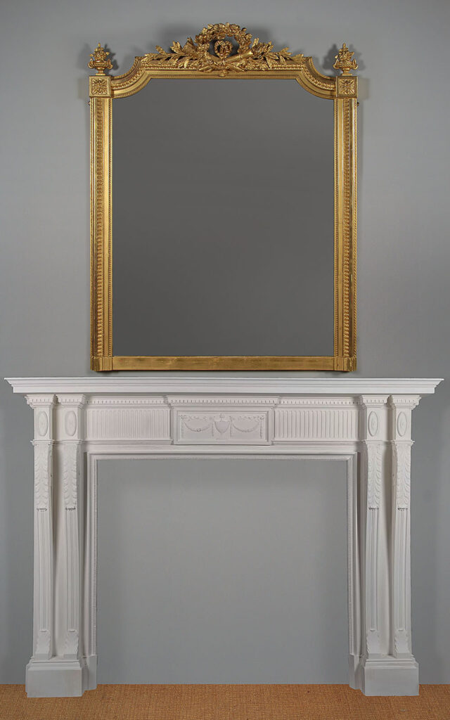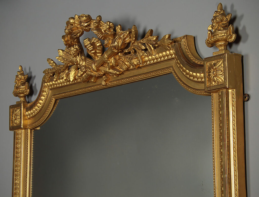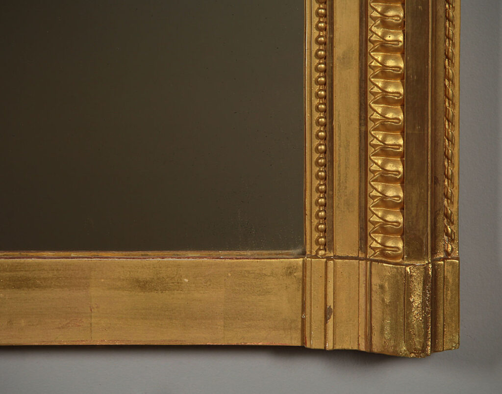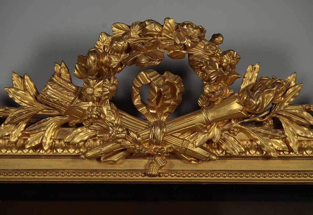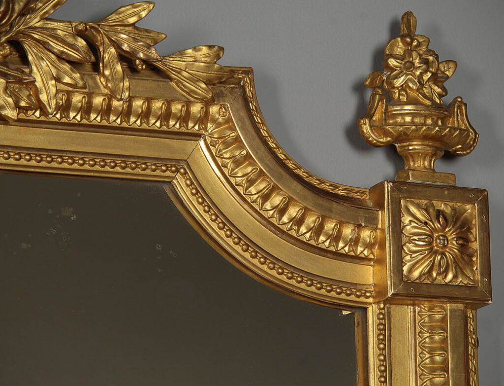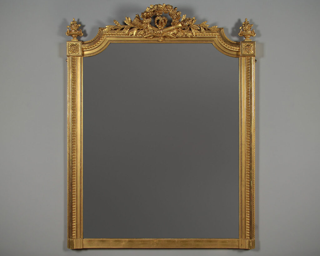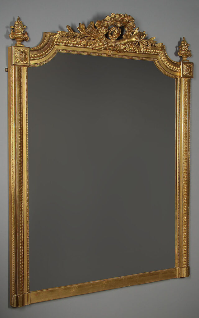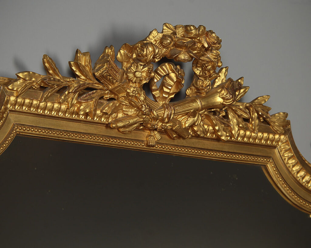 Beautiful Edwardian era gilded overmantle mirror c.1910. 37" x 46½" mirror plate with concave curved top corners within a gilded frame. Topped with a pierced Classical frieze in high relief featuring a floral garland over a torch and a quiver of arrows, with sprigs of laurel to each side. Urn shaped finials to the top corners over acanthus detail. Bands of fine moulded detail to the front of the frame, straight bottom edge to sit over a fireplace. Excellent condition with bright gilding, original mirror plate and backboards.