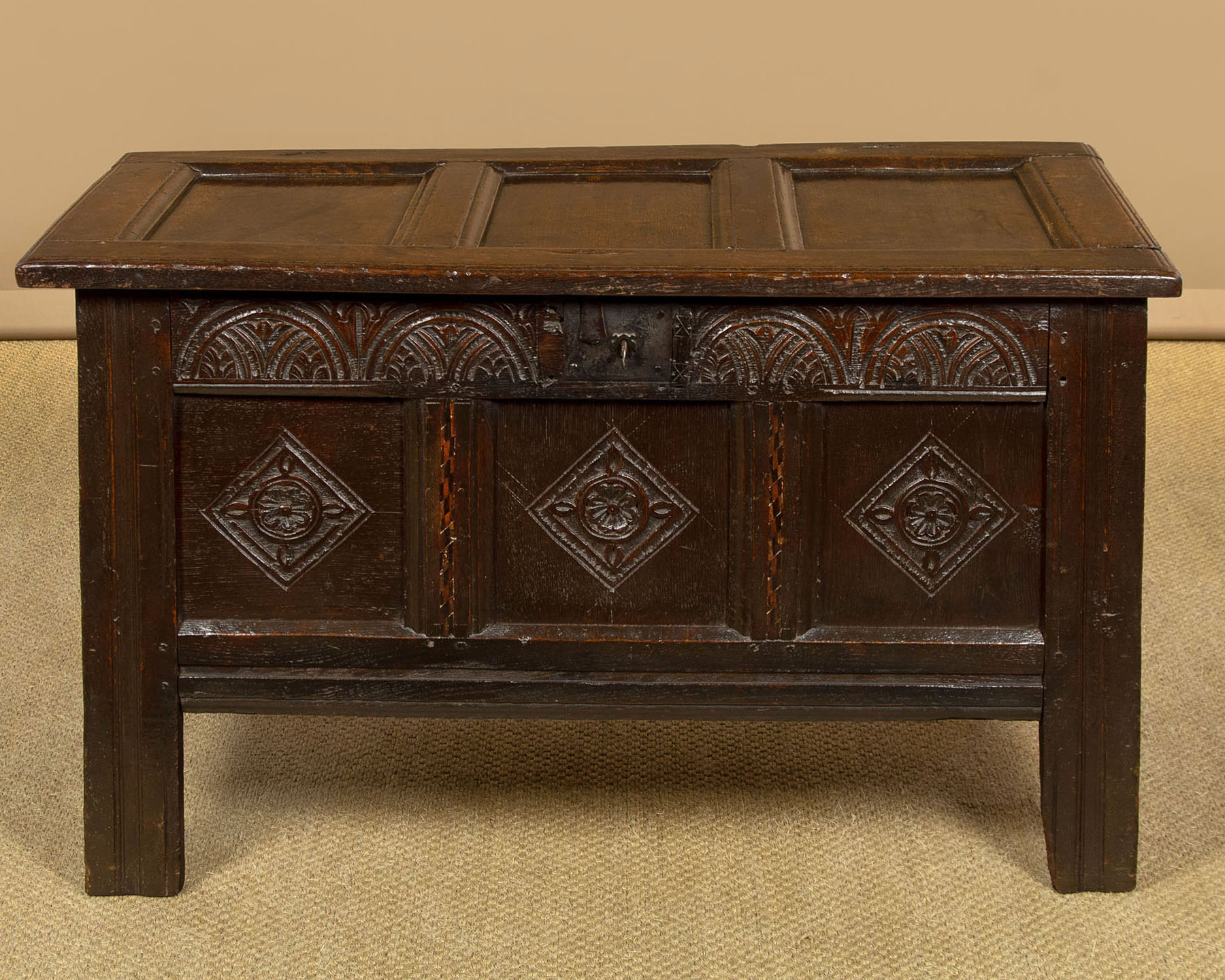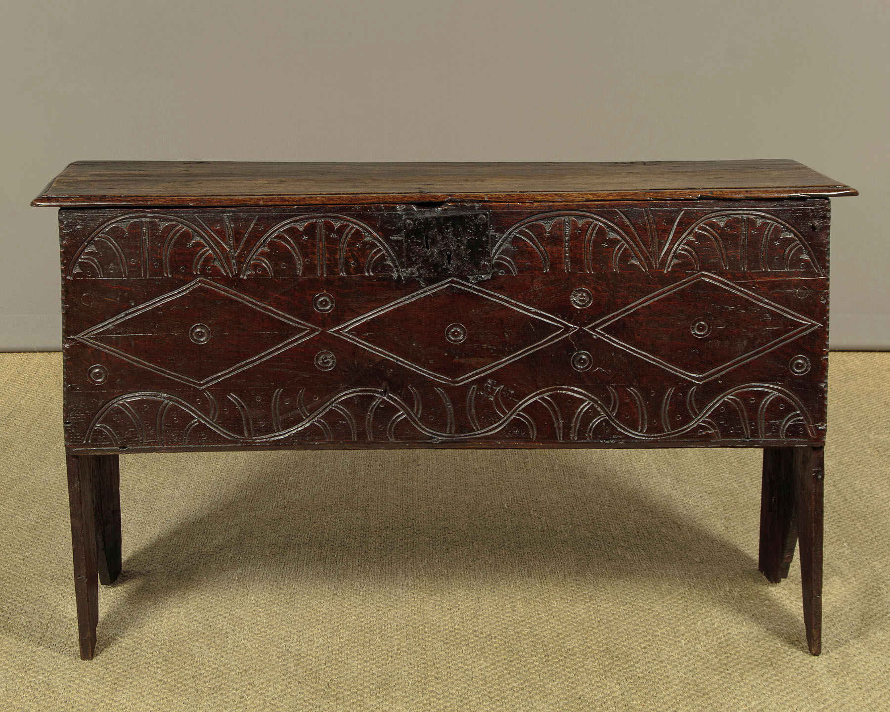 Good sized Gothic Revival oak coffer c.1880. Could be used as a hall seat with storage. Flat (rather than panelled top) with a moulded edge opens to reveal useful storage inside. Superb decorative front featuring five panels with crisp blind tracery carving between Gothic architectural pilasters. Double linenfold panels to the sides. Deep moulded plinth with shaped bottom edge. Old woodworm holes to the backboards, other wise very good colour and condition, cleaned and waxed in our workshops.