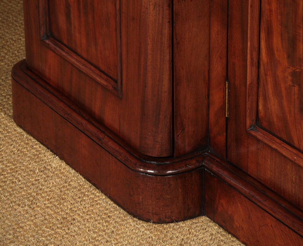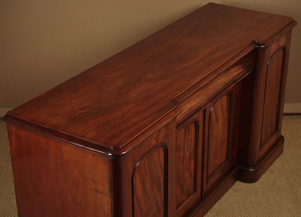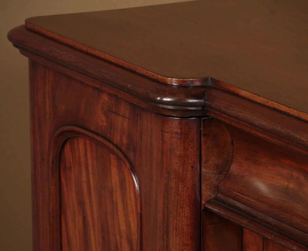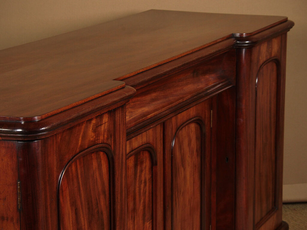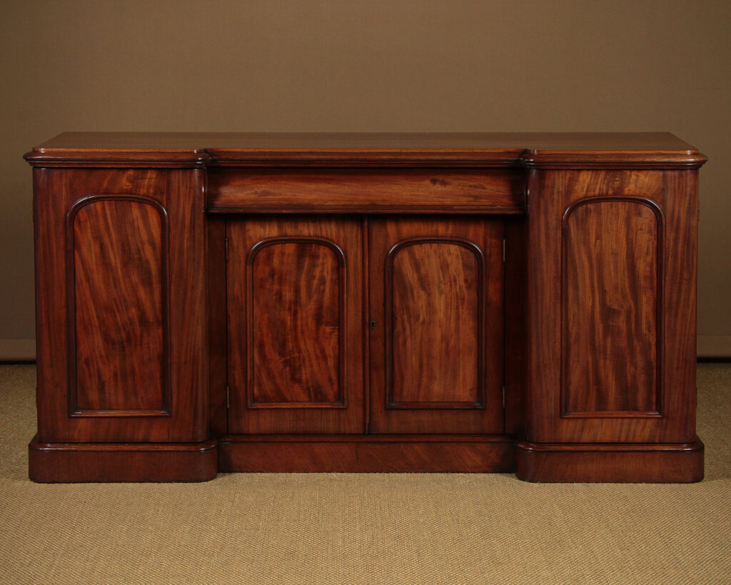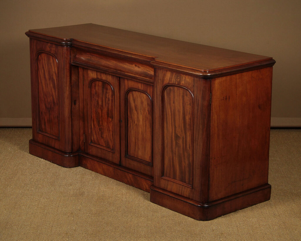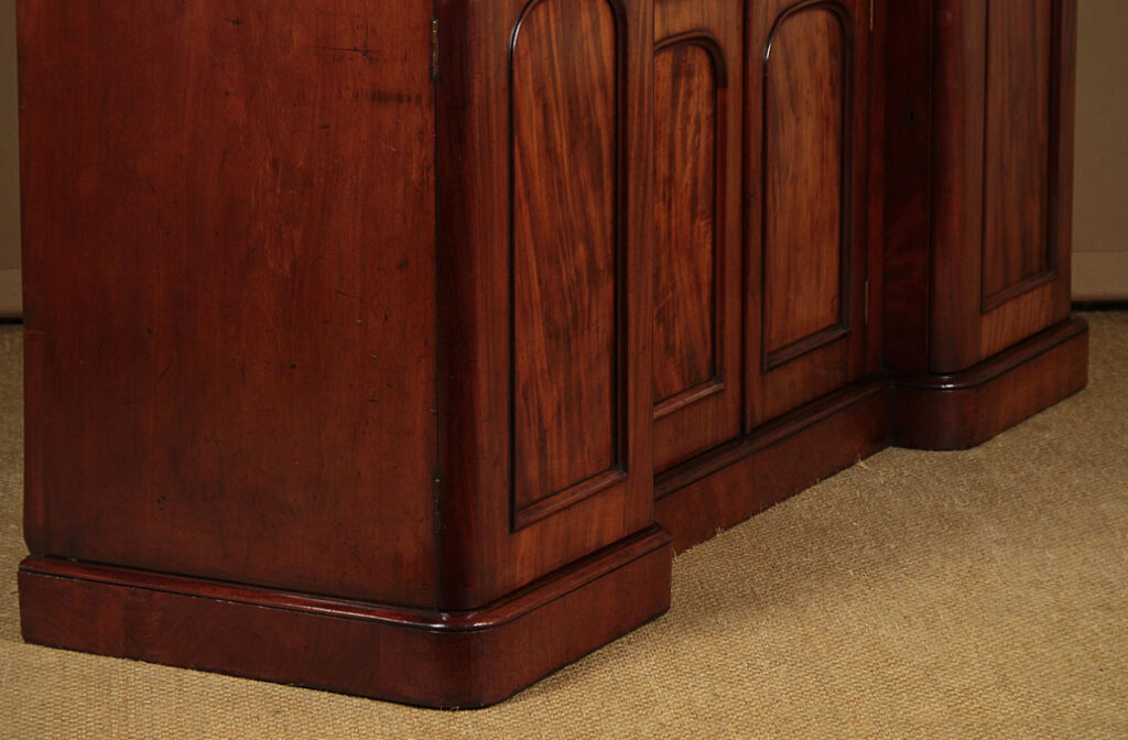 Good sized mid 19th.c. four door mahogany sideboard c.1860. Inverted breakfront top with a deep moulded edge and rounded corners. Over a four door cupboard base with a long drawer over the centre. Both the right and left hand cupboards are fitted with drawers and shelves. Well figured mahogany veneers across the front. Arch top door panels with raised mouldings. Raised on a thumb moulded plinth, veneered to match. Solid mahogany sides and groundwork to the doors. Excellent colour and condition, cleaned and waxed in our workshops. Keys supplied.
