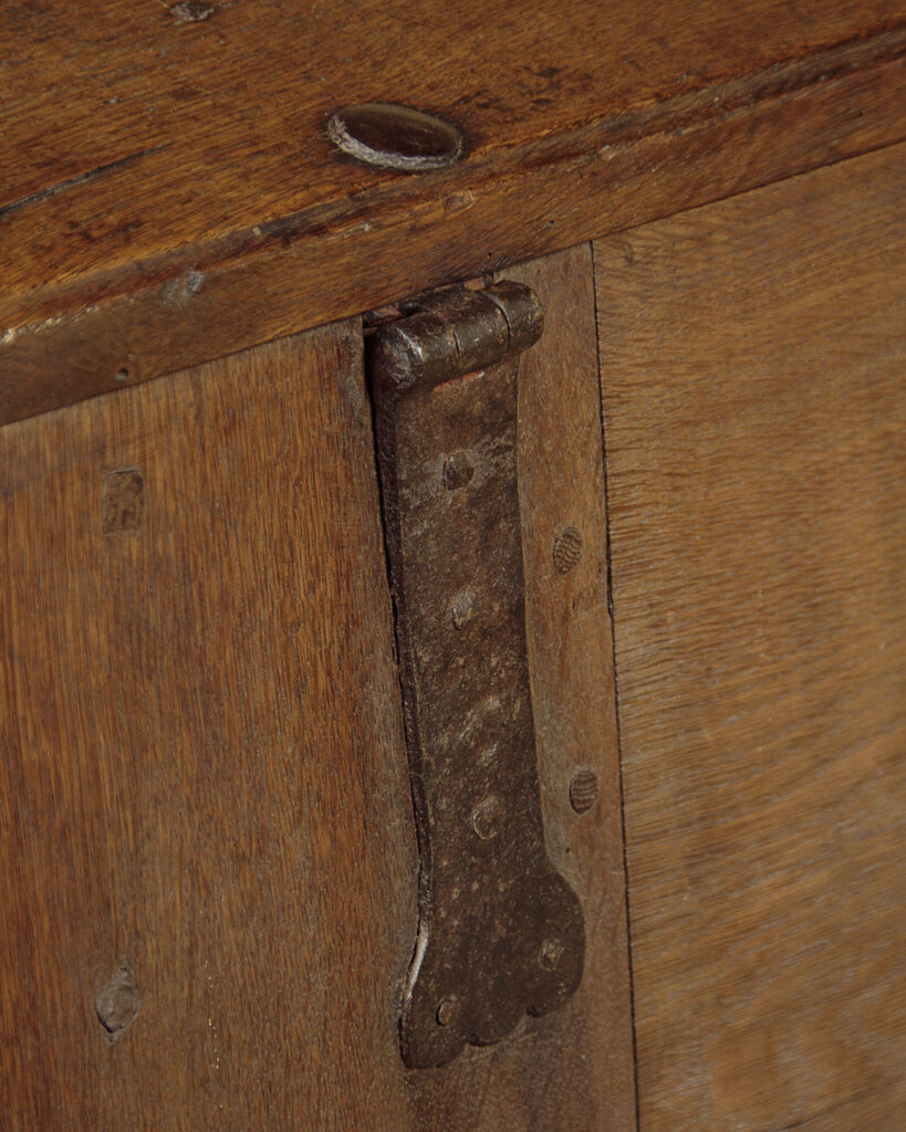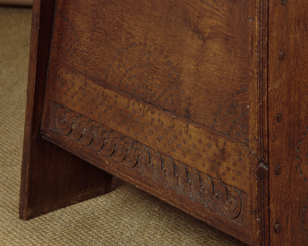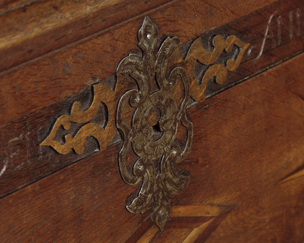Very large oak coffer or dower chest of Northern European or possibly Scandinavian origin dated 1744. Domed lid with a deep moulded edge on the original long iron strap hinges with decorative detail. Over a deep chest with flared sides a small lidded compartment to one side (which forms a stay for the main lid when open) and slim shelf along the rear edge. Good decorative front carved with the inscription Sencke Sarden Anno 1744 over parquetry inlaid devices in contrasting timbers. With a large pierced steel escutcheon plate, carved detail and a pattern of punched stars. Note how the carved and punched decoration continues on the broad flared stiles, the shape of which emphasises and accentuates the size and bulk of the chest to impressive effect. More punched decoration to the sides and a lovely carved guilloche frieze along the bottom edge. Oak back and floor boards. Excellent original colour and condition, cleaned and waxed in our workshops.