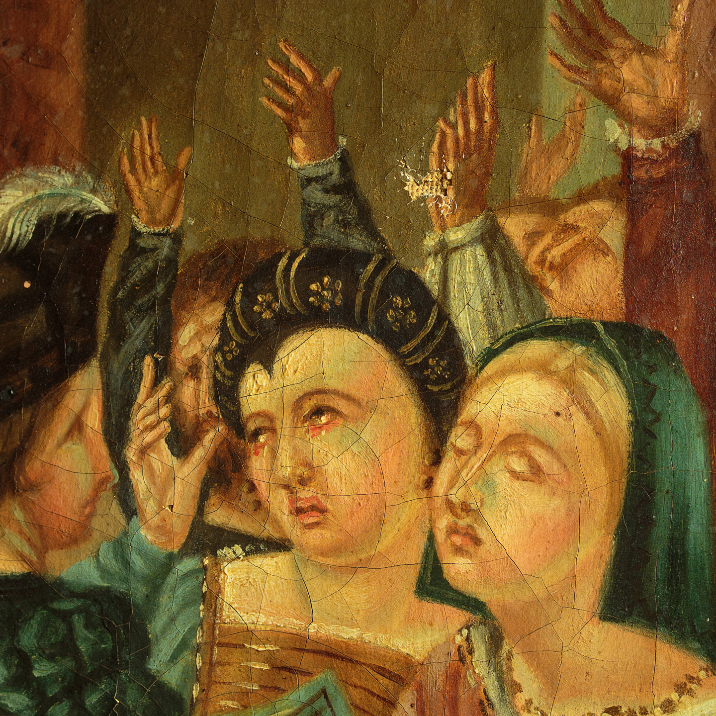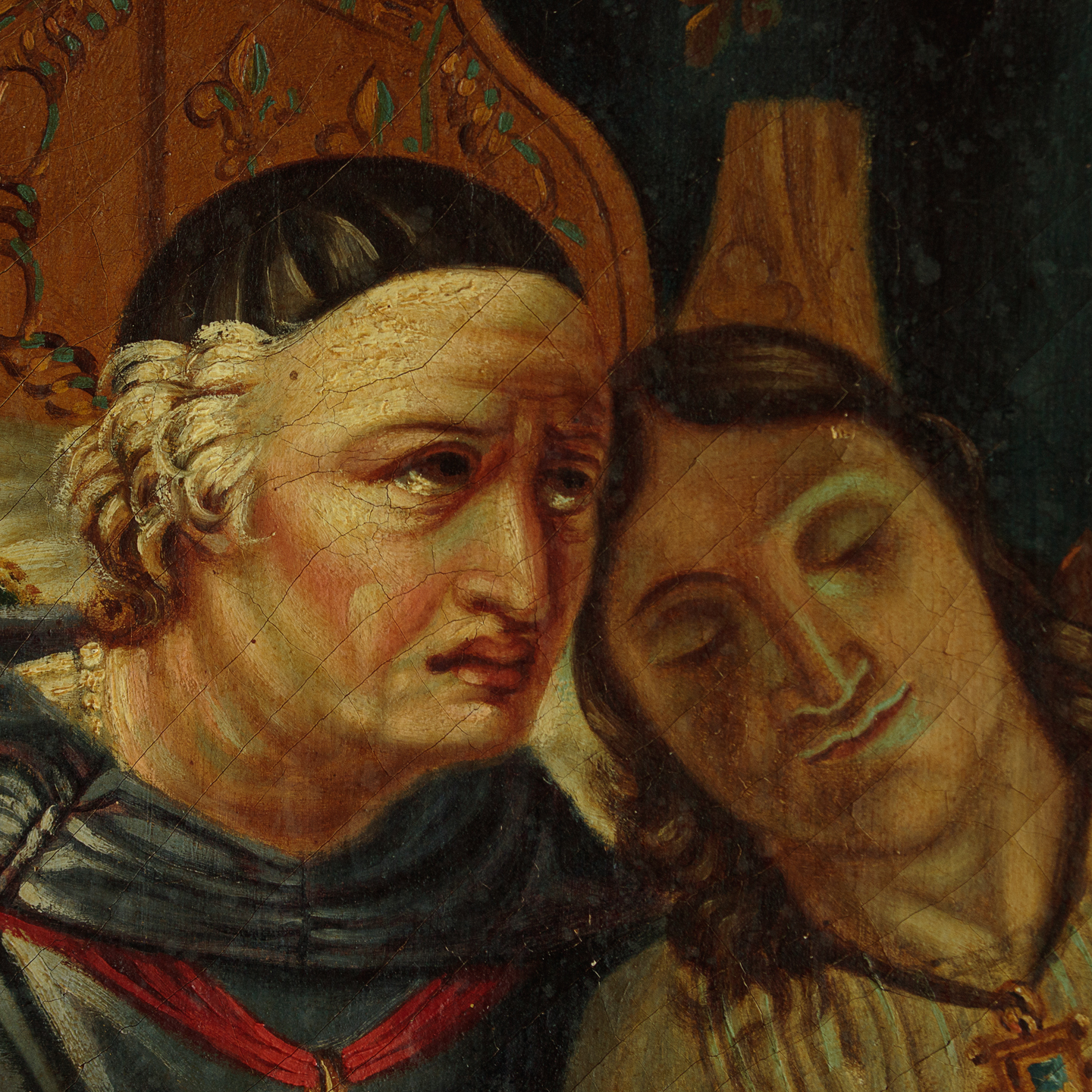 Large oil painting of the death of King Louis XII of France after the original by the acclaimed French history painter Merry-Joseph Blondel (1781-1853) c.1900. The King lies dying in a bed surrounded with drapes carrying the Fleur de Lis emblem of French royalty, with his crown and the Main de Justice sceptre by his side. With the help of a priest he bestows his blessing on a young prince, presumably his successor Francis I, whilst other grieving knights and noblemen stand at the foot of the bed. In the background, below Gothic arches, stand a group of grieving women and the common people, their hands raised in prayer for a popular king known as 'The Father of the People'. Well painted in oil on canvas. With some areas of damage but all away from the faces. Presented in the original giltwood and gesso frame which is in good condition.