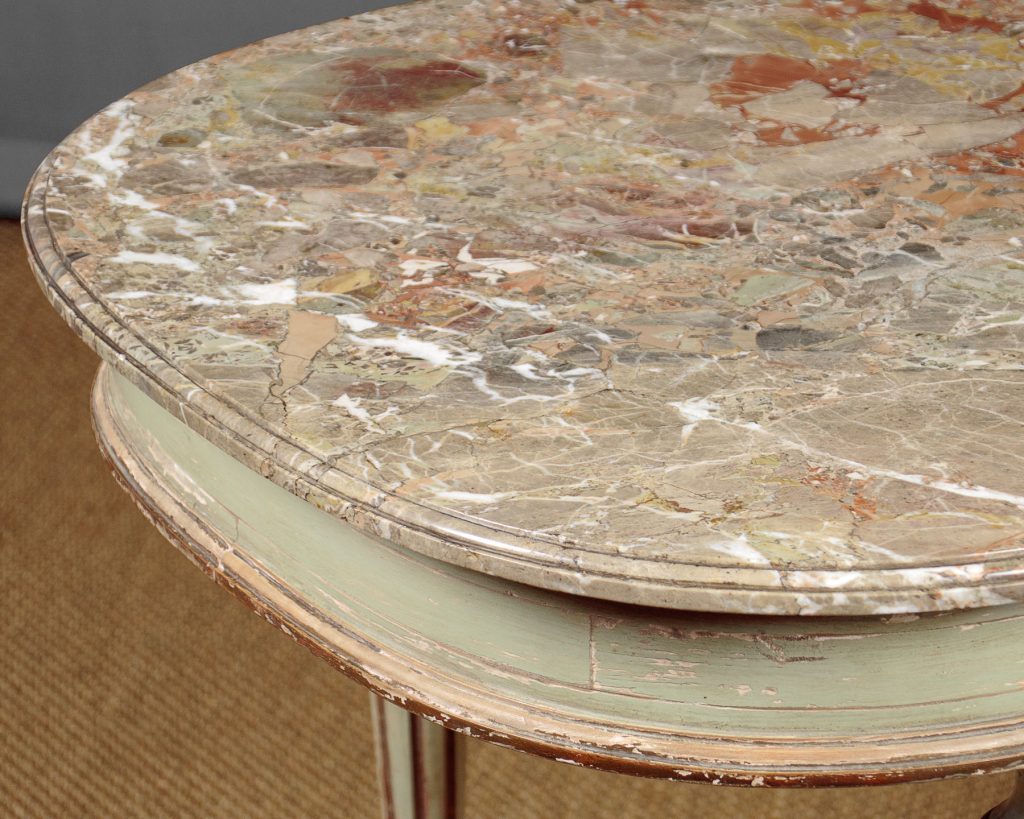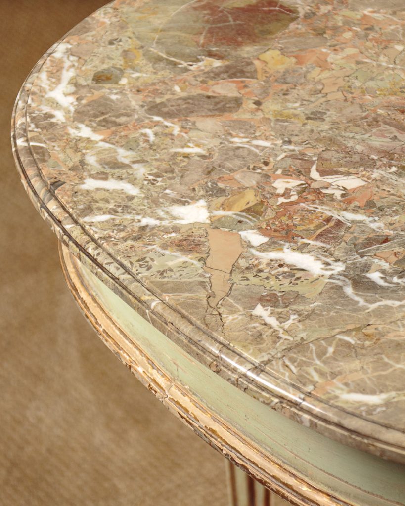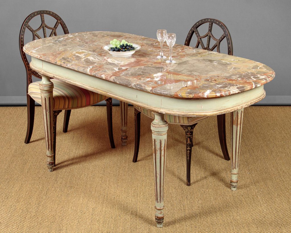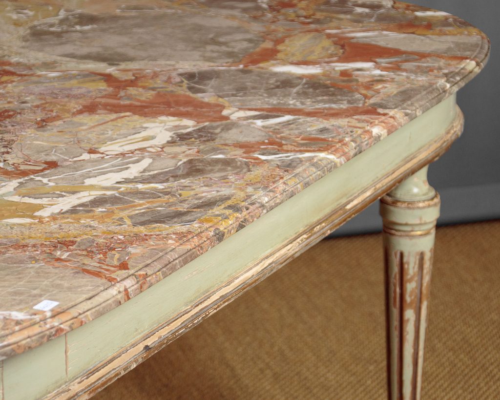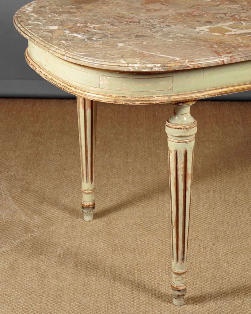 French Louis XVI style marble top centre or dining table c.1930. Spectacular marble table top with rounded ends and a thumb moulded edge. On a distressed painted pine base with a straight apron and tapering, turned and fluted legs. Original pale duck egg blue paint with the mouldings and flutes highlighted in gold. With a crack across the marble, repaired and well disguised in the figuring and reinforced with wooden bearers on the underside. Obvious old wear to the paintwork, otherwise excellent condition, solid and sturdy, cleaned and waxed in our workshops.
