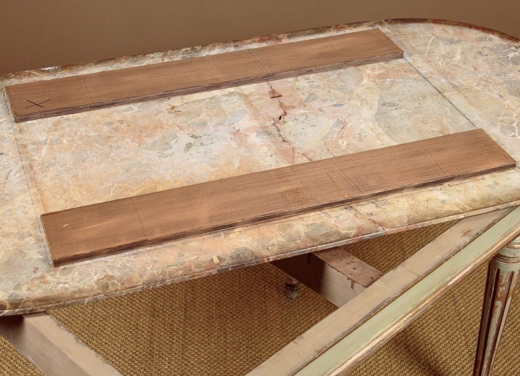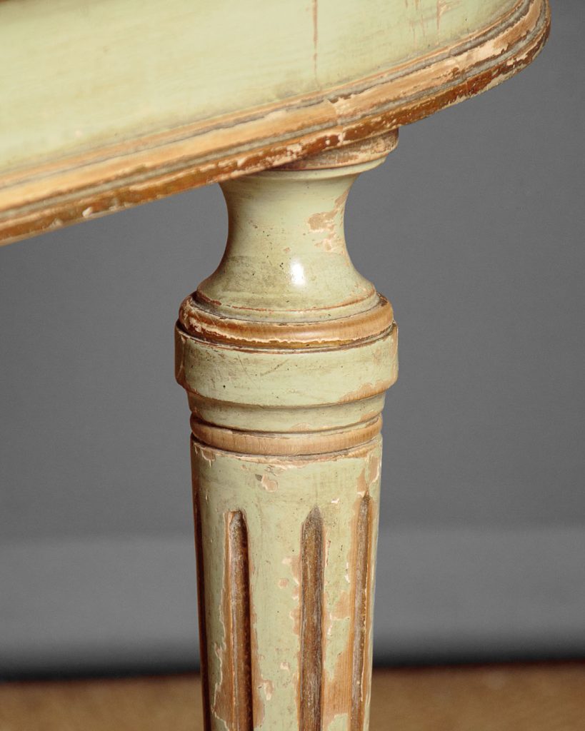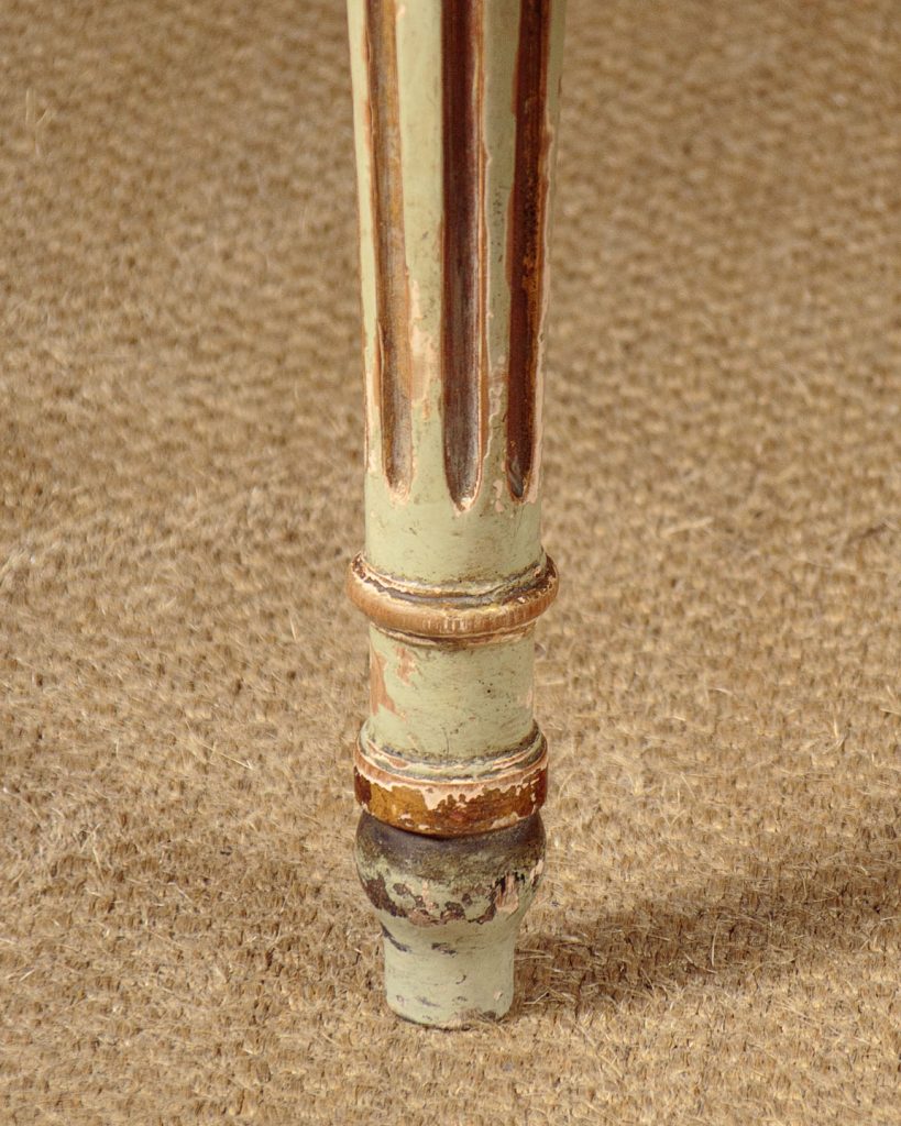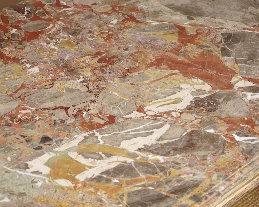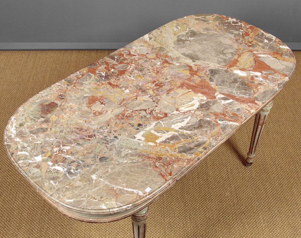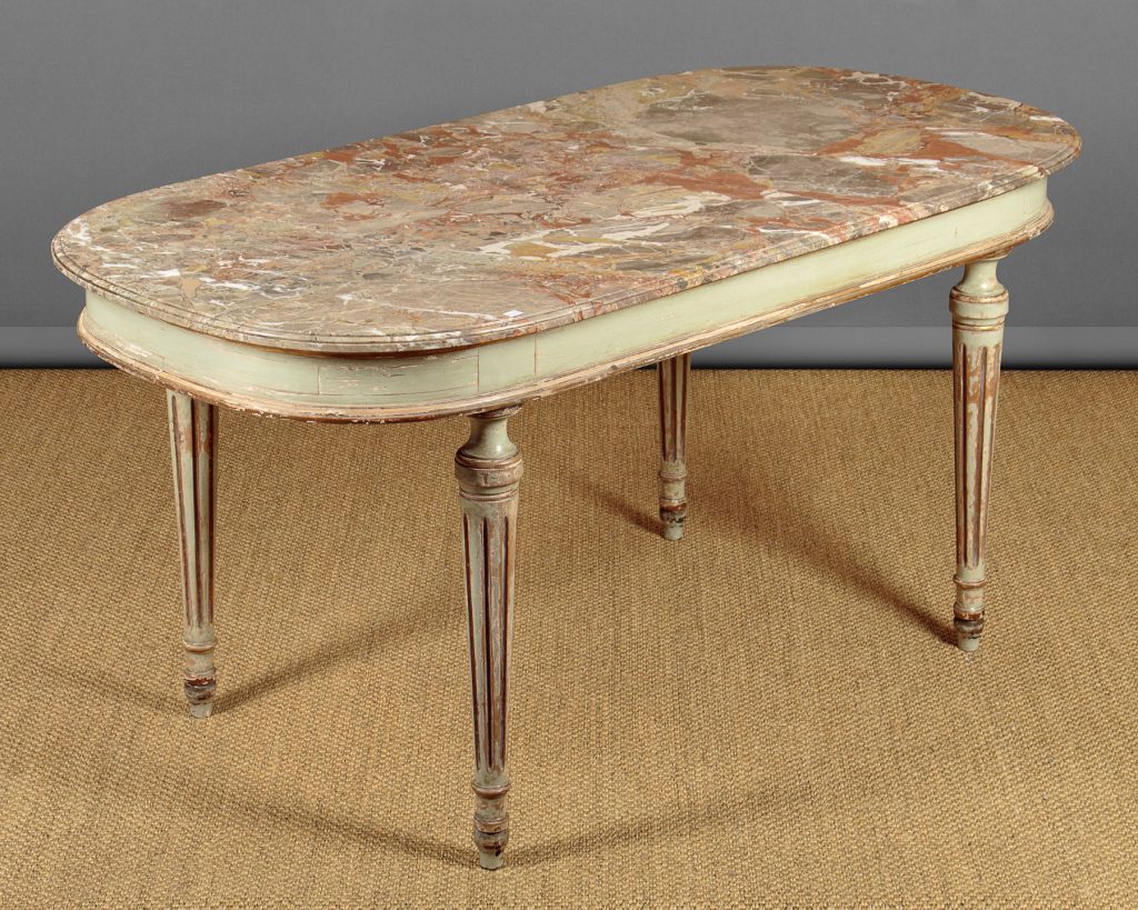 French Louis XVI style marble top centre or dining table c.1930. Spectacular marble table top with rounded ends and a thumb moulded edge. On a distressed painted pine base with a straight apron and tapering, turned and fluted legs. Original pale duck egg blue paint with the mouldings and flutes highlighted in gold. With a crack across the marble, repaired and well disguised in the figuring and reinforced with wooden bearers on the underside. Obvious old wear to the paintwork, otherwise excellent condition, solid and sturdy, cleaned and waxed in our workshops.