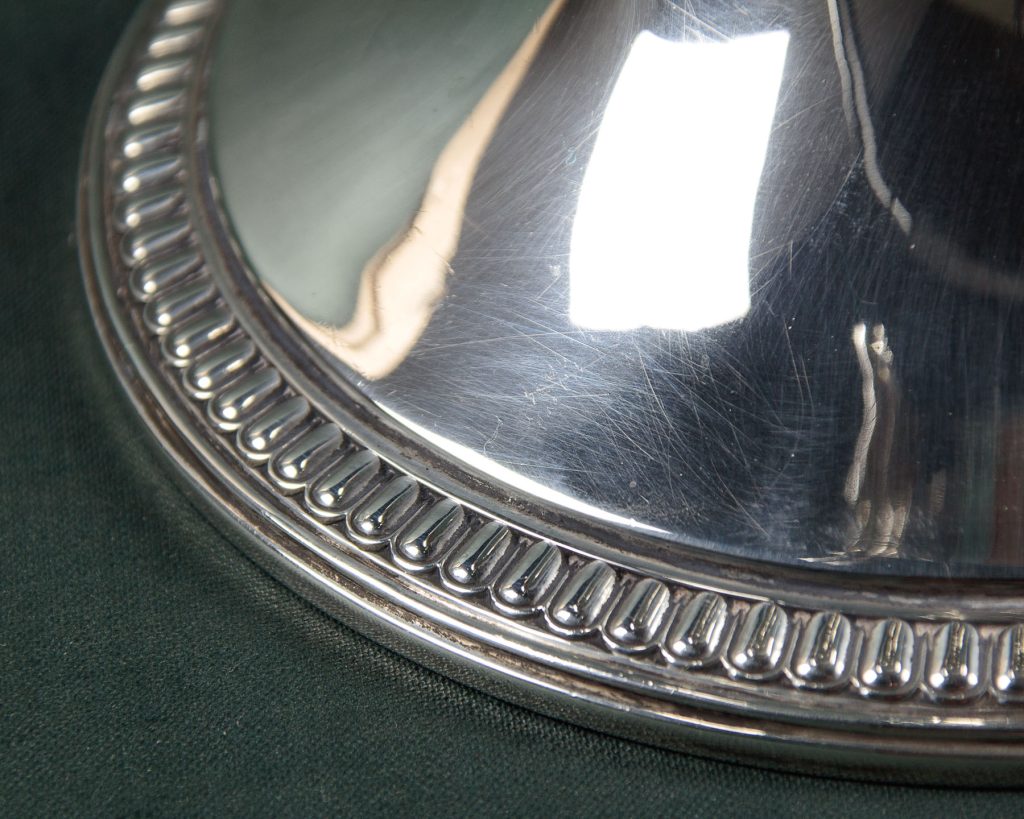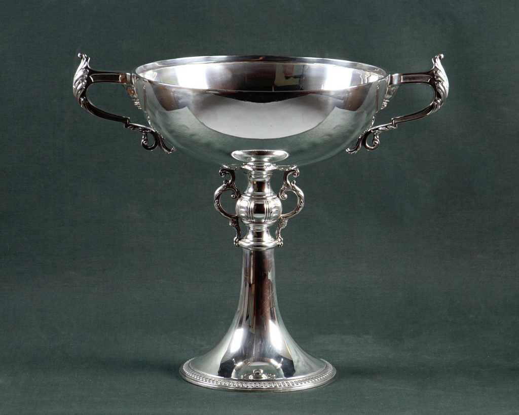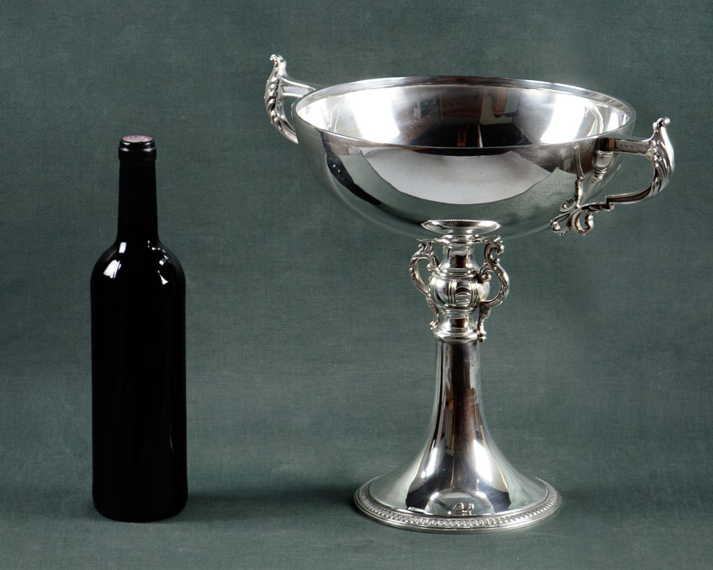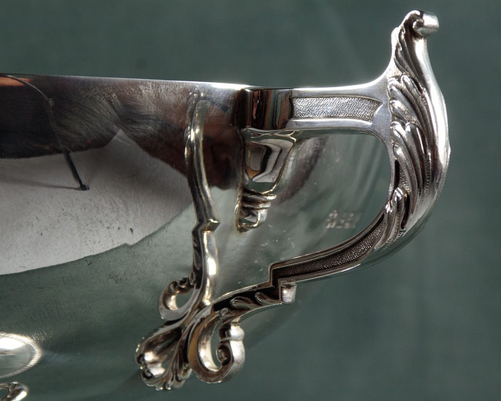 Very impressive solid silver tazza by the Birmingham makers Elkington & Co. dated 1966. Neo-Classical tazza standing over 13" tall, featuring a 10½" diameter bowl with pierced handles with acanthus detail. Raised on a segmented stem with applied and decorated brackets and a flared base with gadroon moulding. With a clear set of hallmarks to the outside of the bowl. Some scratches and small dents to the bowl. Otherwise excellent condition. Weight 69oz/2140g.