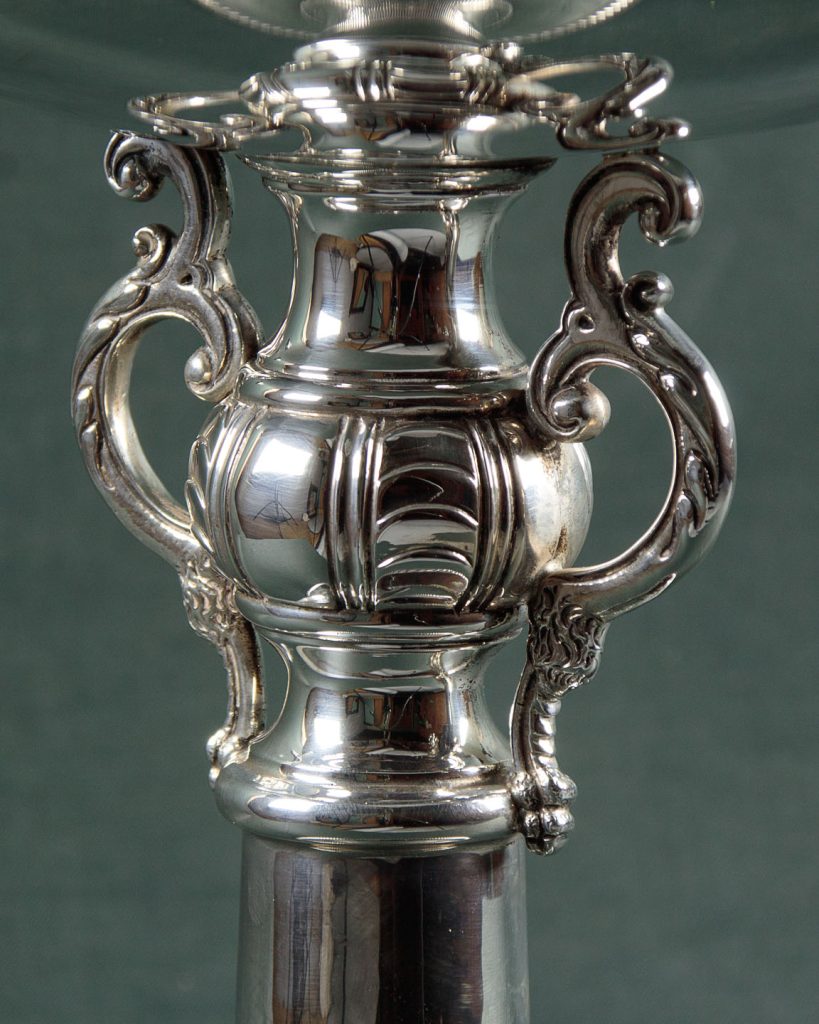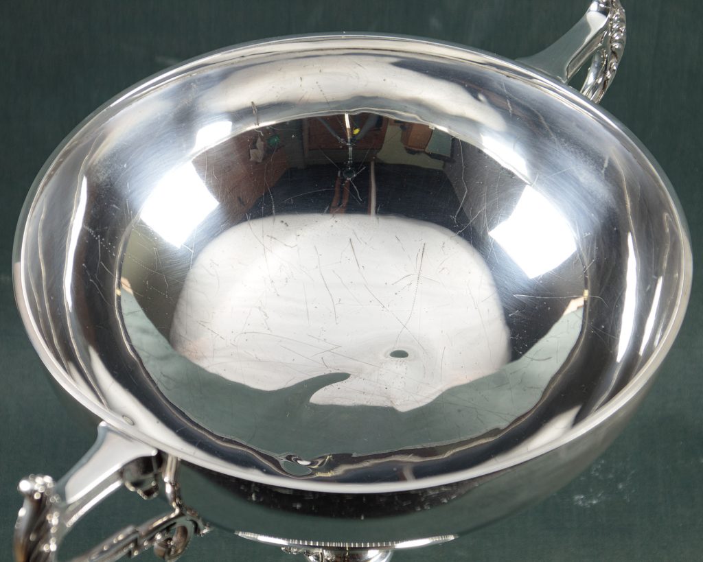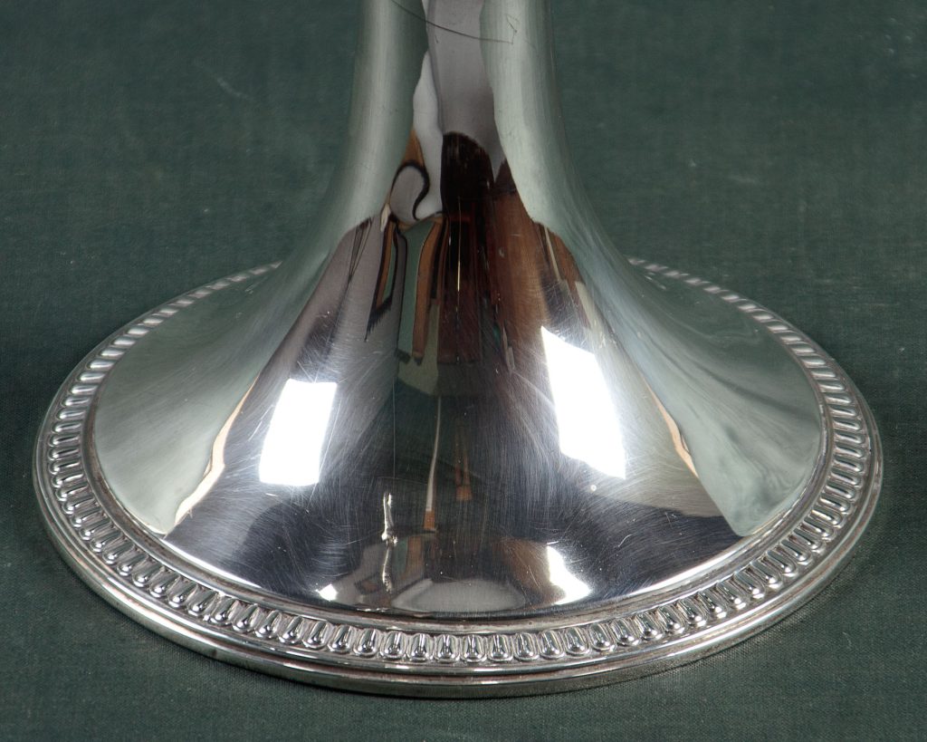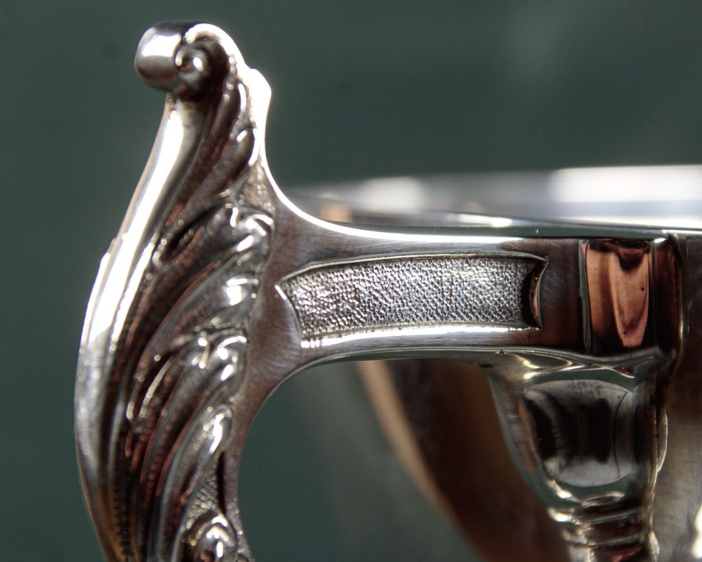 Very impressive solid silver tazza by the Birmingham makers Elkington & Co. dated 1966. Neo-Classical tazza standing over 13" tall, featuring a 10½" diameter bowl with pierced handles with acanthus detail. Raised on a segmented stem with applied and decorated brackets and a flared base with gadroon moulding. With a clear set of hallmarks to the outside of the bowl. Some scratches and small dents to the bowl. Otherwise excellent condition. Weight 69oz/2140g.