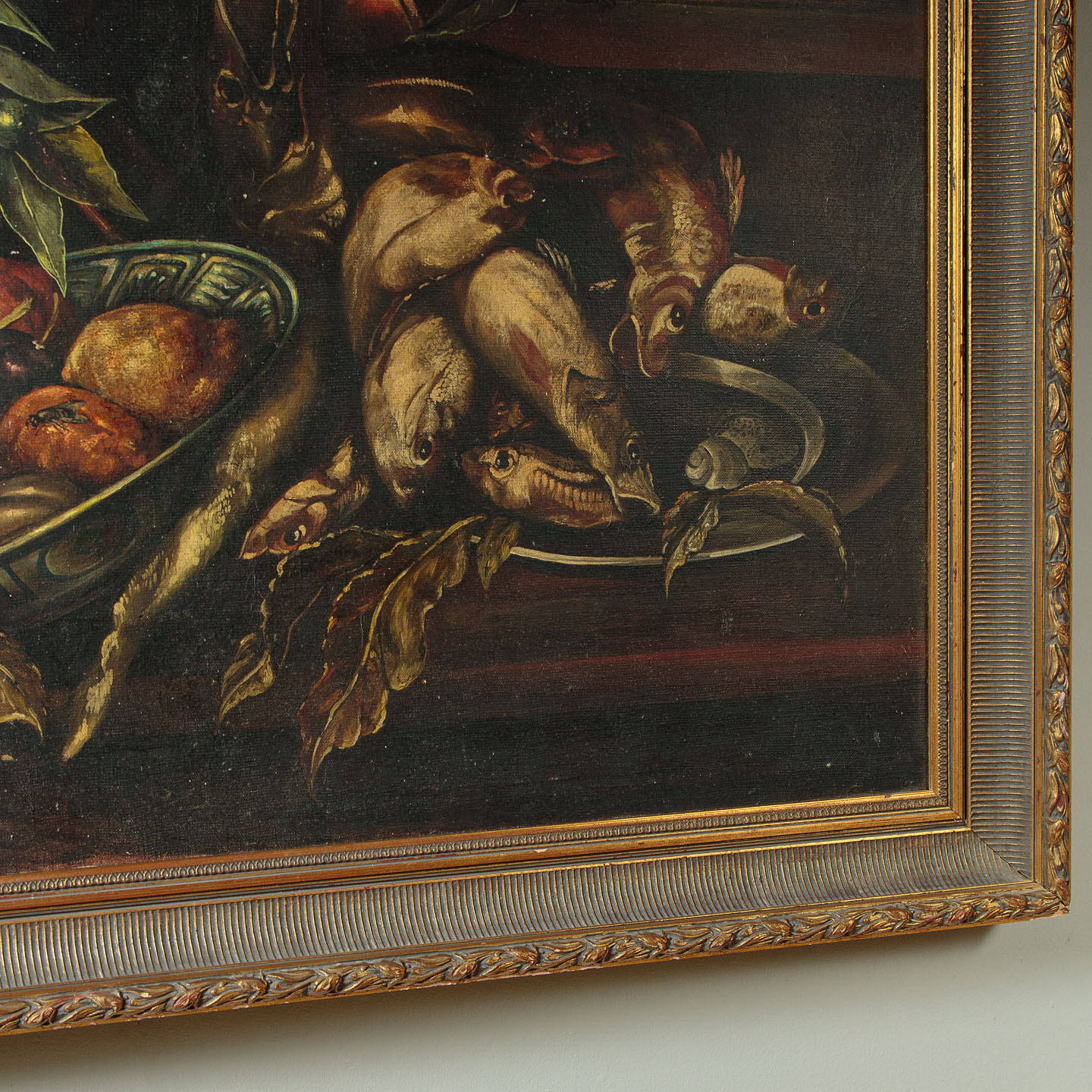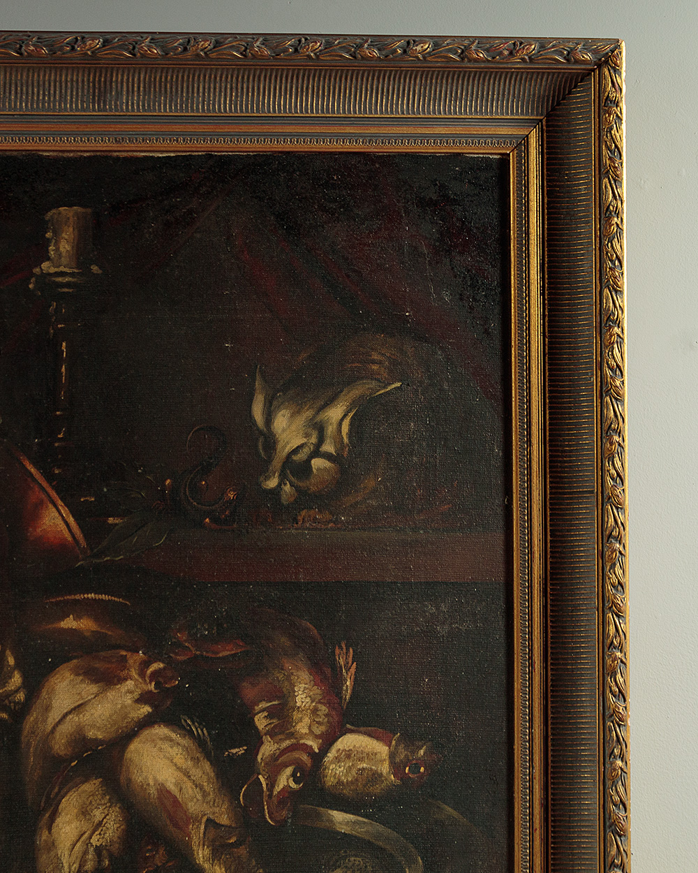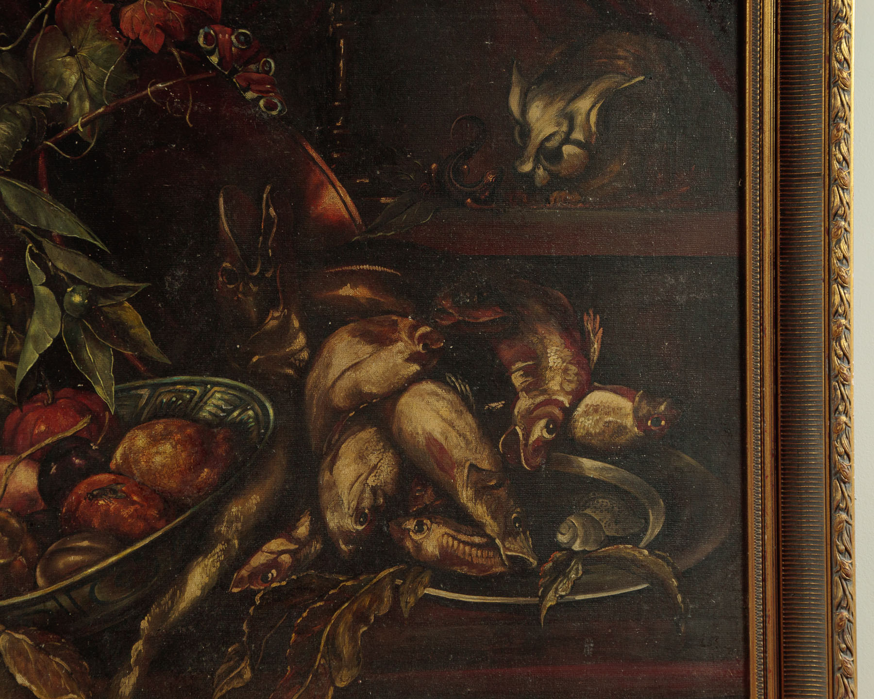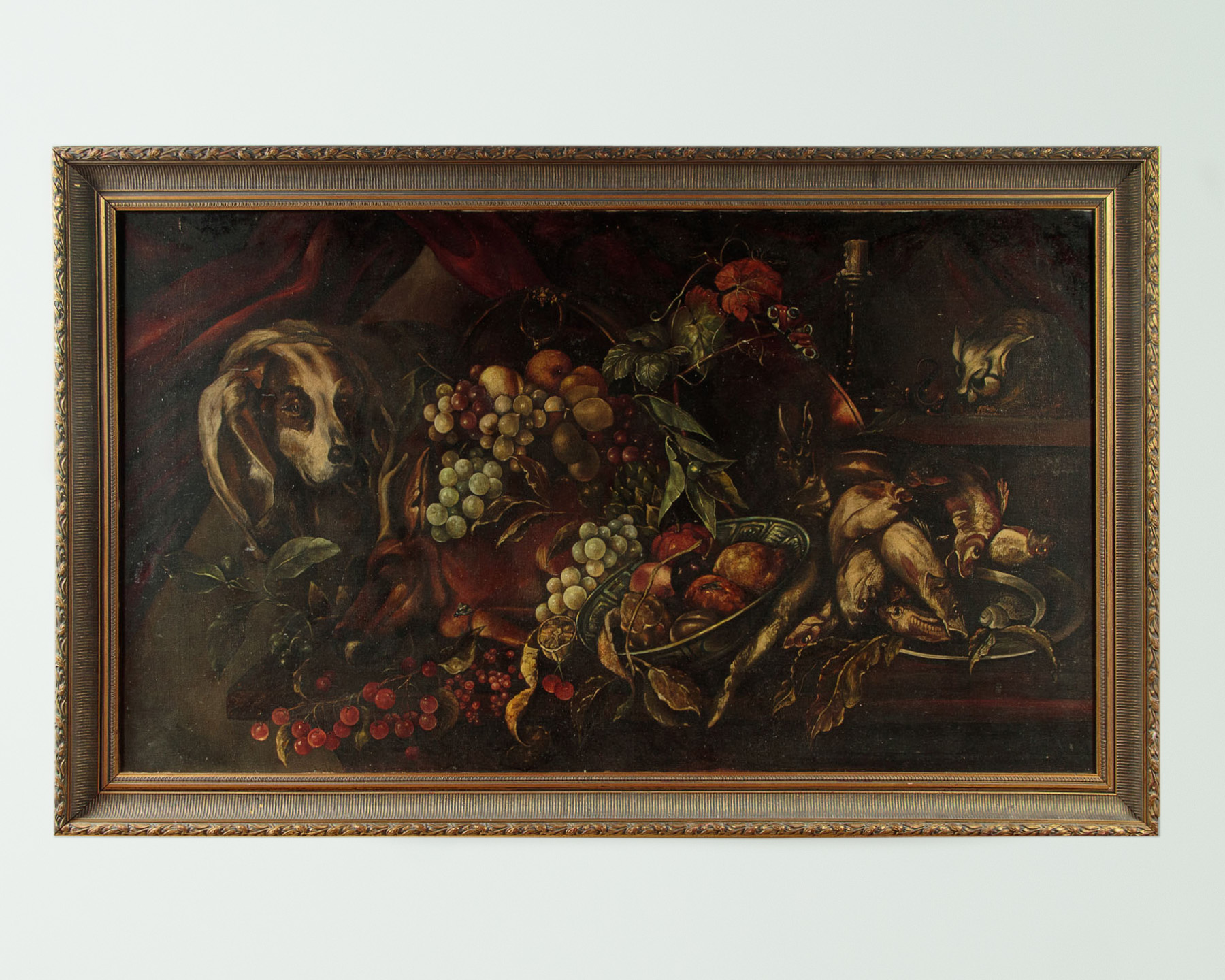 Unusually large style still life oil painting on canvas. 63" x 36" canvas. An 18th.c. style still life composition of a stag's head, fish, various fruits and grapes. A dog overlooks the scene at the left hand side whilst a cat toys with a lizard on a shelf in the upper left hand corner. Note also a couple of flies and the peacock butterfly which have settled on the scene. Presented in a gilded and moulded wooden frame. Good condition.