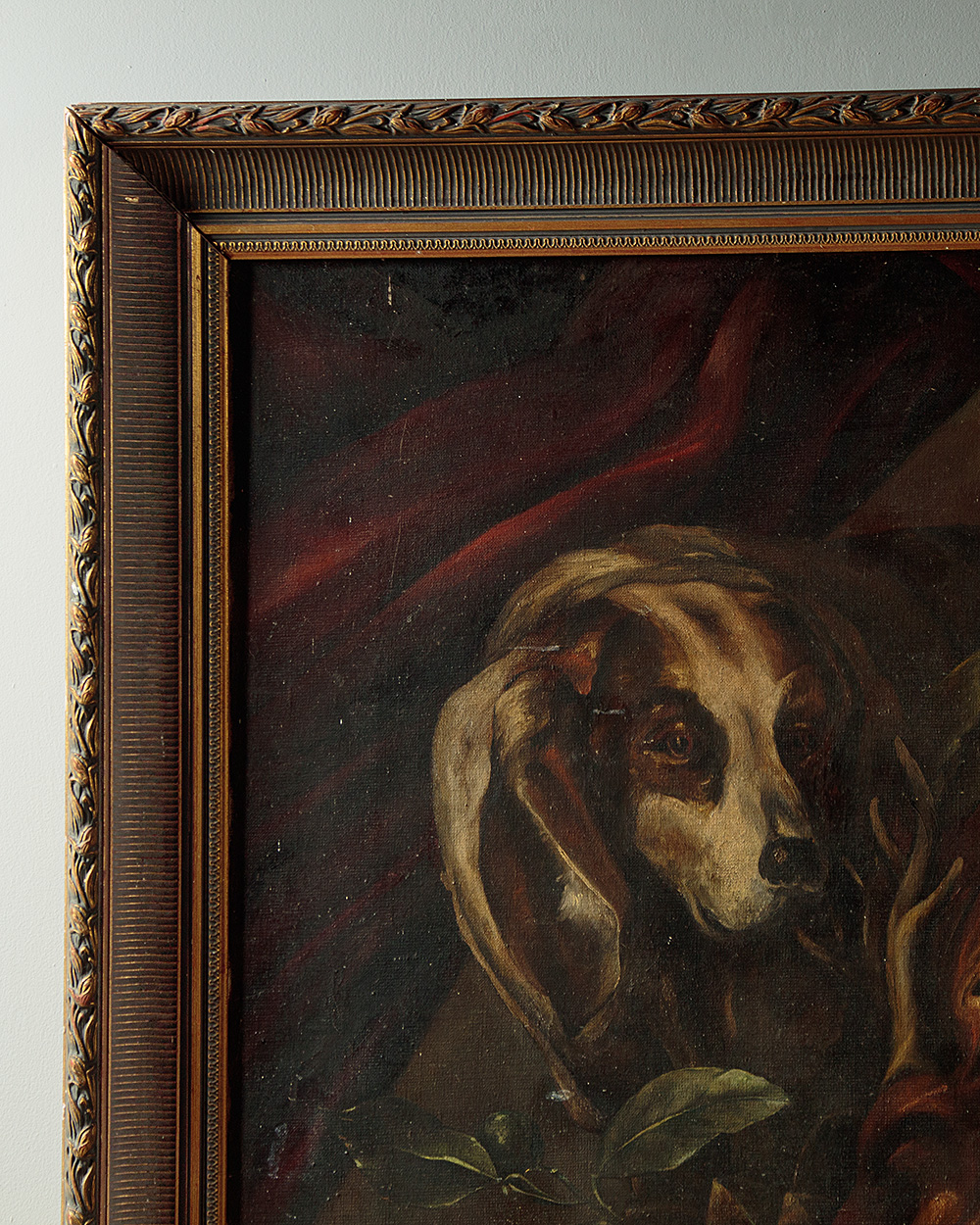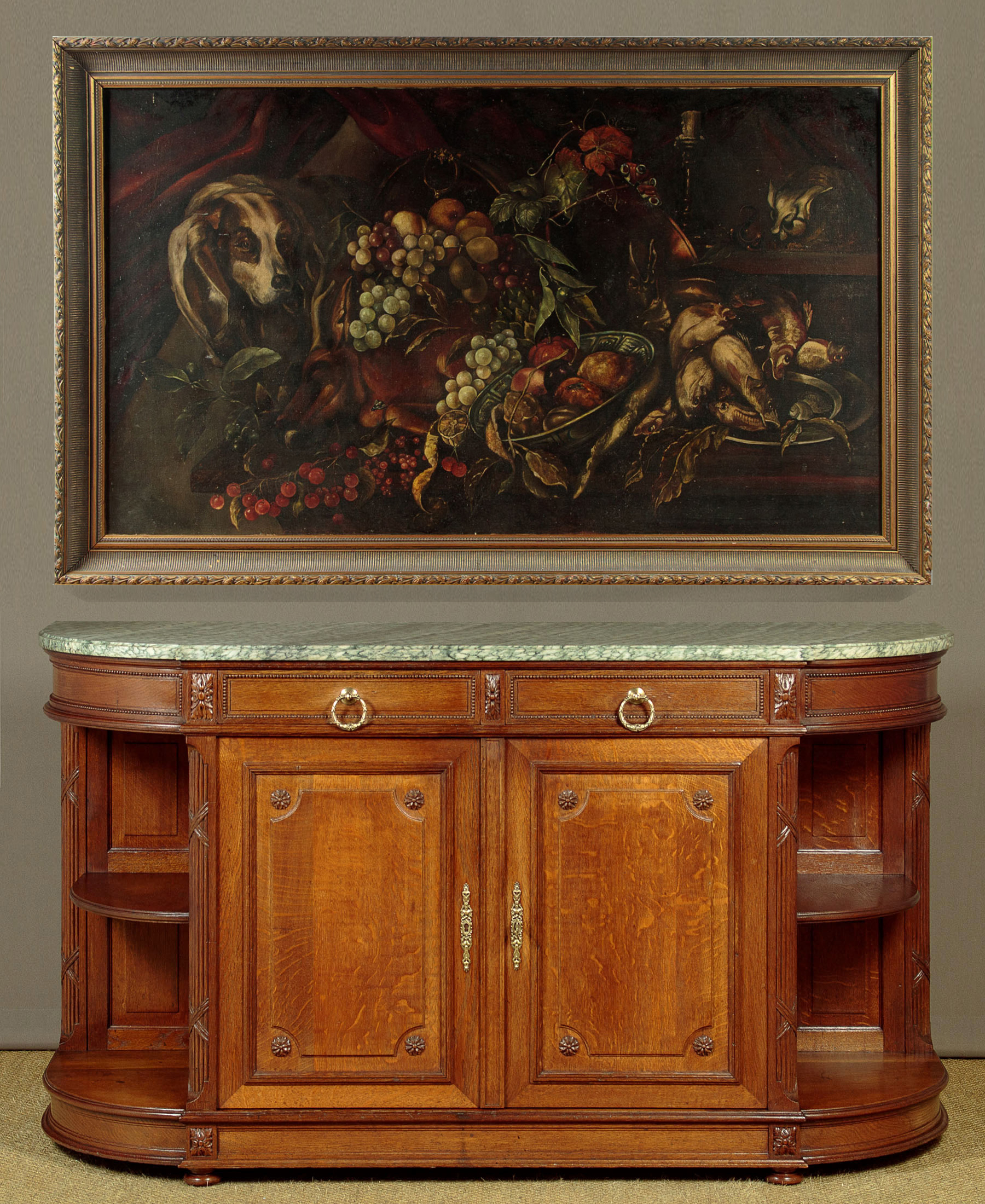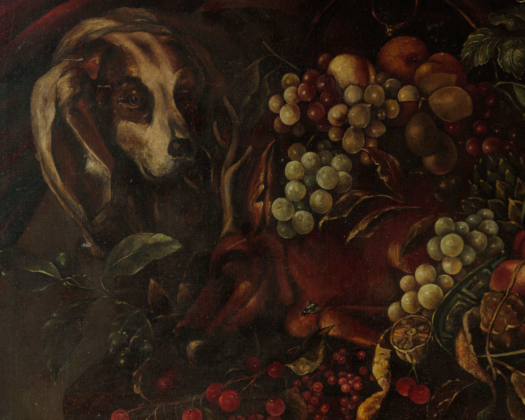 Unusually large style still life oil painting on canvas. 63" x 36" canvas. An 18th.c. style still life composition of a stag's head, fish, various fruits and grapes. A dog overlooks the scene at the left hand side whilst a cat toys with a lizard on a shelf in the upper left hand corner. Note also a couple of flies and the peacock butterfly which have settled on the scene. Presented in a gilded and moulded wooden frame. Good condition.